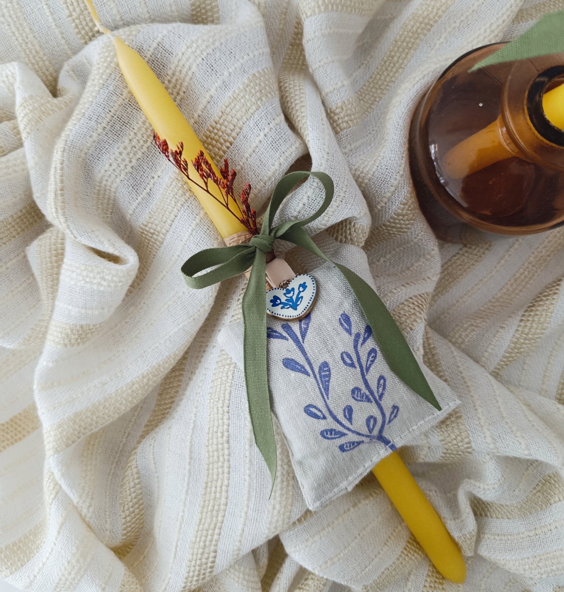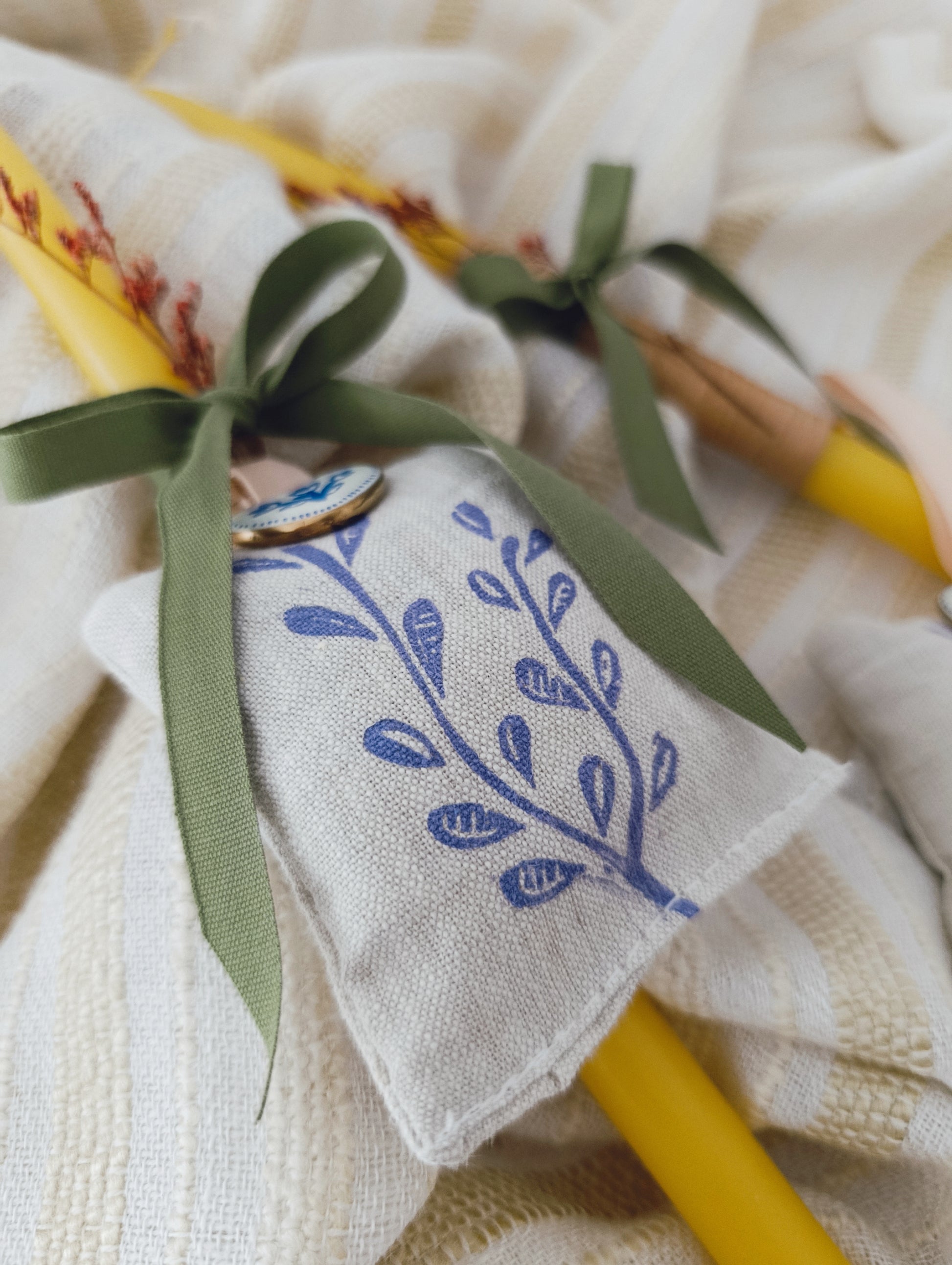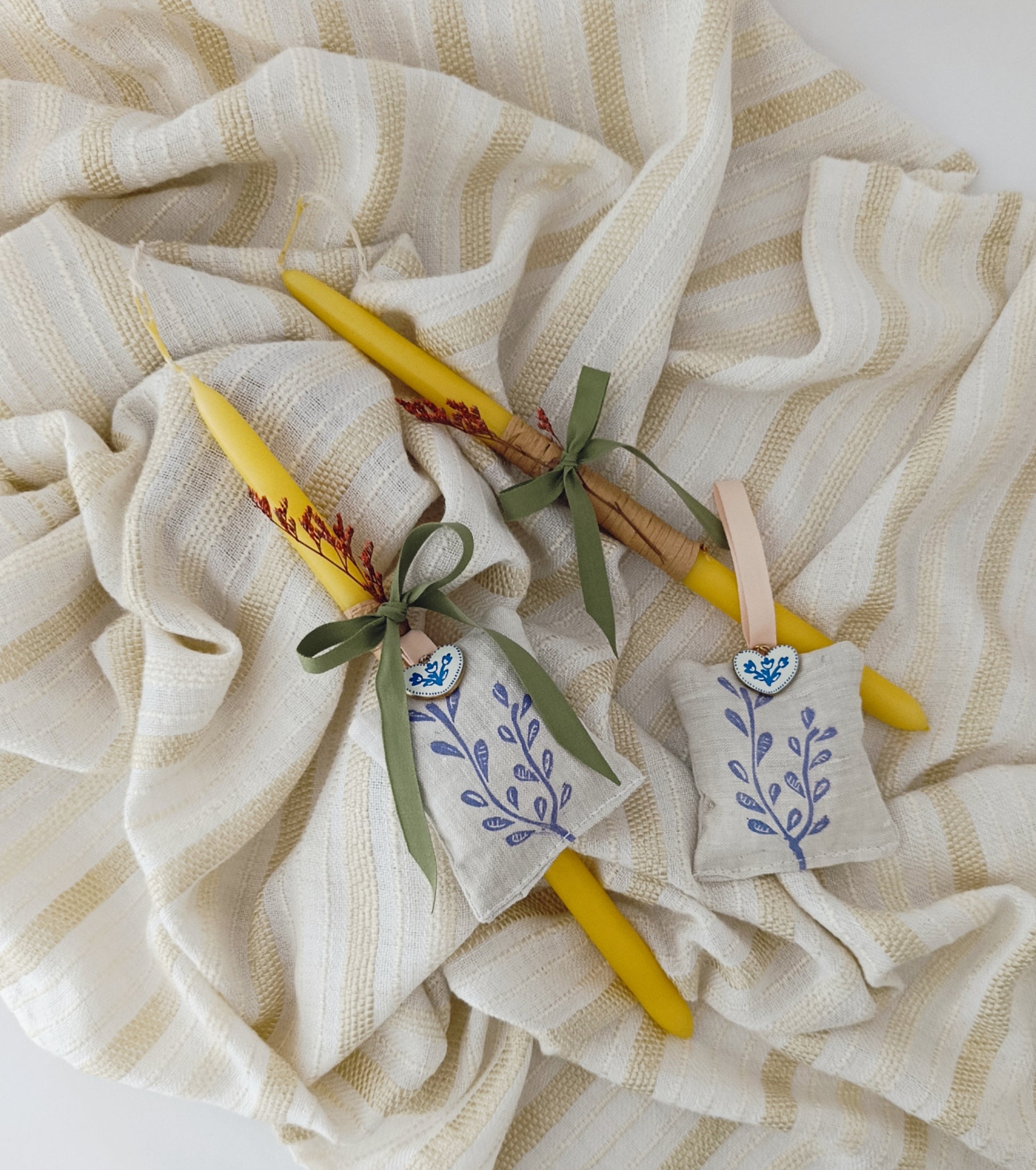 Το φανταστικό, λαδί κερί έχει διακοσμηθεί με αποξηραμένα λουλούδια και όμορφη κορδέλα, ενώ το λινό πουγκάκι είναι τυπωμένο στο χέρι με ένα κομψό, ανοιξιάτικο χαρακτικό. Το πουγκάκι είναι γεμισμένο με λεβάντα, έτοιμο να το κρεμάσεις και να μοσχομυρίσει ο χώρος.