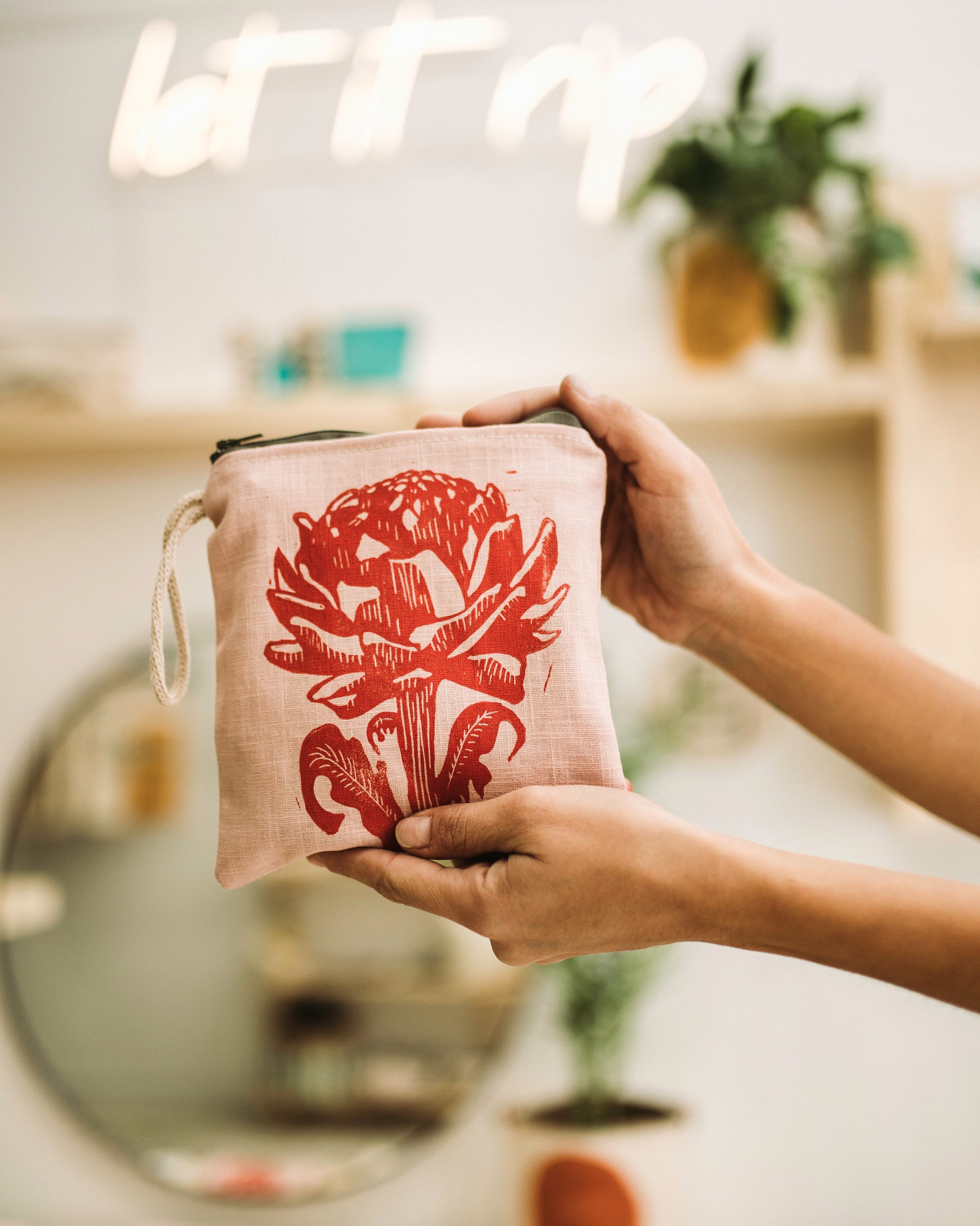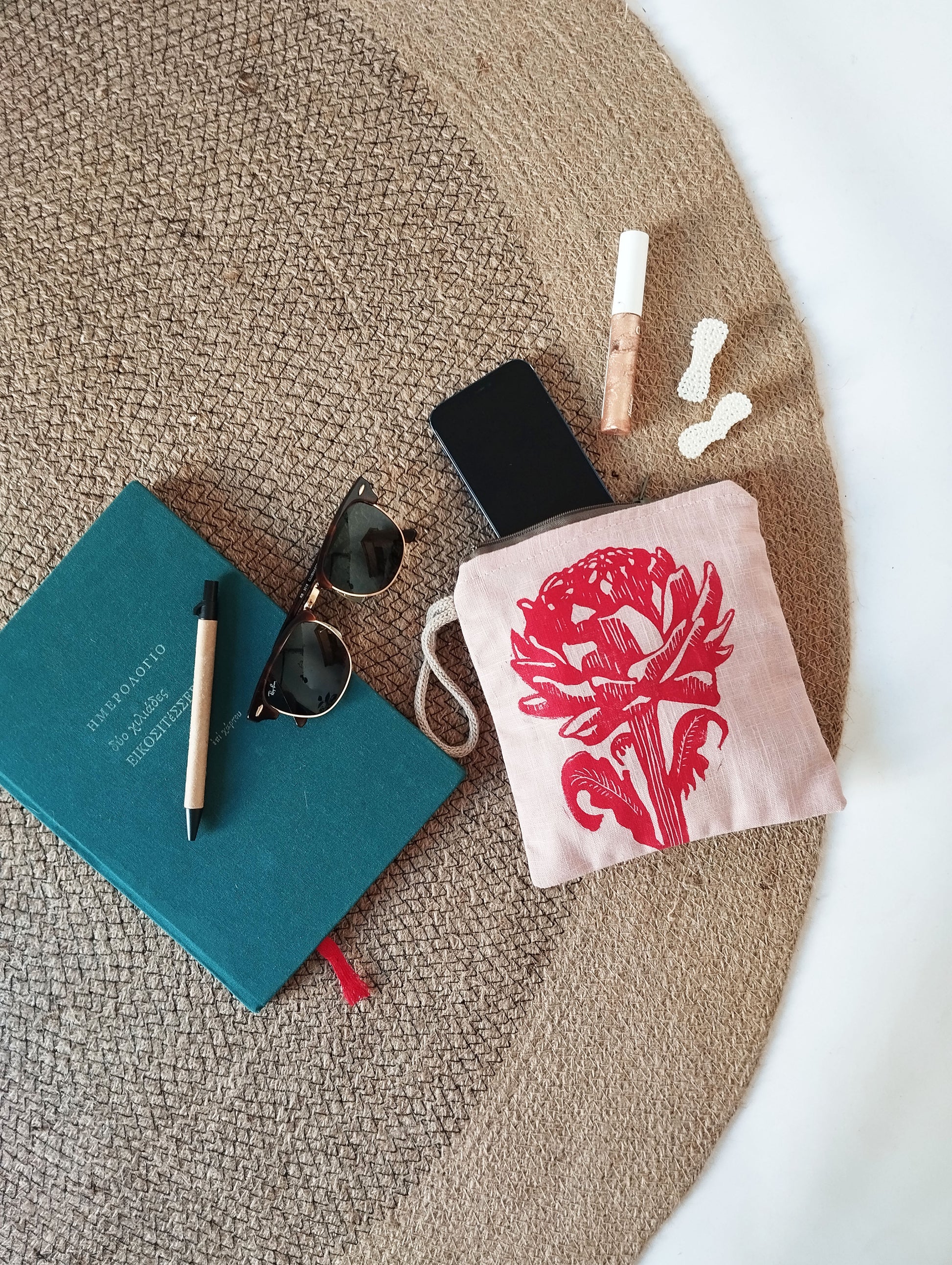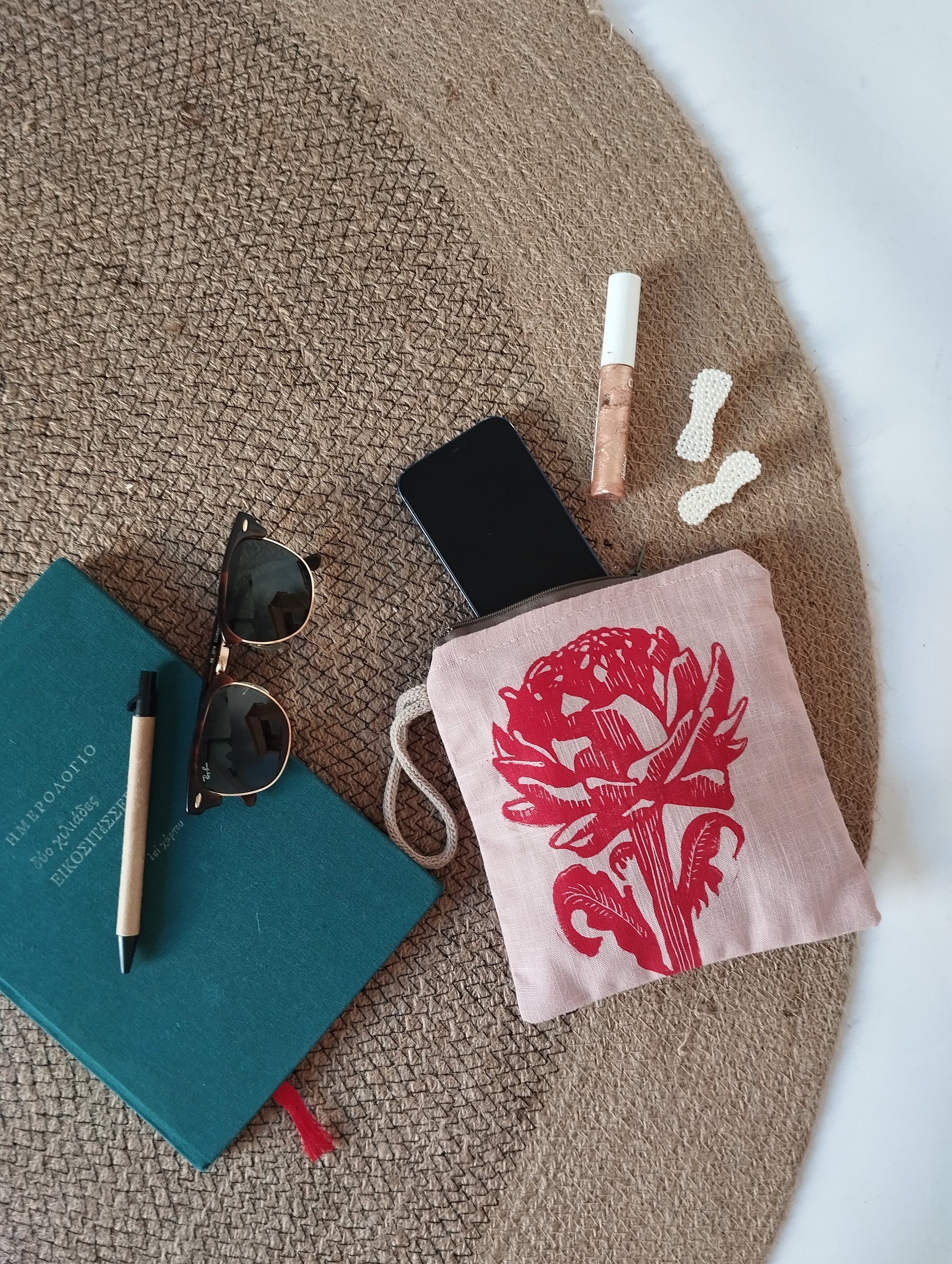 This Artichoke Purse is made from a beatiful dusty-pink linen fabric, designed to withstand daily usage while still maintaining its vibrant colors and intricate design. The artichoke is printed entirely by hand in a vibrant red color. Τhe olive green zipper ensures that your belongings are secure, while the organic rope allows for versatile carrying options.
