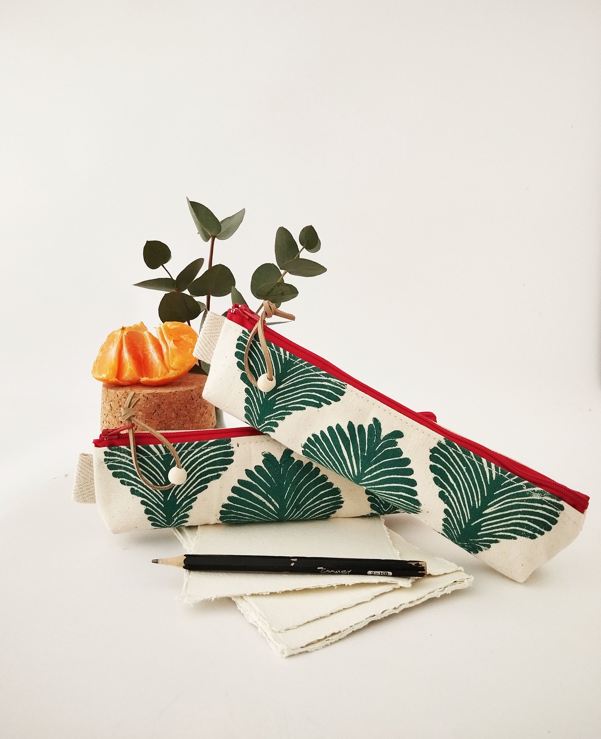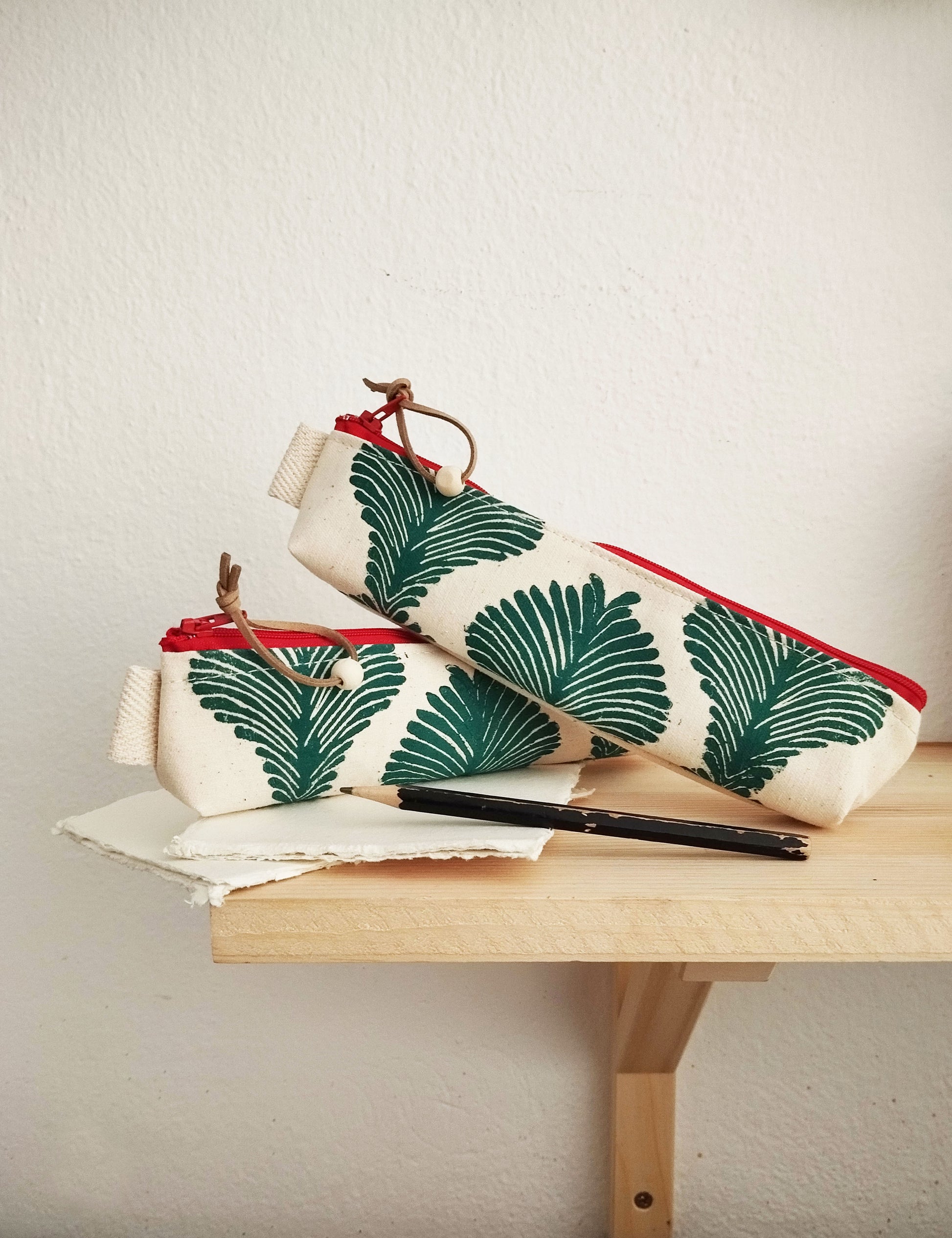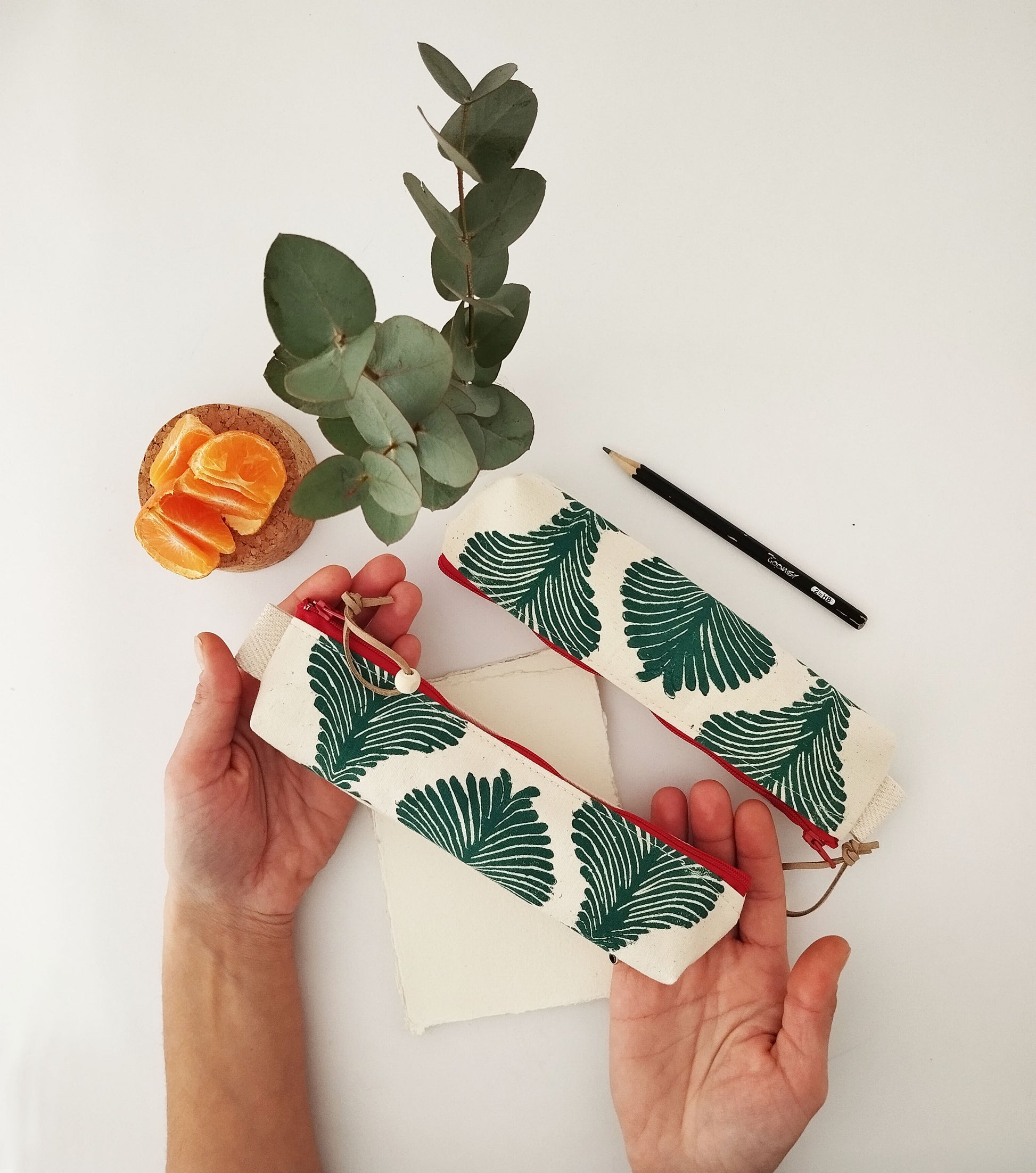 The bold, art deco-inspired motif is entirely block printed by hand, so each one of these pencil cases is as unique as it can be.
