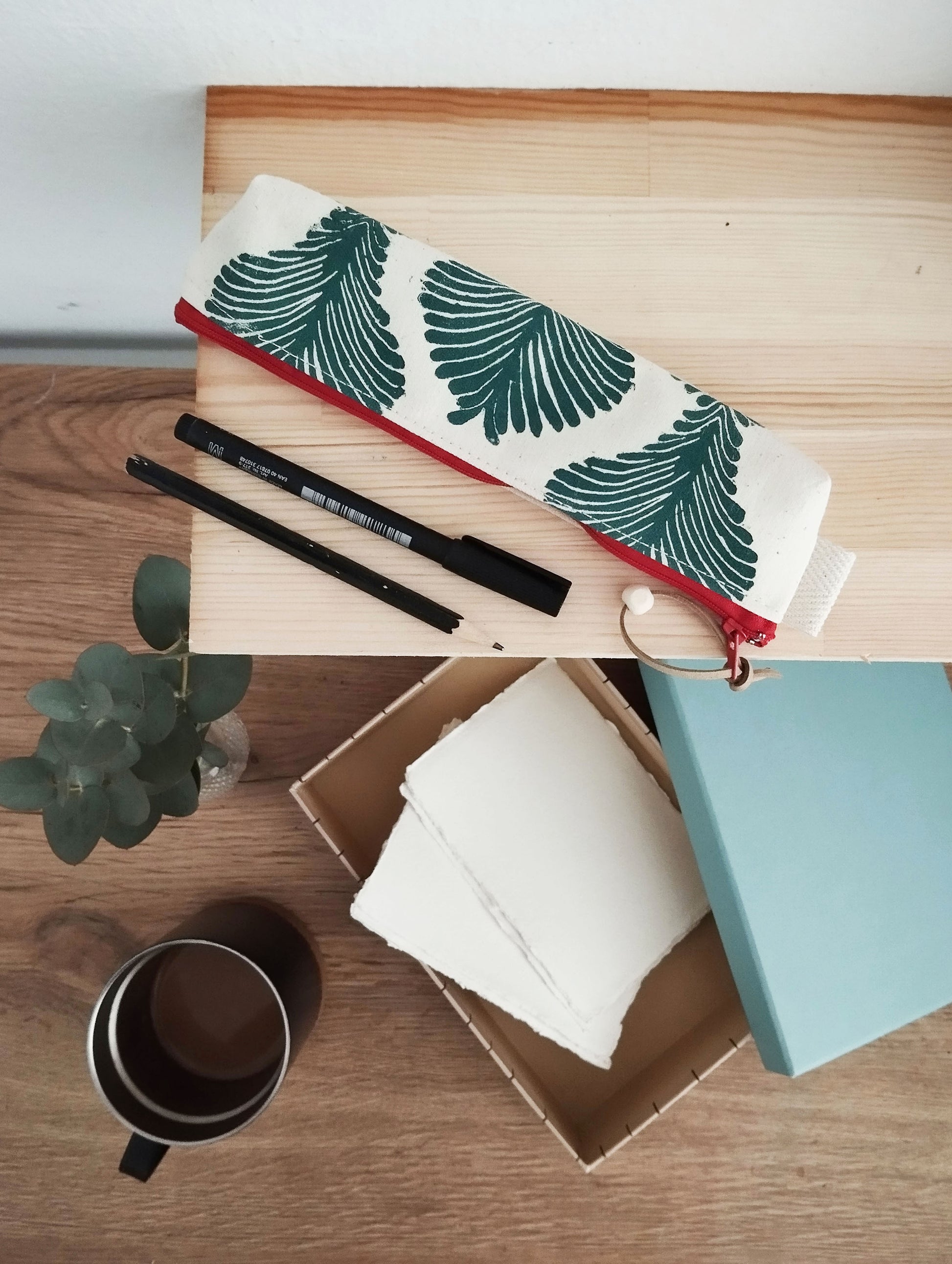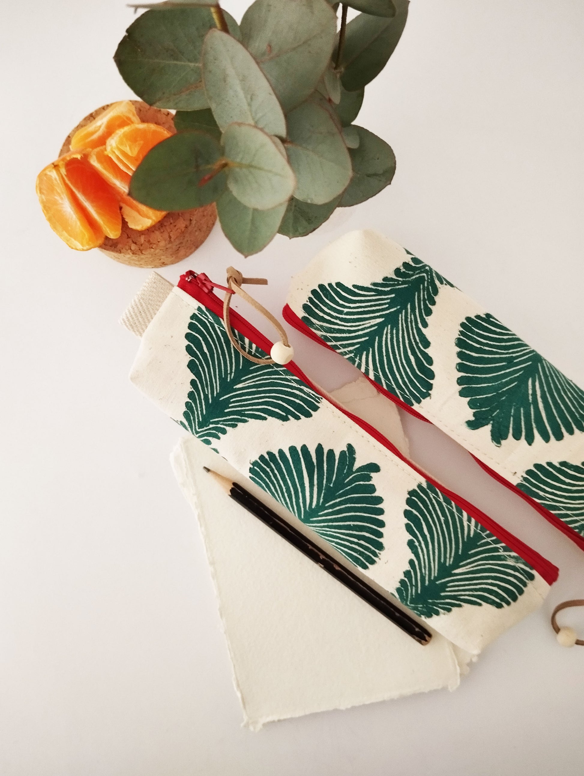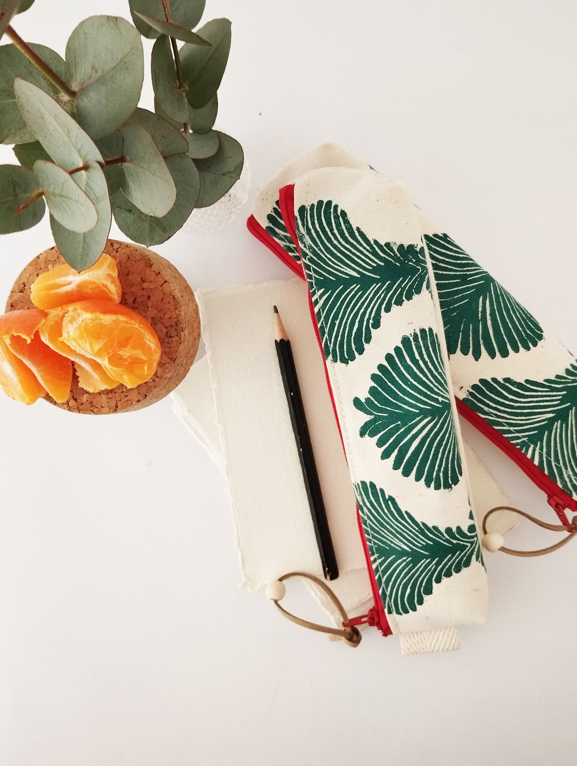 The bold, art deco-inspired motif is entirely block printed by hand, so each one of these pencil cases is as unique as it can be.