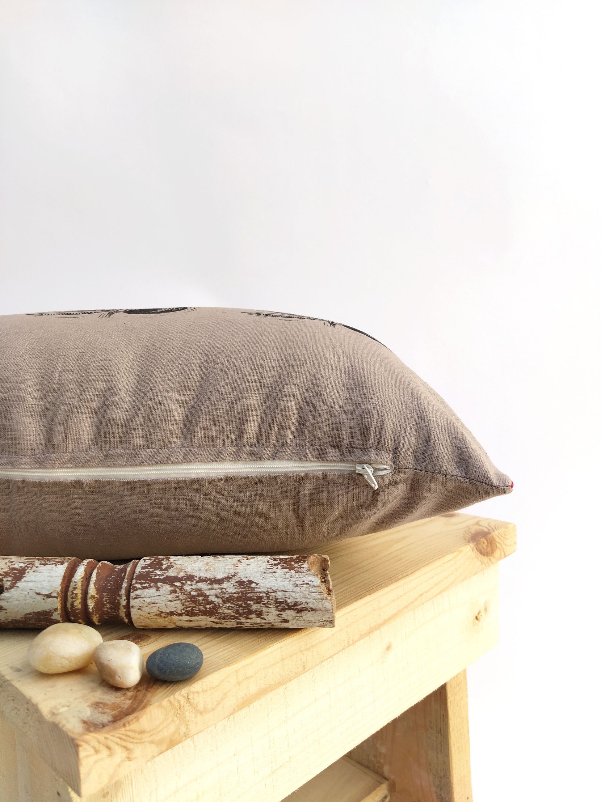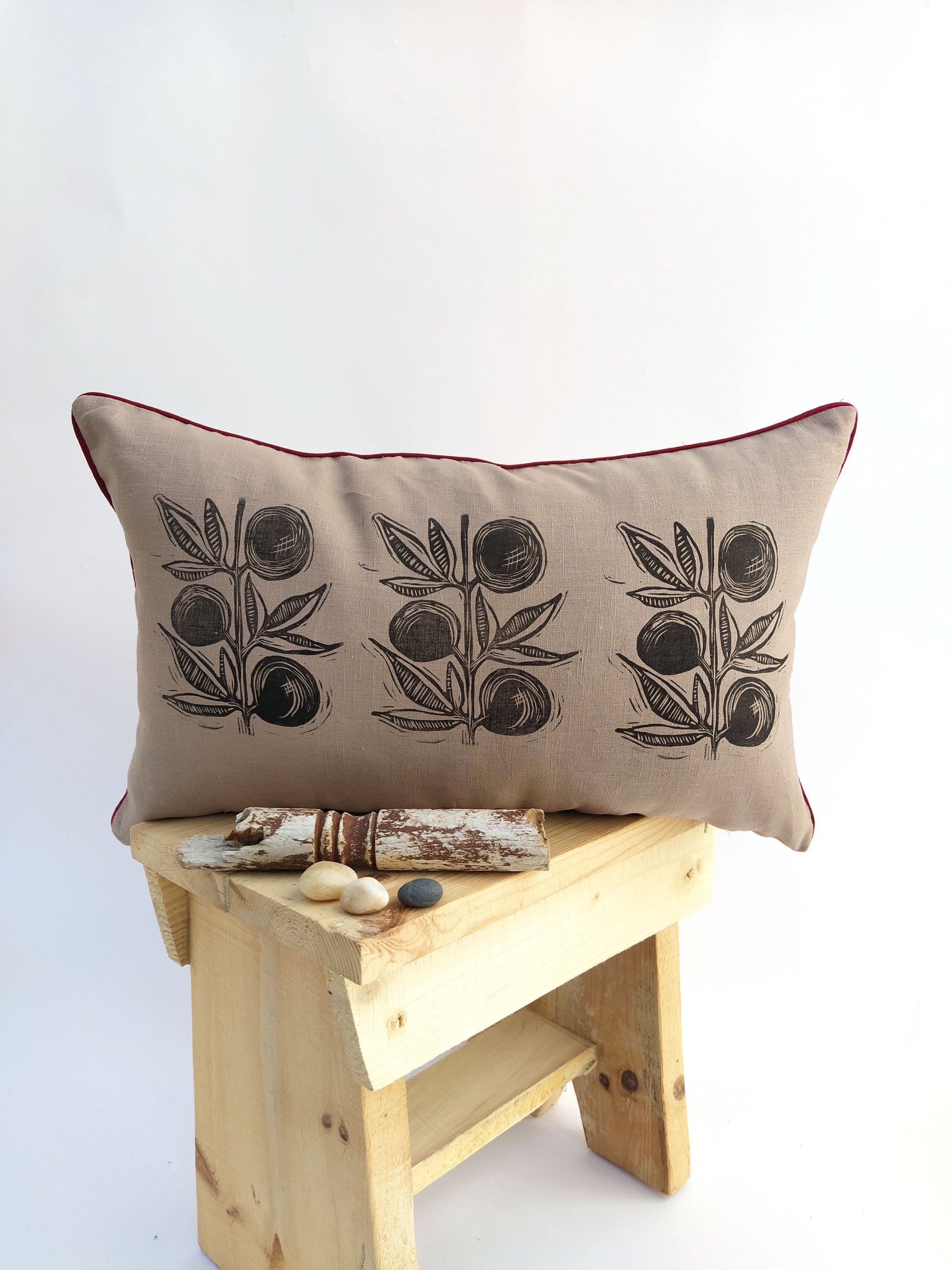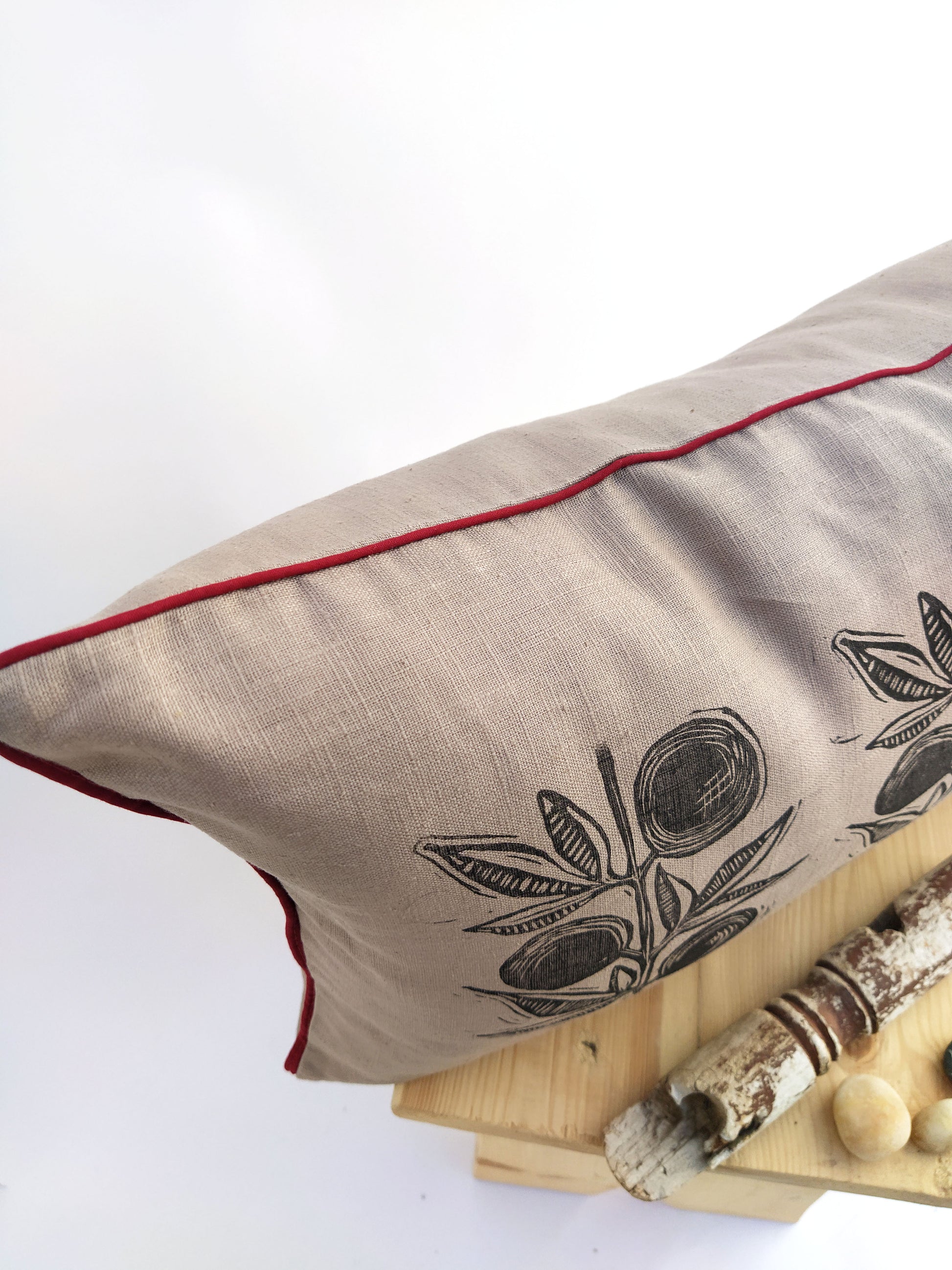 This decorative cushion cover is made of exquisite beige/brown organic linen. It is block printed with original linocuts. The colors are bright and the thoughtful design is what makes it even more unique. The beautiful fabric and print will look gorgeous in any room. The zipper of the cover is hidden at the bottom of the pillow. This throw pillow has a beautiful dark red edge around it.