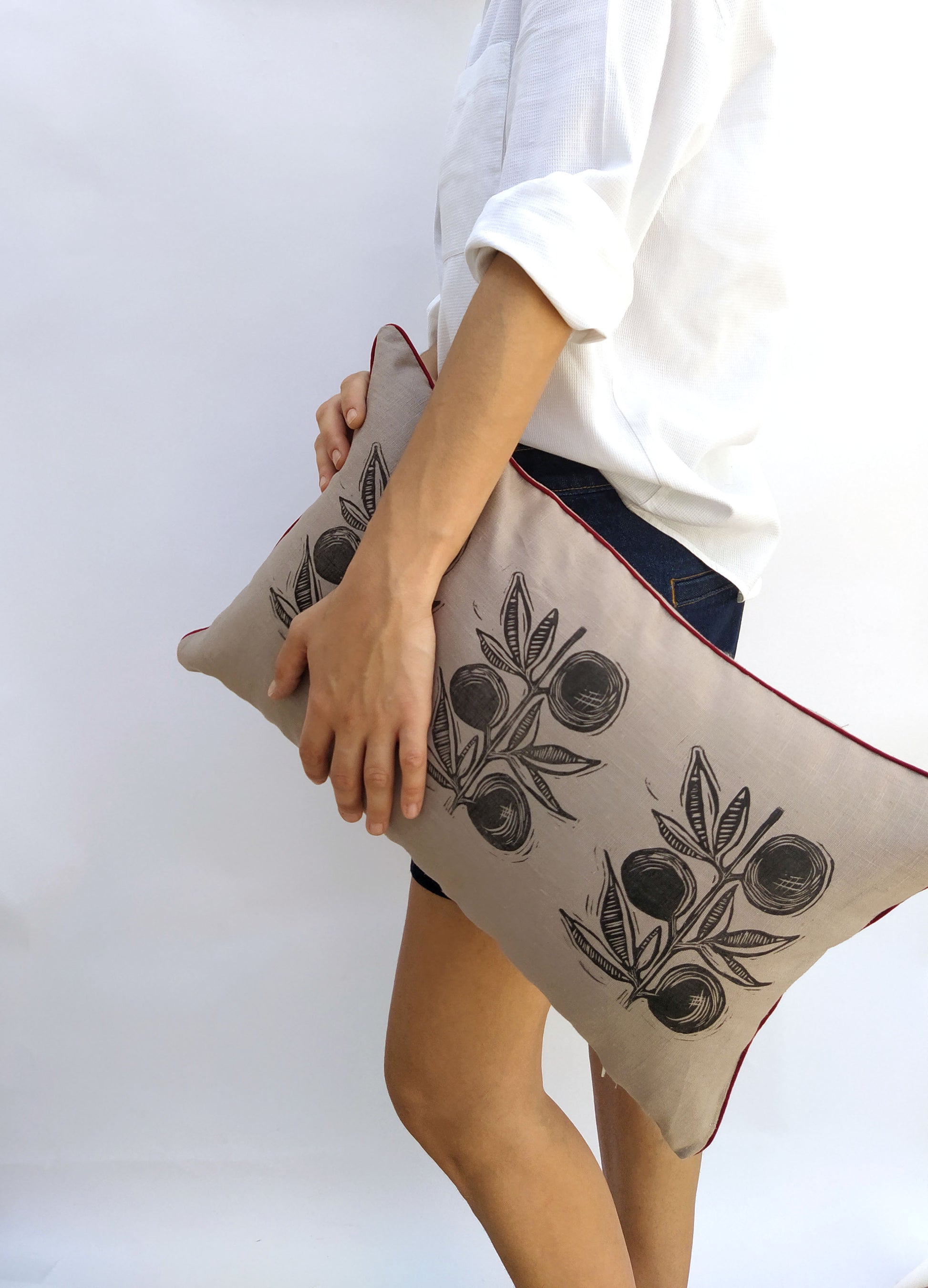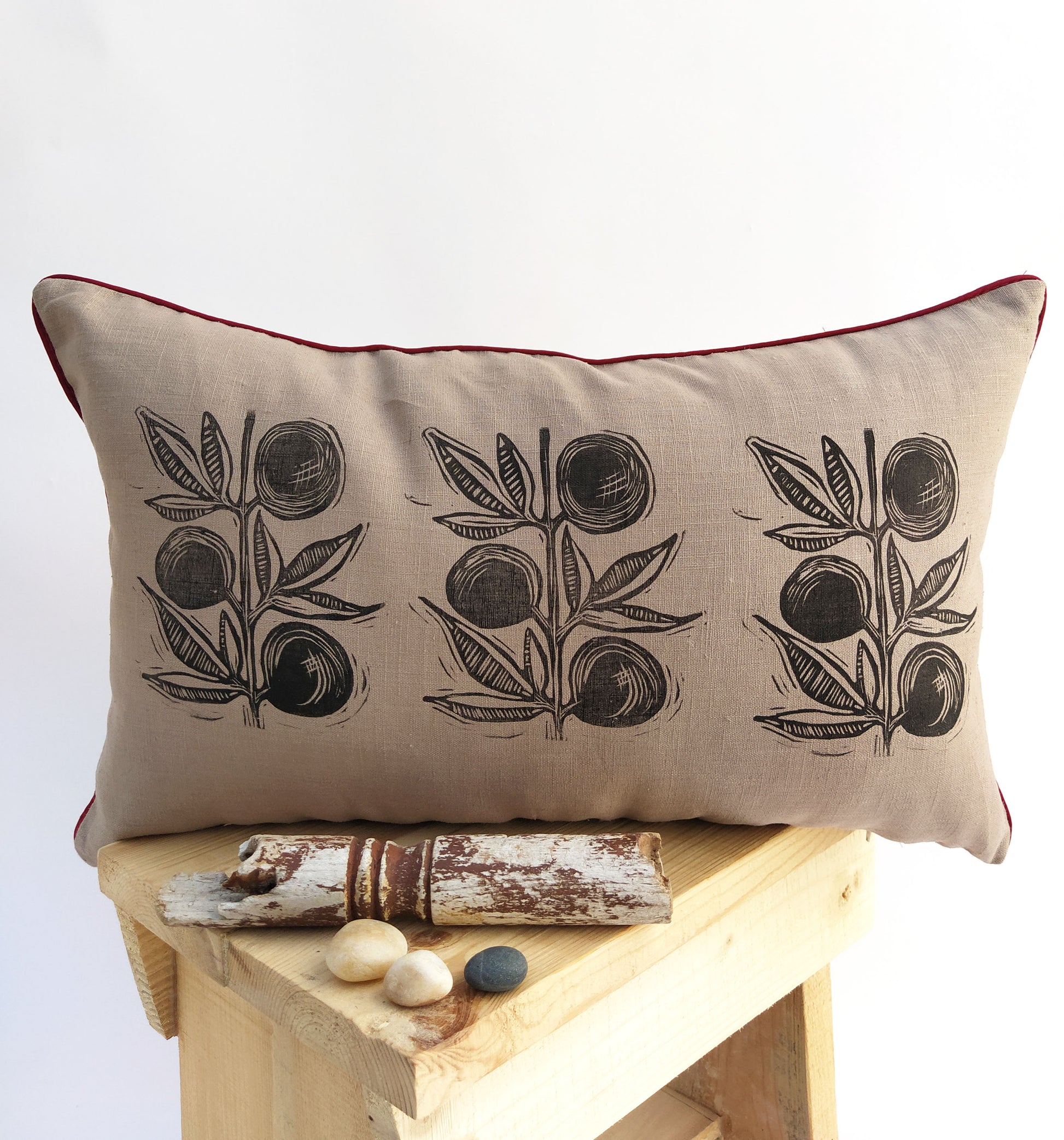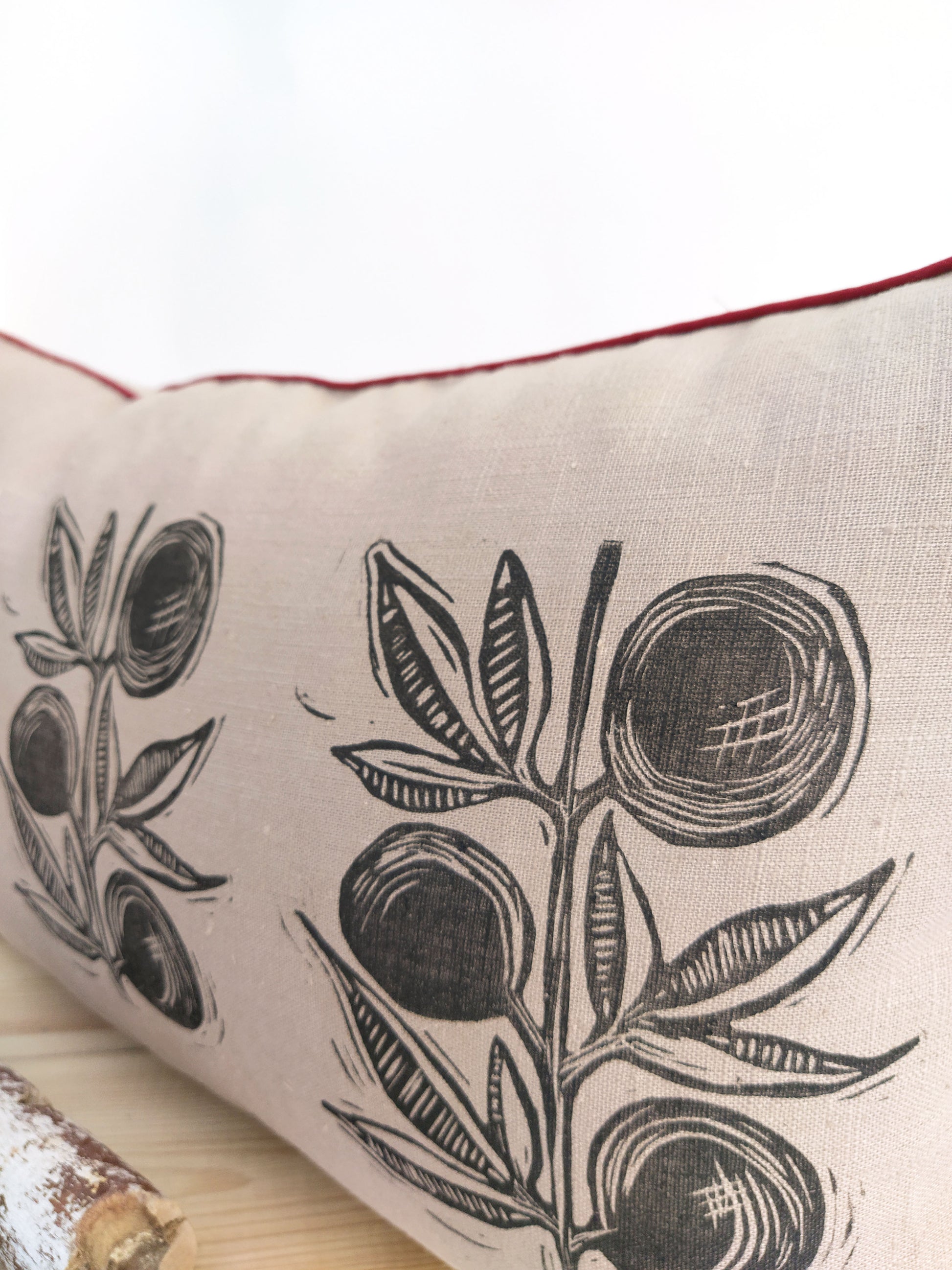 This decorative cushion cover is made of exquisite beige/brown organic linen. It is block printed with original linocuts. The colors are bright and the thoughtful design is what makes it even more unique. The beautiful fabric and print will look gorgeous in any room. The zipper of the cover is hidden at the bottom of the pillow. This throw pillow has a beautiful dark red edge around it.