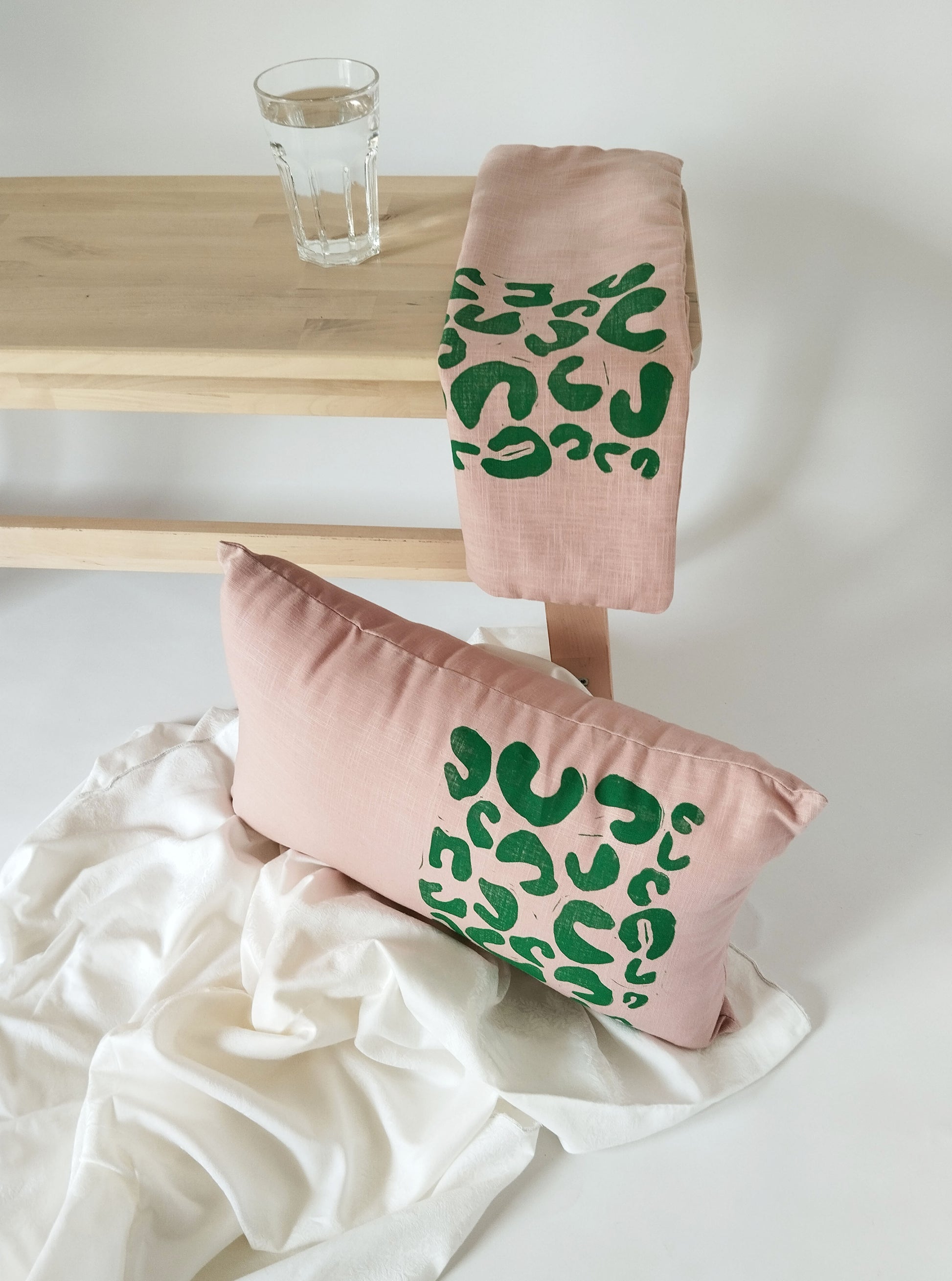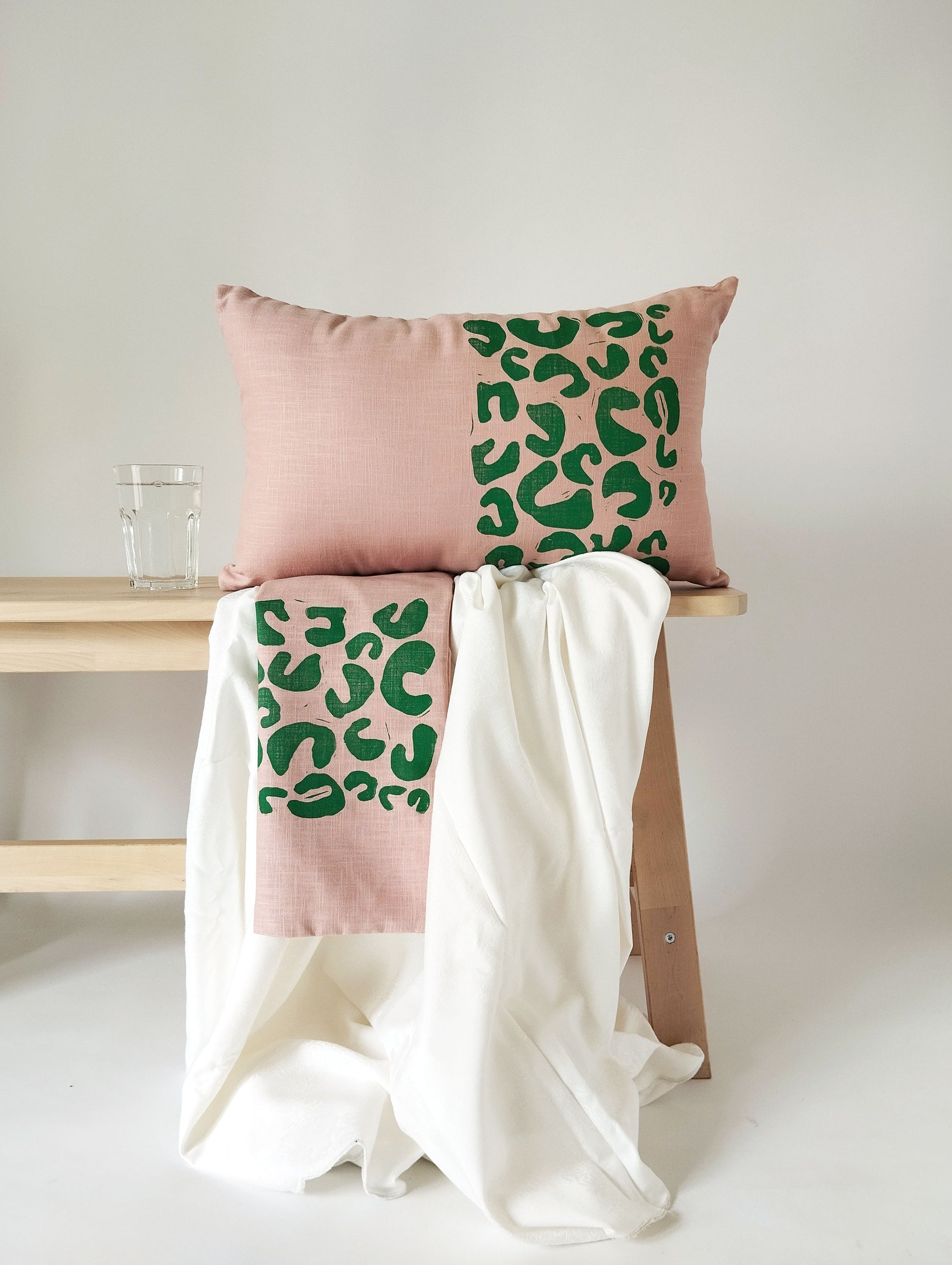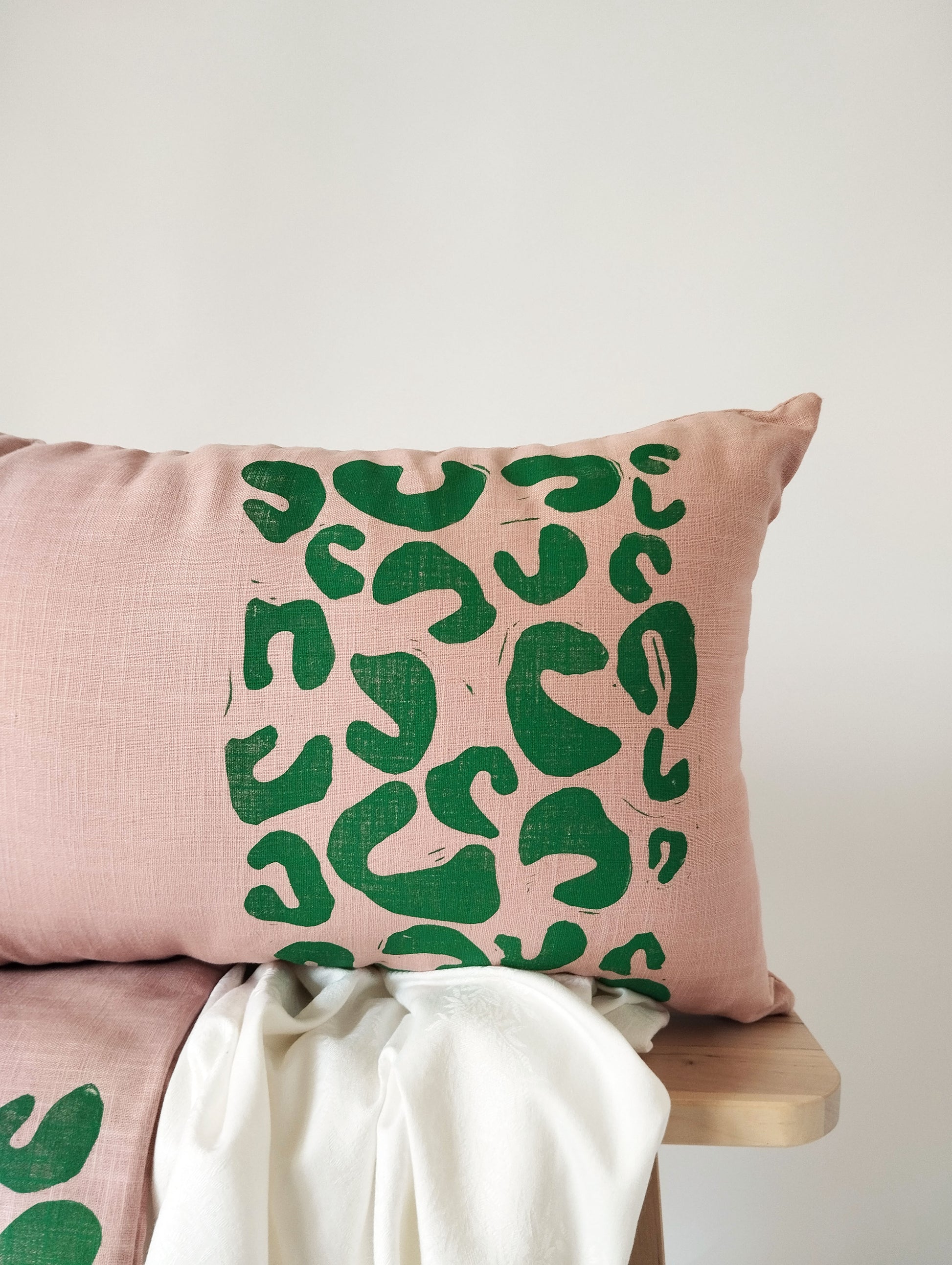 The green animal print pattern is entirely block printed by hand. The colors are bright and the thoughtful design is what makes it even more unique. The beautiful fabric and the print will look gorgeous in any room. The zipper of the cover is hidden at the bottom of the pillow.
