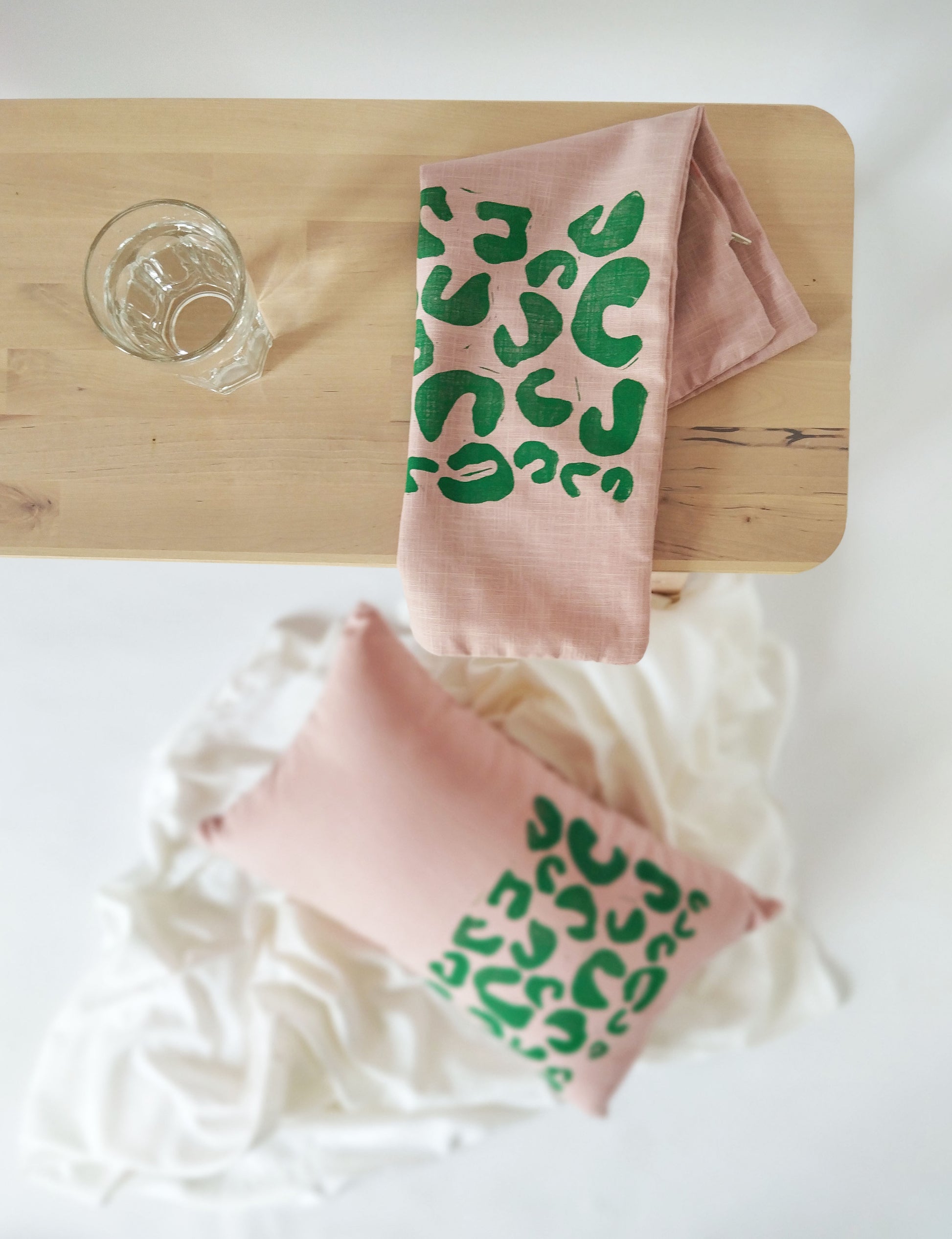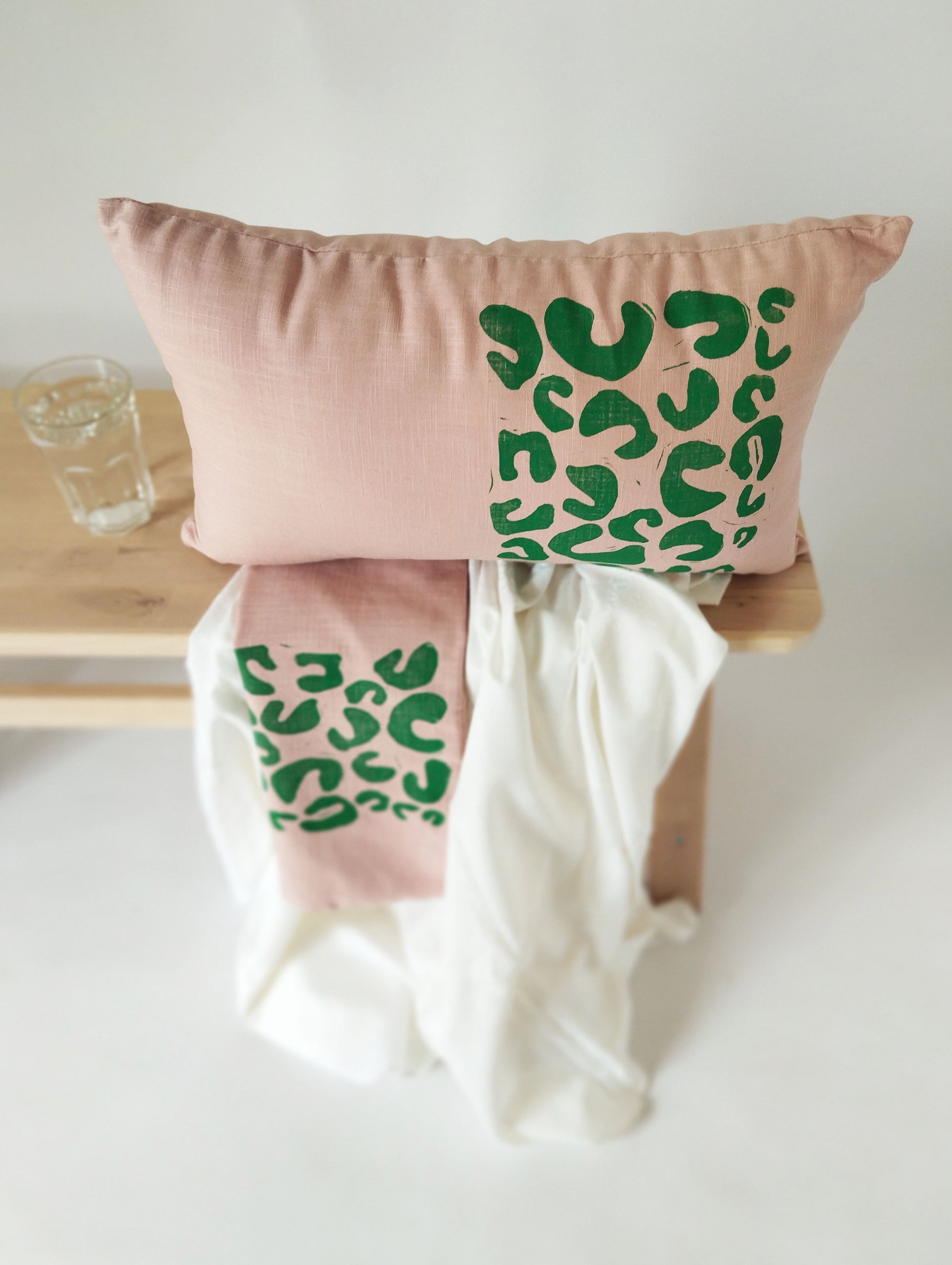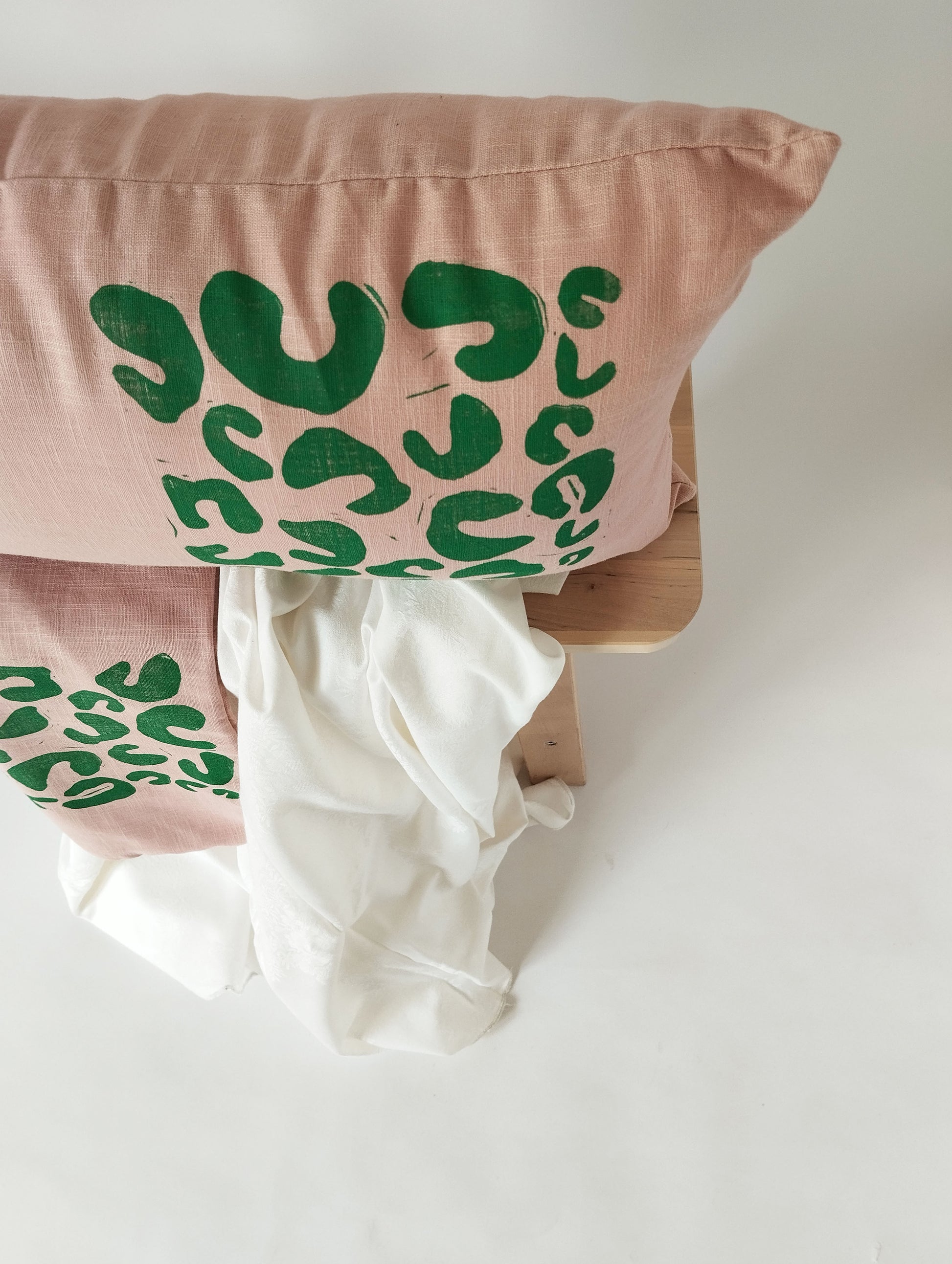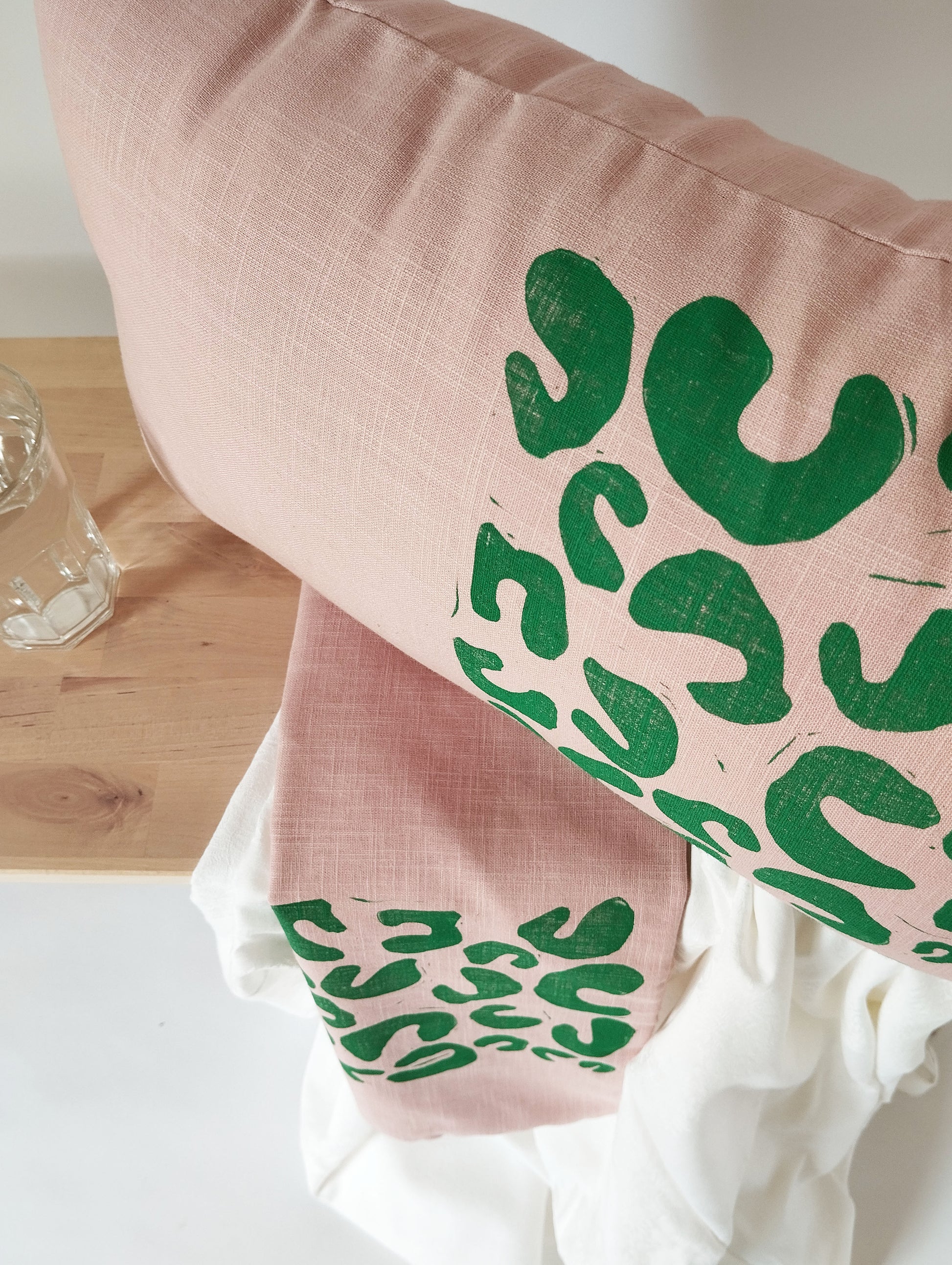 The green animal print pattern is entirely block printed by hand. The colors are bright and the thoughtful design is what makes it even more unique. The beautiful fabric and the print will look gorgeous in any room. The zipper of the cover is hidden at the bottom of the pillow.