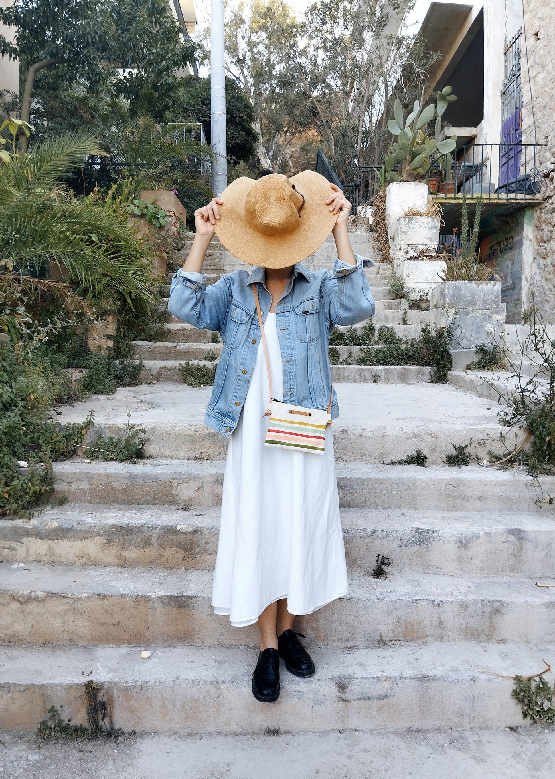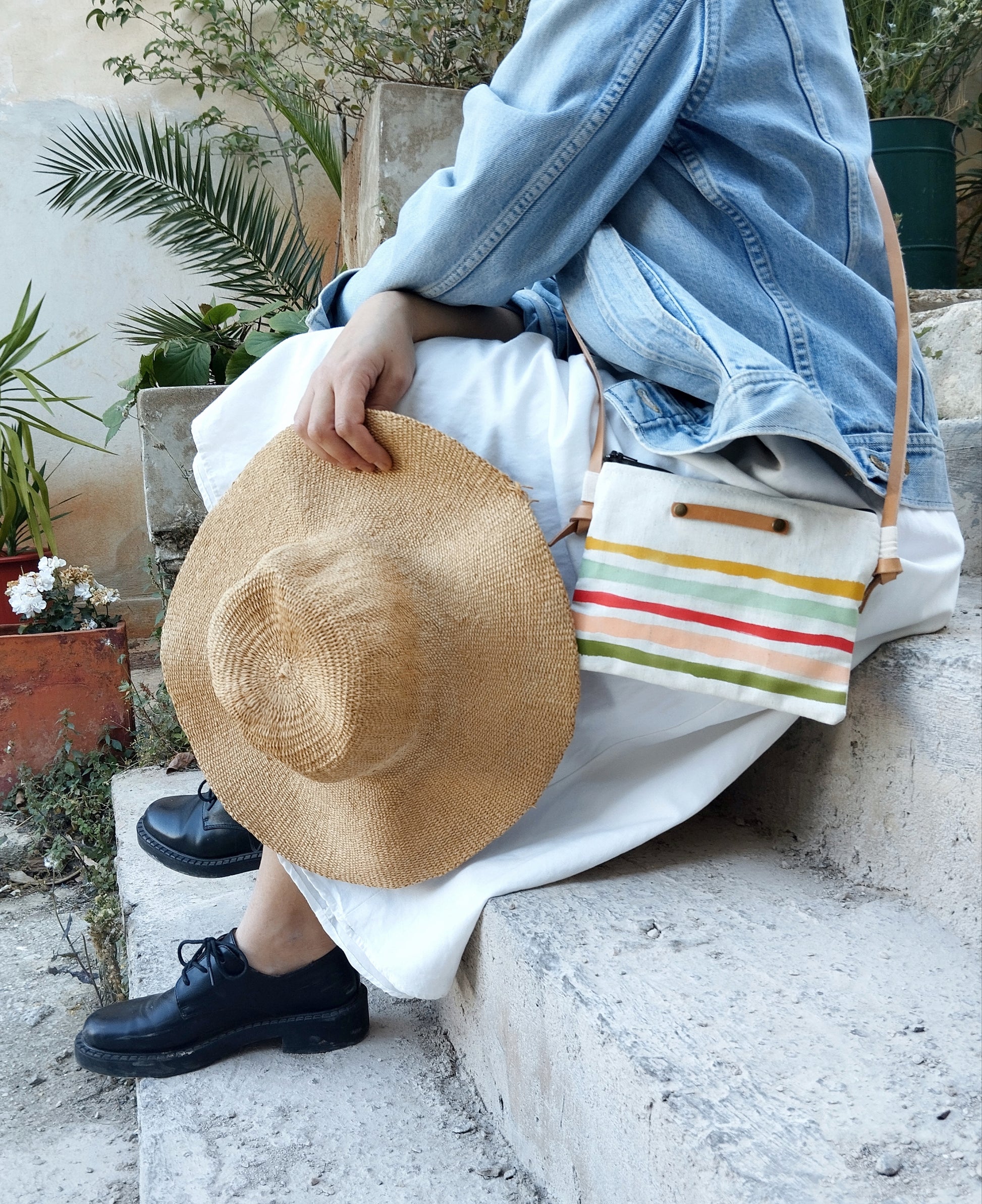 This vacation-inspired purse is made of an exquisite quality cotton canvas. Lightweight and compact, it carries your essentials—passport, phone, sunglasses—while adding a pop of Mediterranean charm to any outfit. It also has a small pocket at the back of the bag.