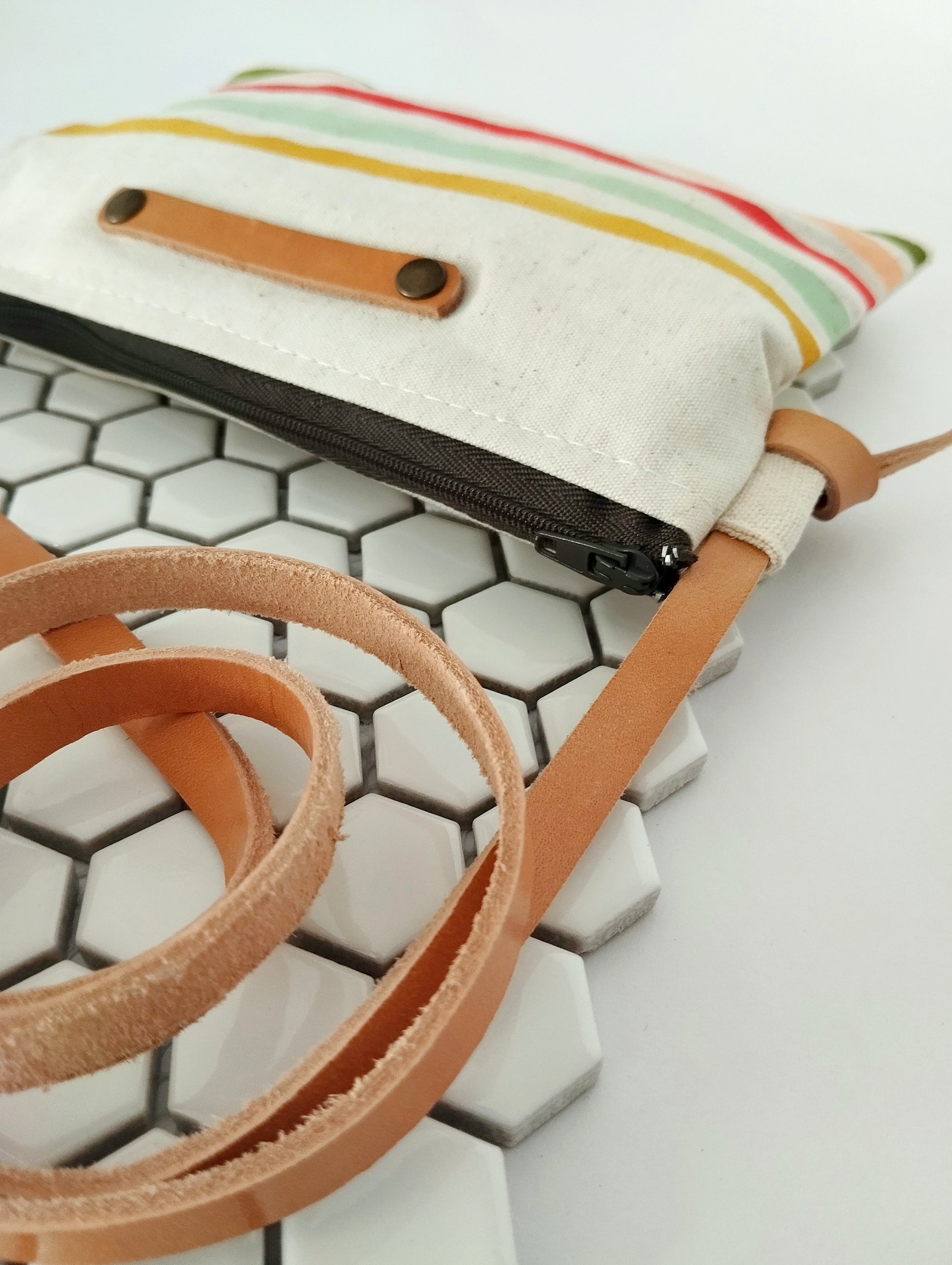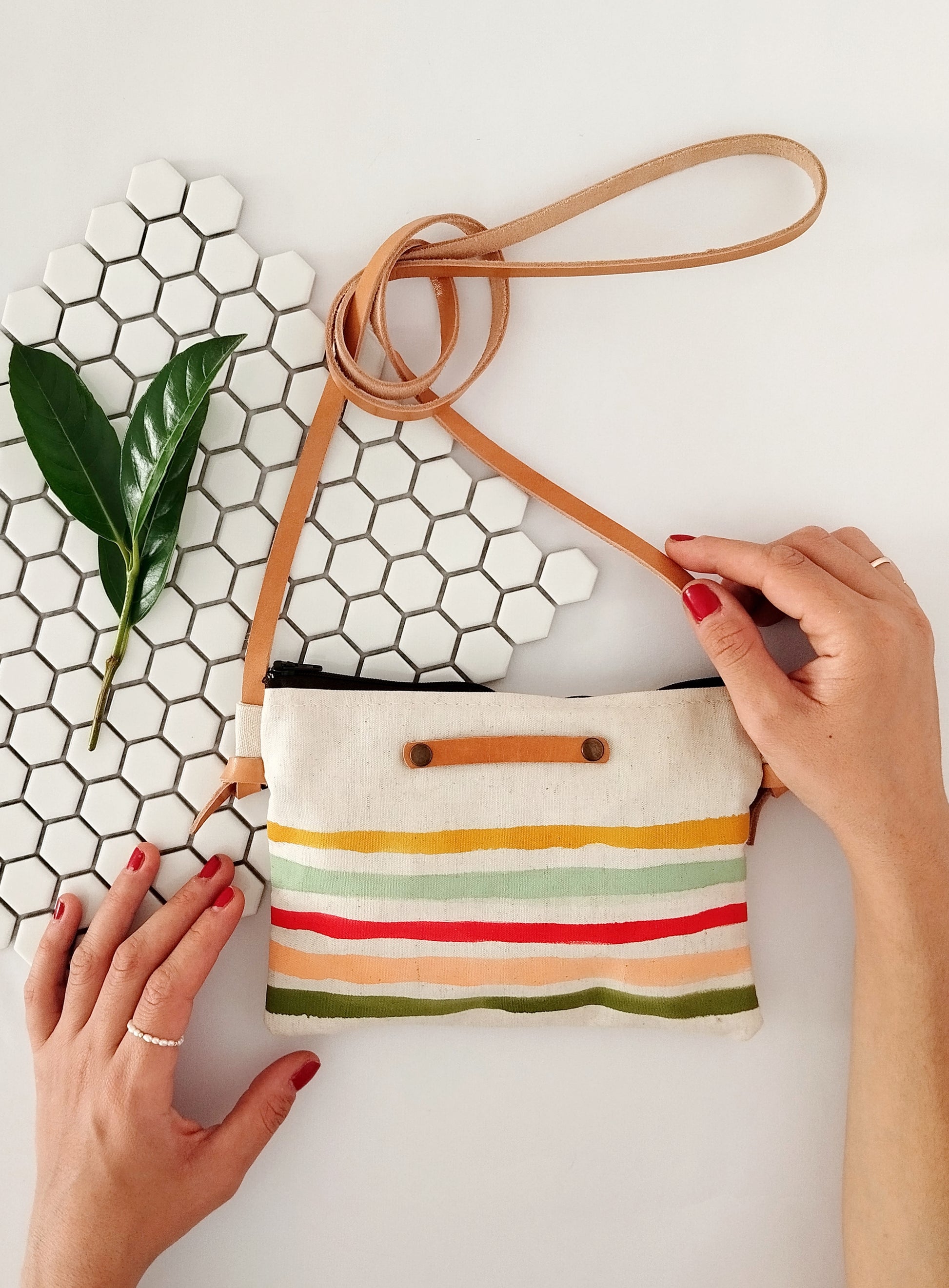 This coastal chic sling bag is entirely painted by hand. Each color is thoughtful chosen to match the Mediterranean vibe I wanted to recreate. Every piece is slightly different from the other and even more unique.I create all of my designs thinking that "art is for the everyday" and wearing that purse truly feels like you carry a real piece of art.
