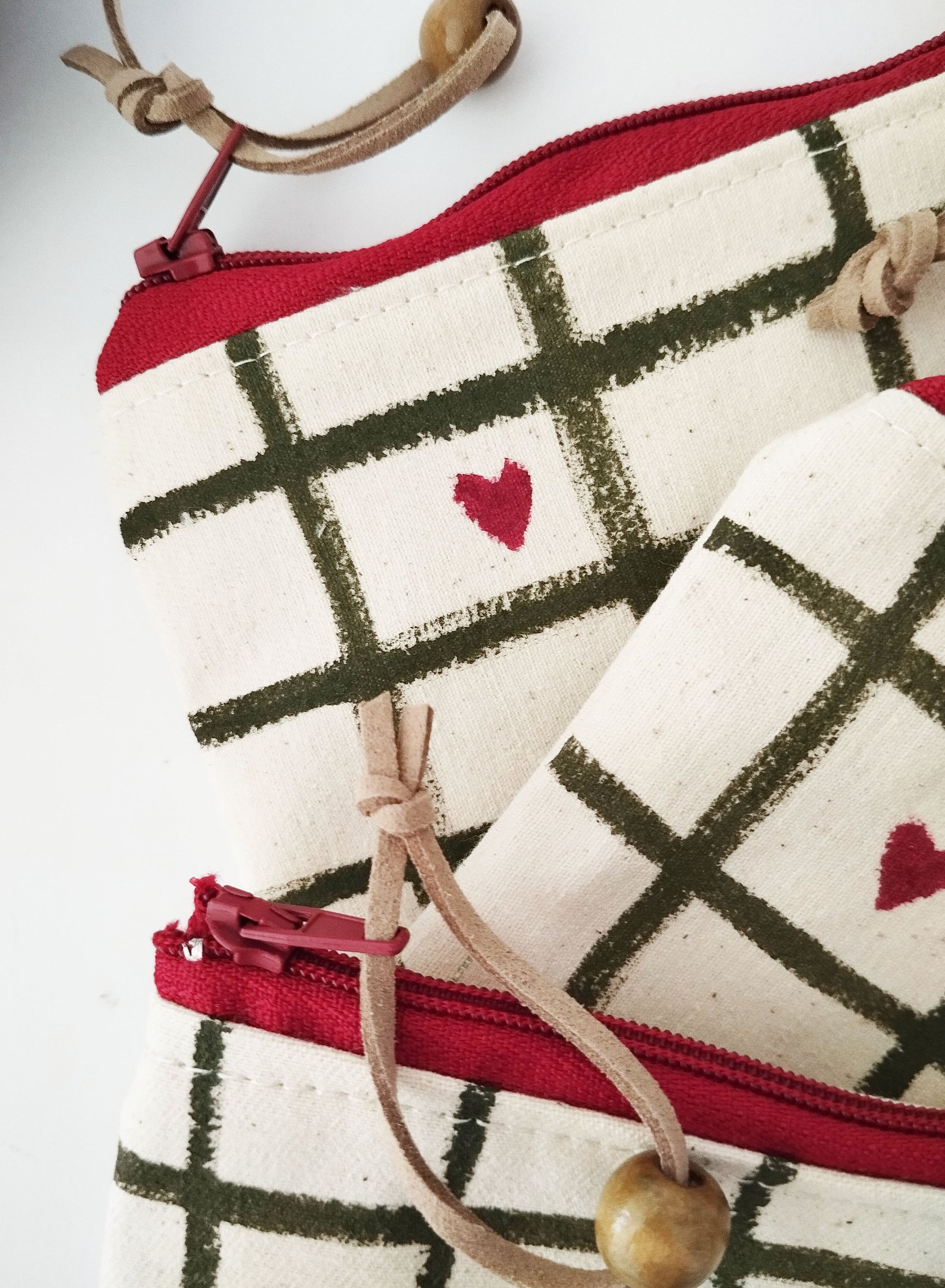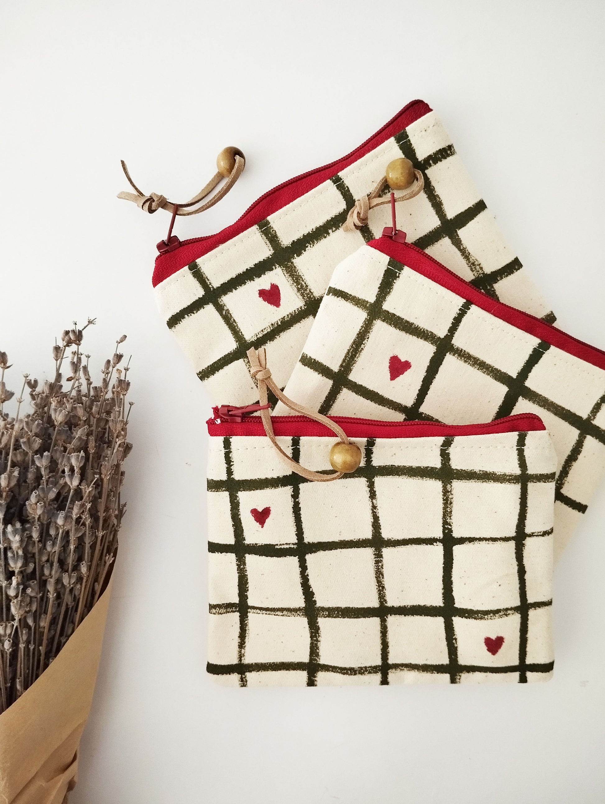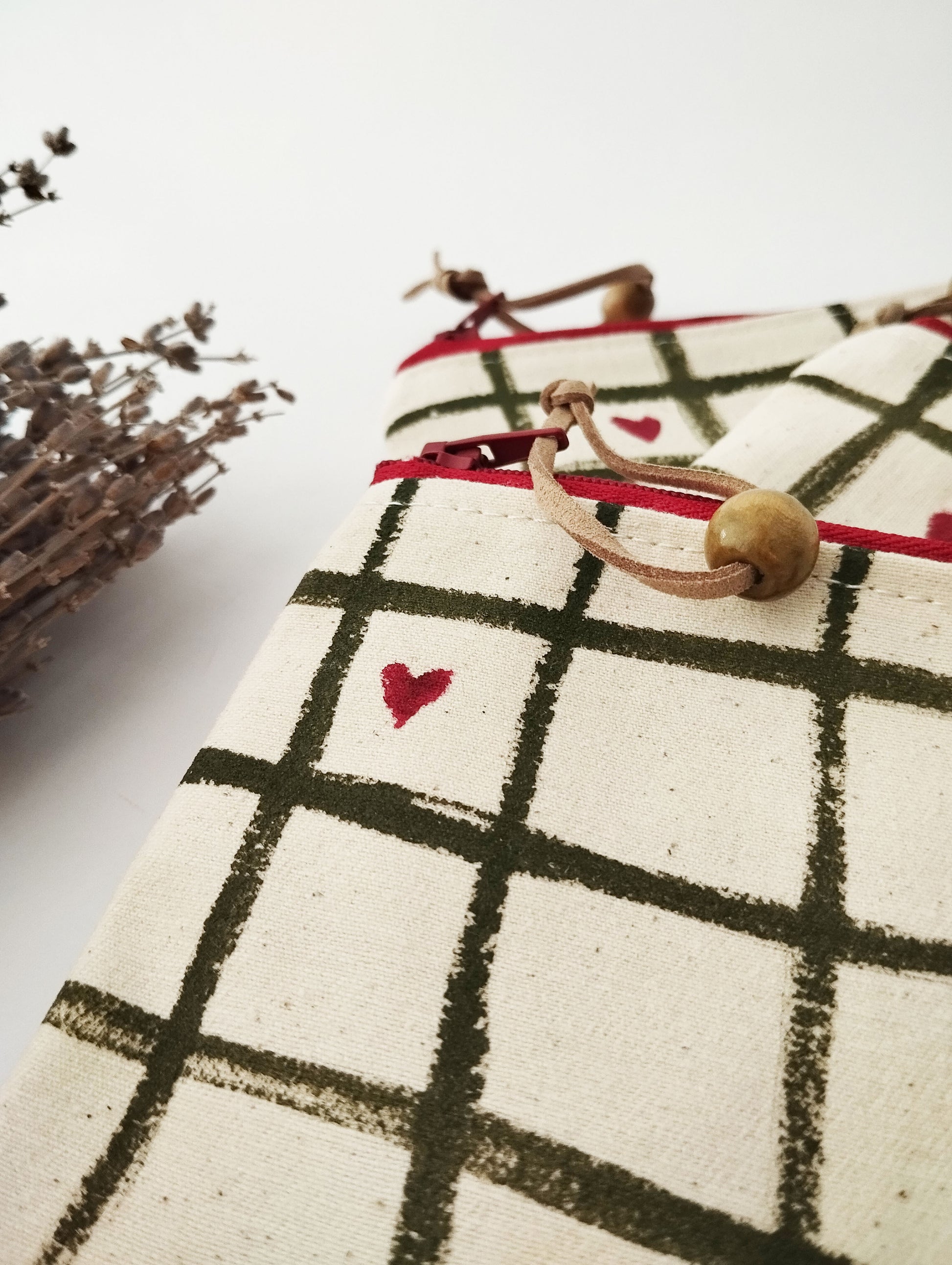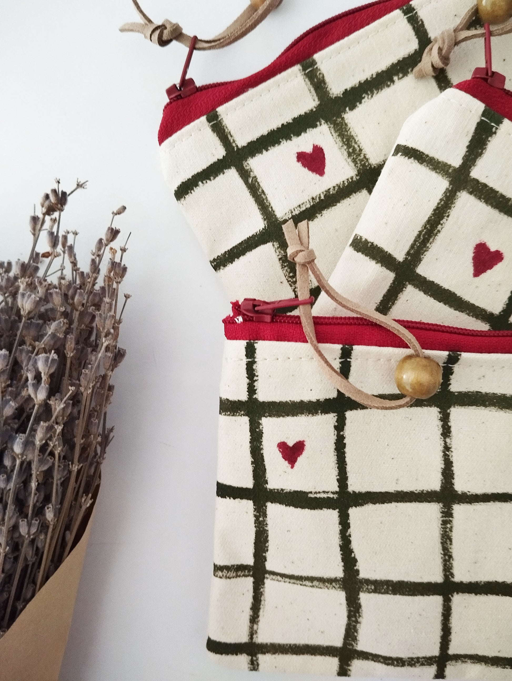 This delightful fabric purse is entirely painted by hand. The charming little hearts with the green grid add the most charming effect on the fabric. The vibrant and playful heart pattern adds a touch of fun to your accessory collection.