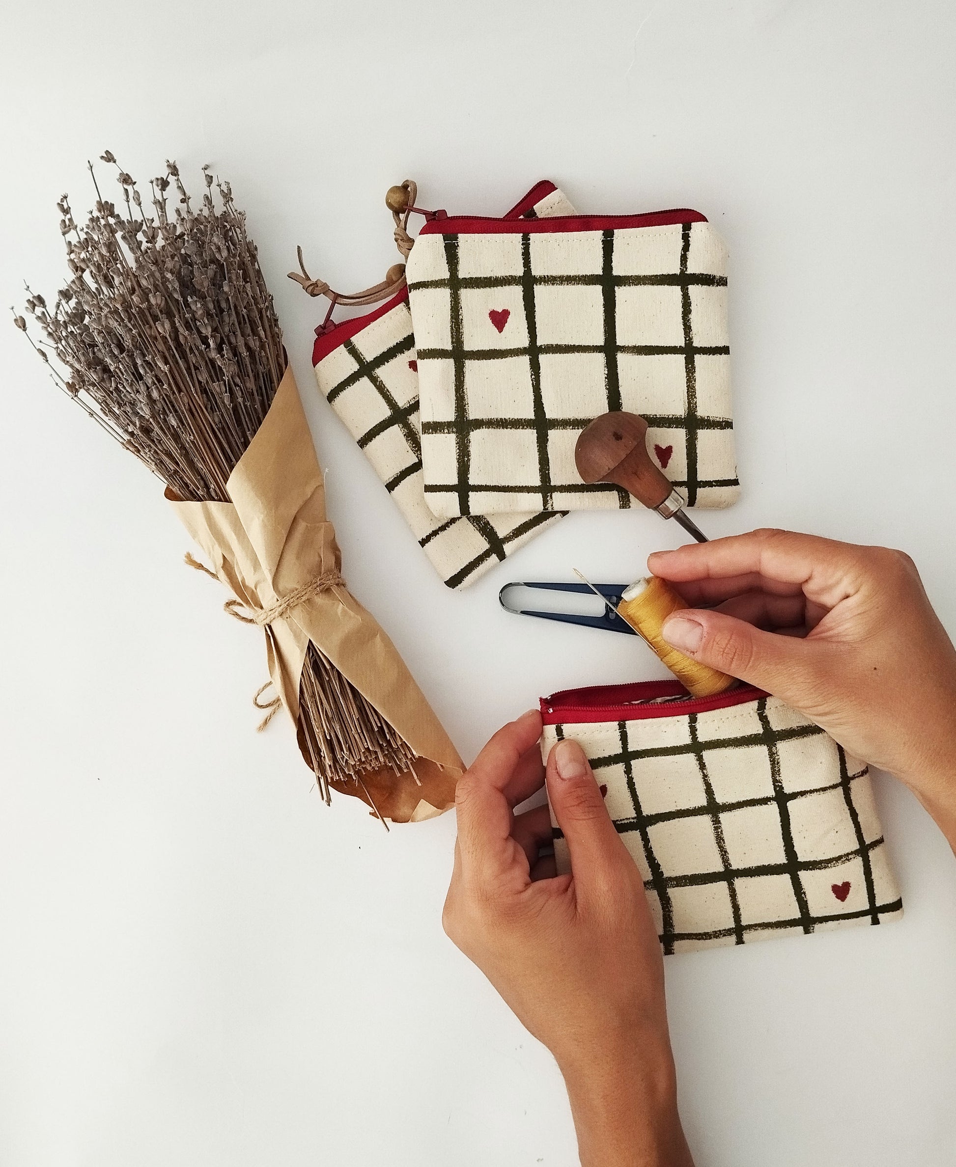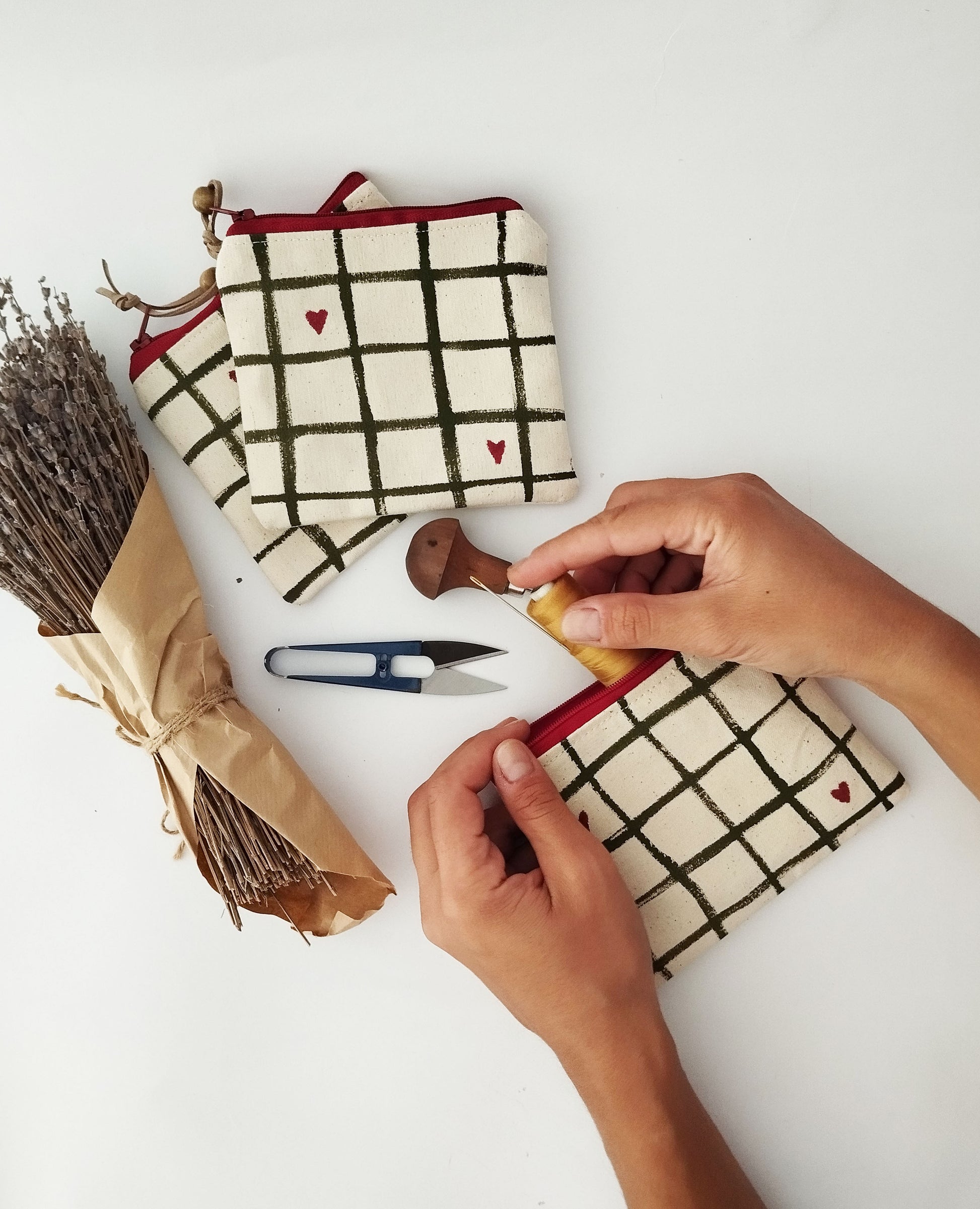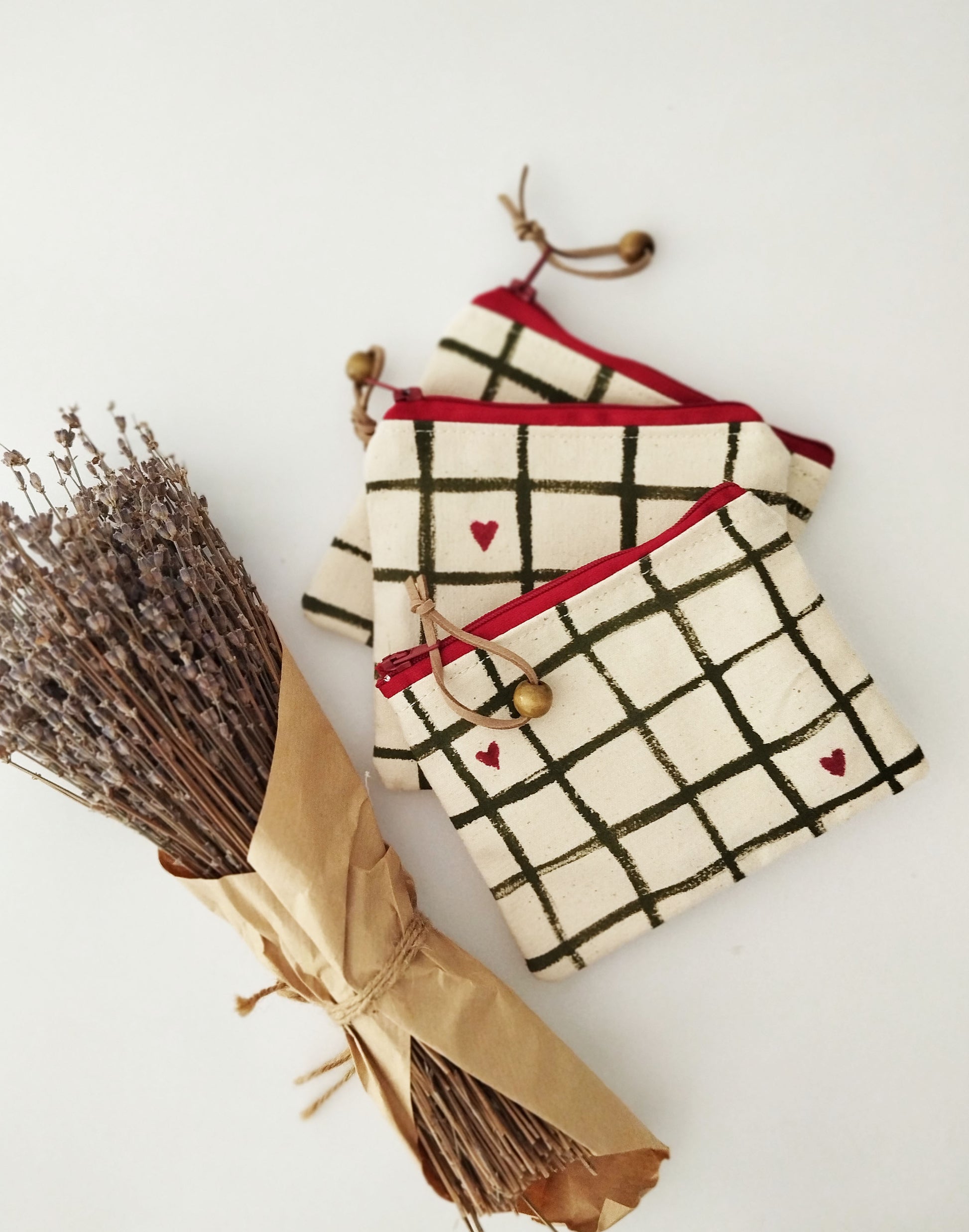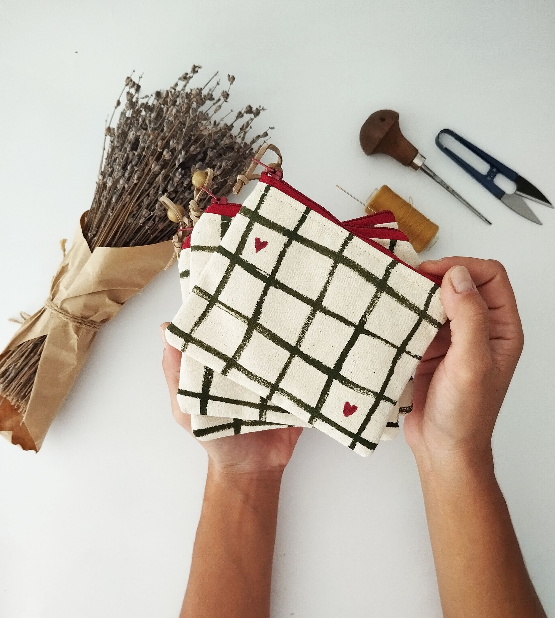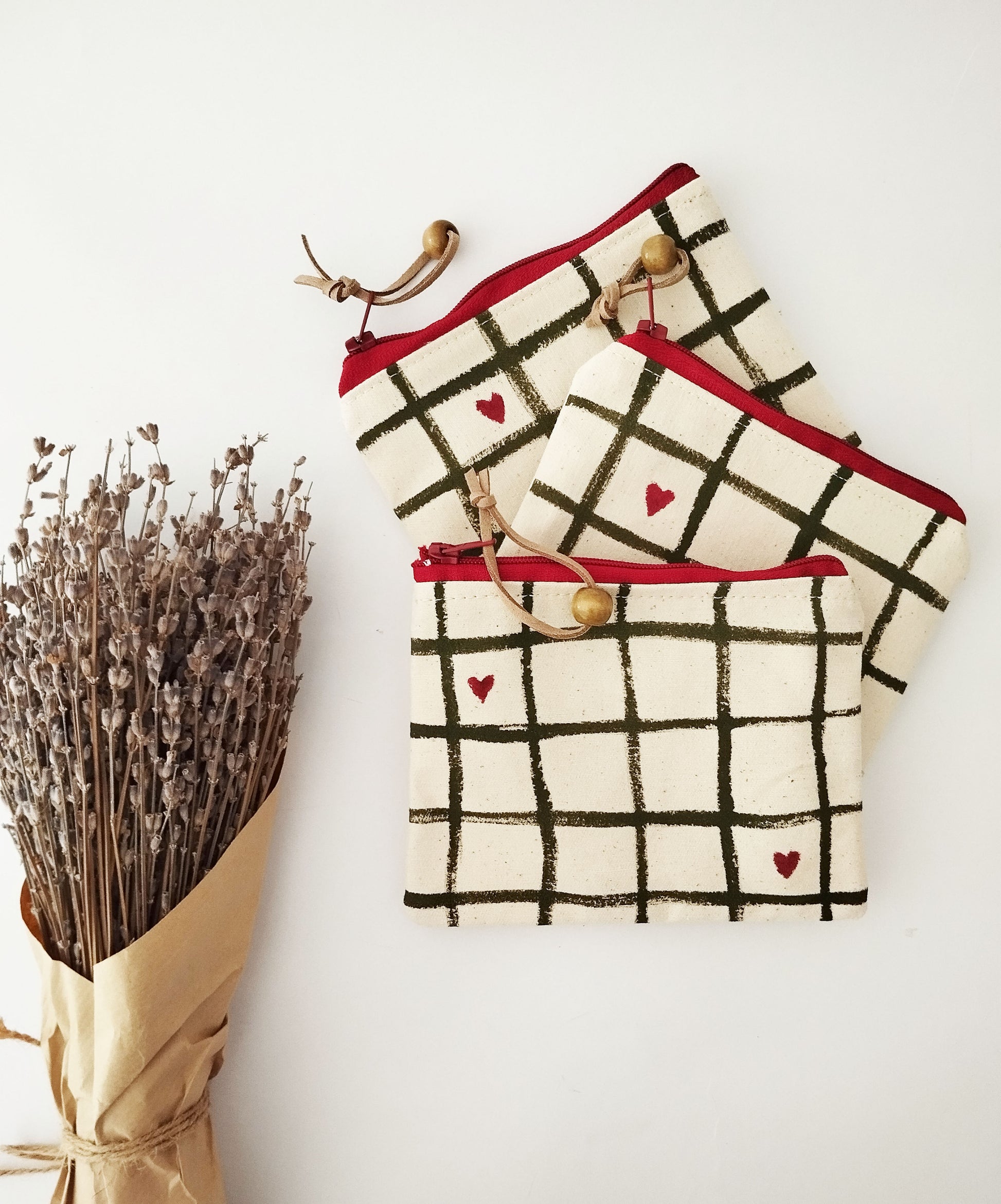 This delightful fabric purse is entirely painted by hand. The charming little hearts with the green grid add the most charming effect on the fabric. The vibrant and playful heart pattern adds a touch of fun to your accessory collection.