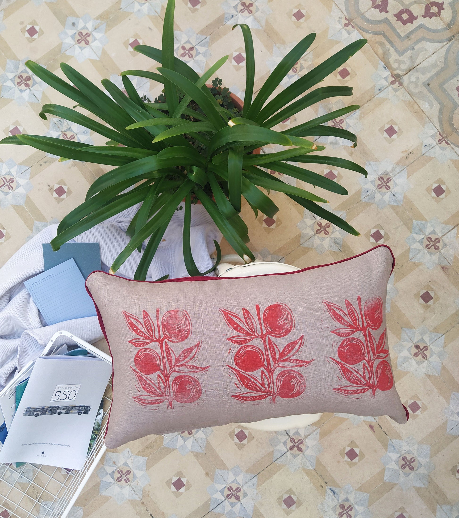 It is block printed with original linocuts. The colors are bright and the thoughtful design is what makes it even more unique. The beautiful fabric and print will look gorgeous in any room. The zipper of the cover is hidden at the bottom of the pillow.