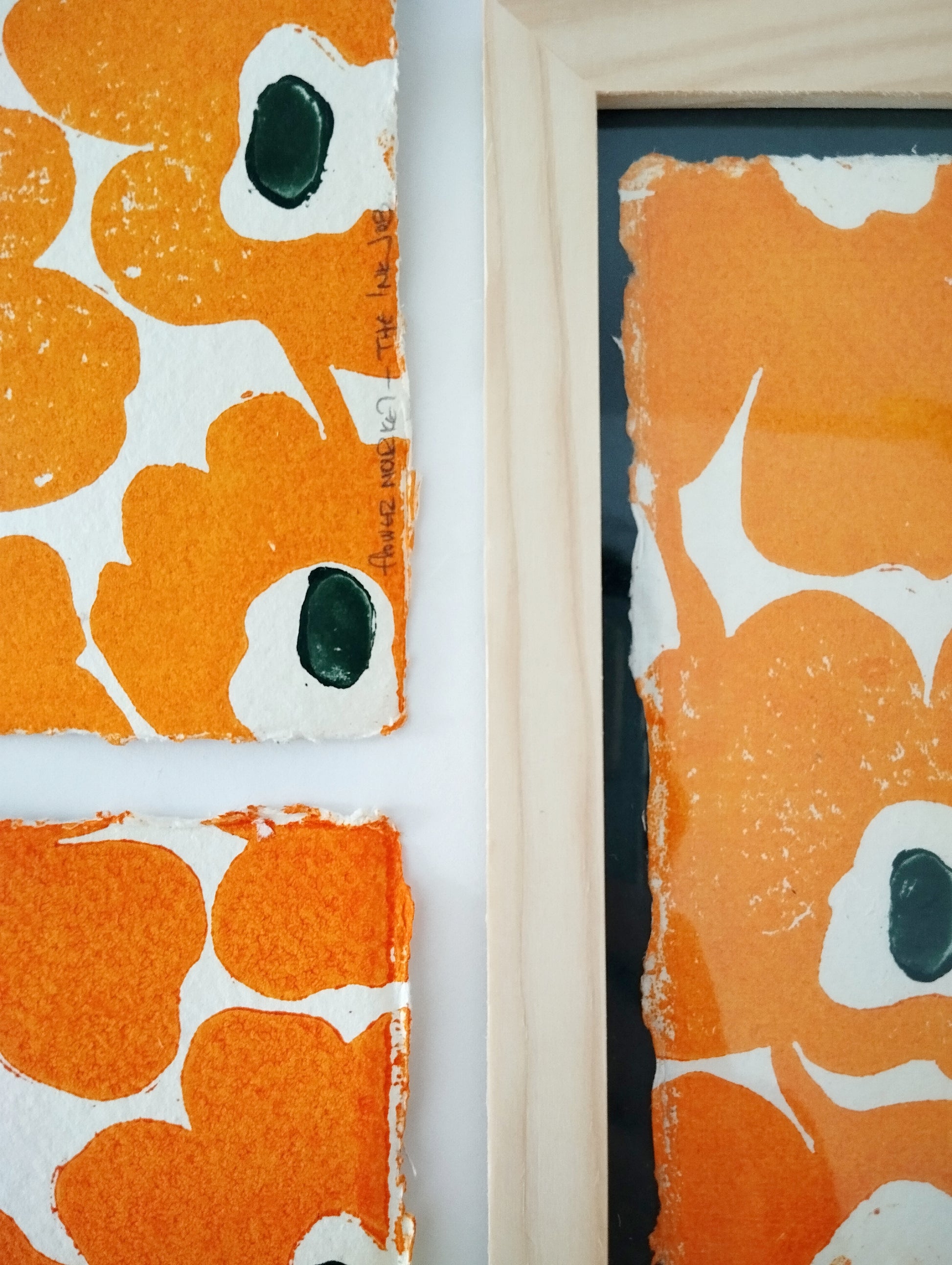 "Flower Market’ is an original art print that beautifully captures a carefree essence and it will color your space with joy. This is a linoprint entirely made and printed by hand on a beautiful, heavy handmade cotton paper. Each art print will vary slightly in texture and darkness making each piece of art unique.
