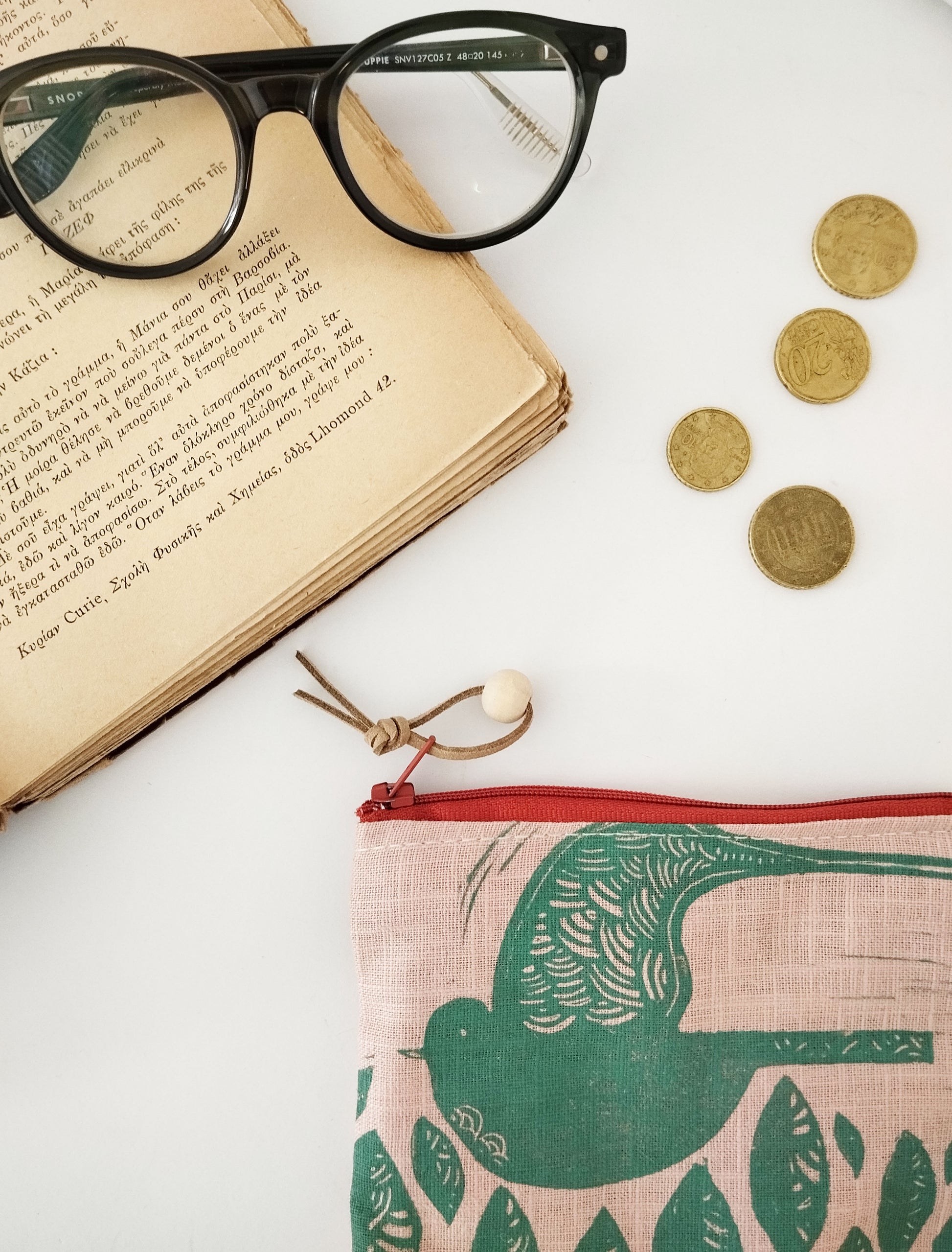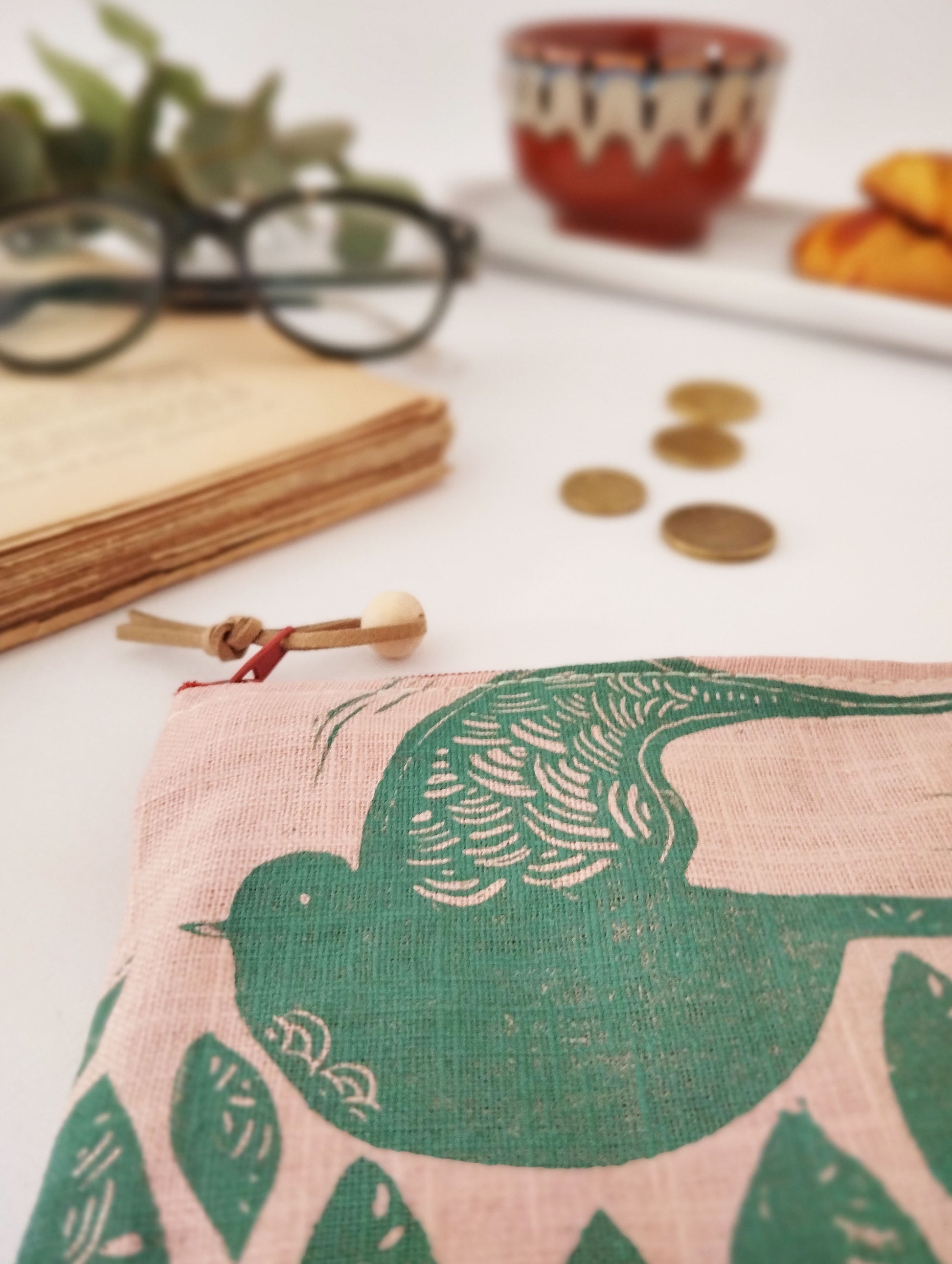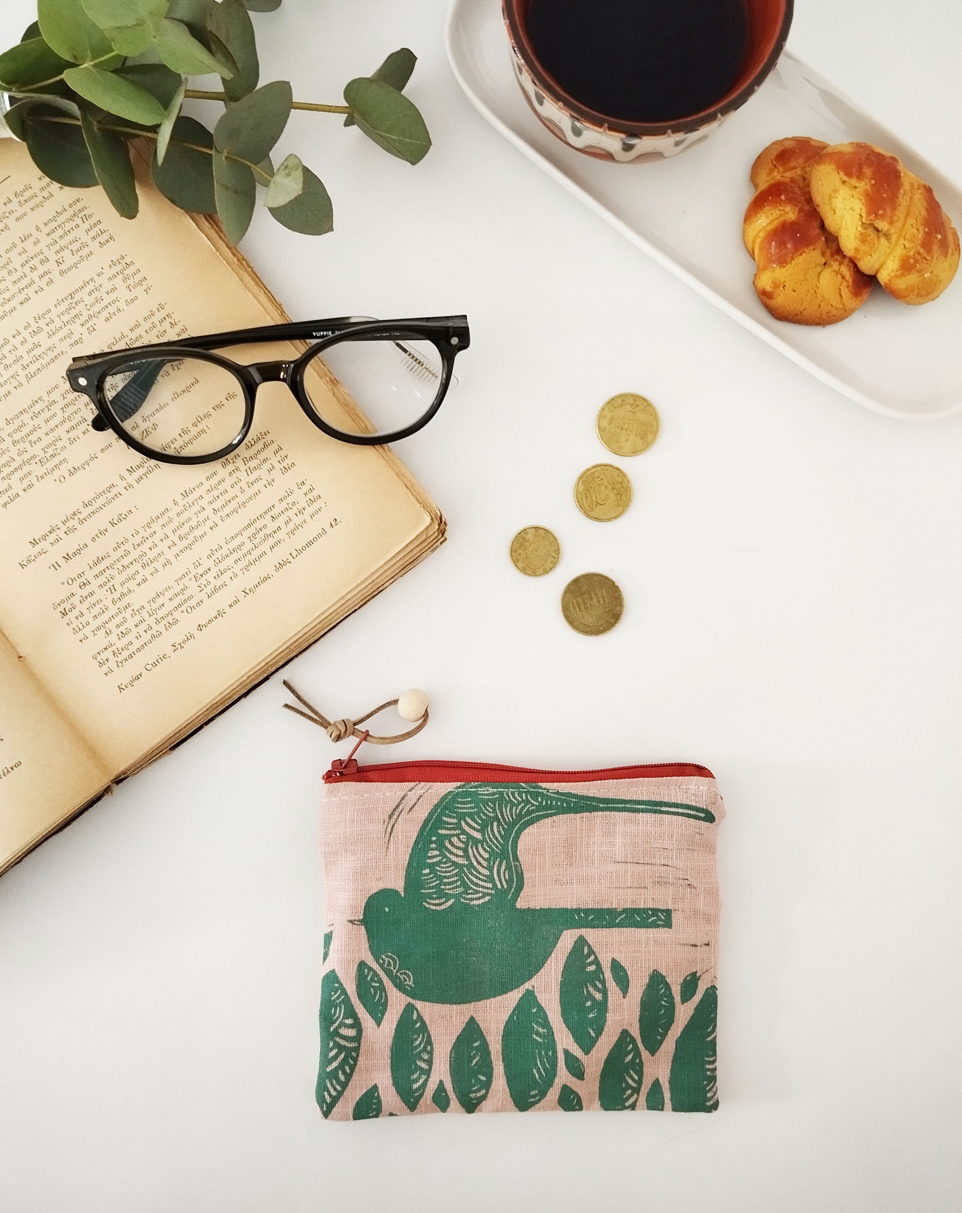 The print of this fabric wallet is entirely block printed by hand. The folk bird with the additional leaves is inspired by traditional greek embroidery patterns kind of what my grandmother used to embroider. This is my way to reinvent tradition, through a new form and with a personal flair.