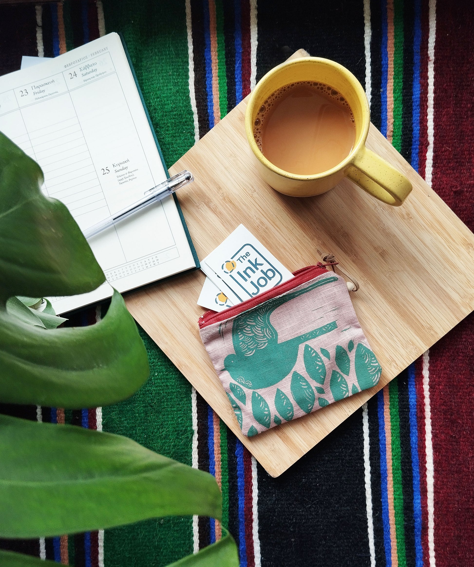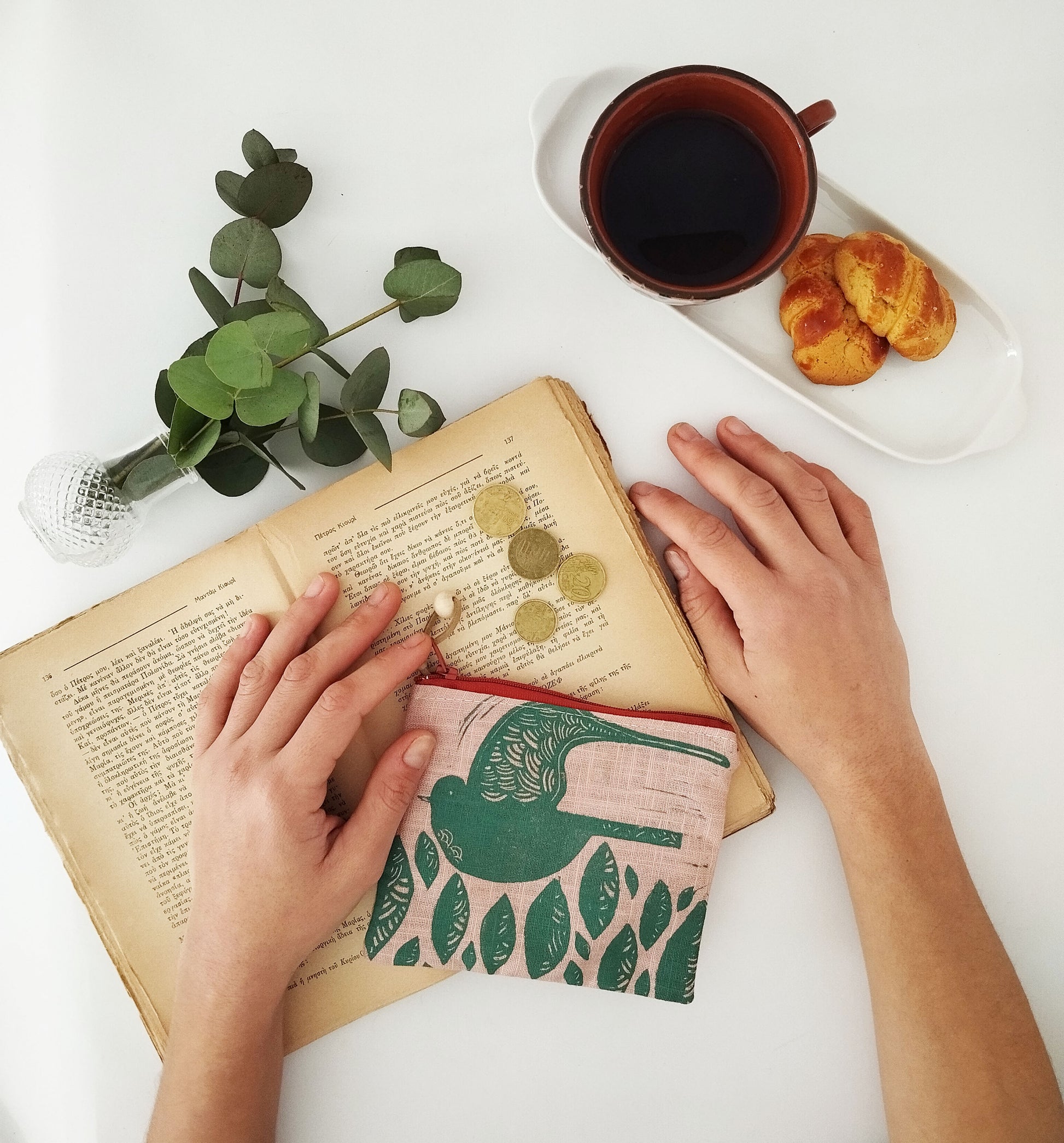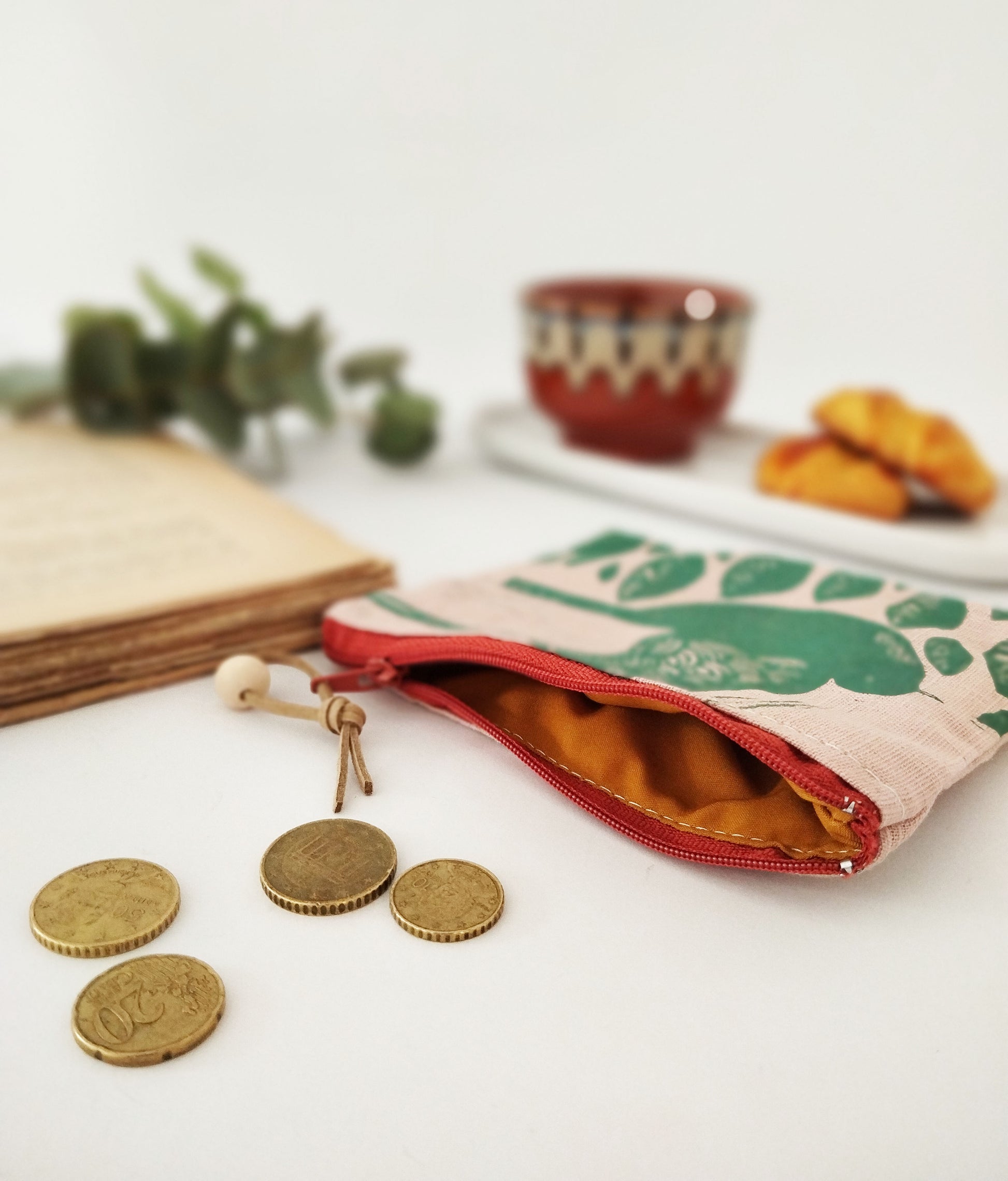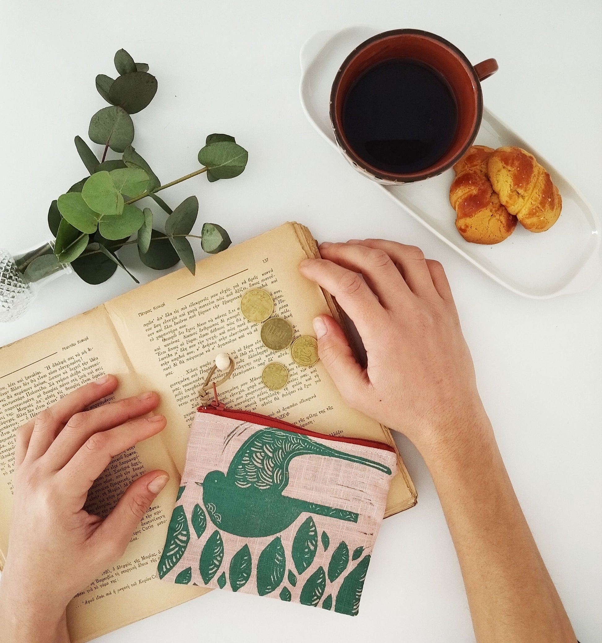 The print of this fabric wallet is entirely block printed by hand. The folk bird with the additional leaves is inspired by traditional greek embroidery patterns kind of what my grandmother used to embroider. This is my way to reinvent tradition, through a new form and with a personal flair.