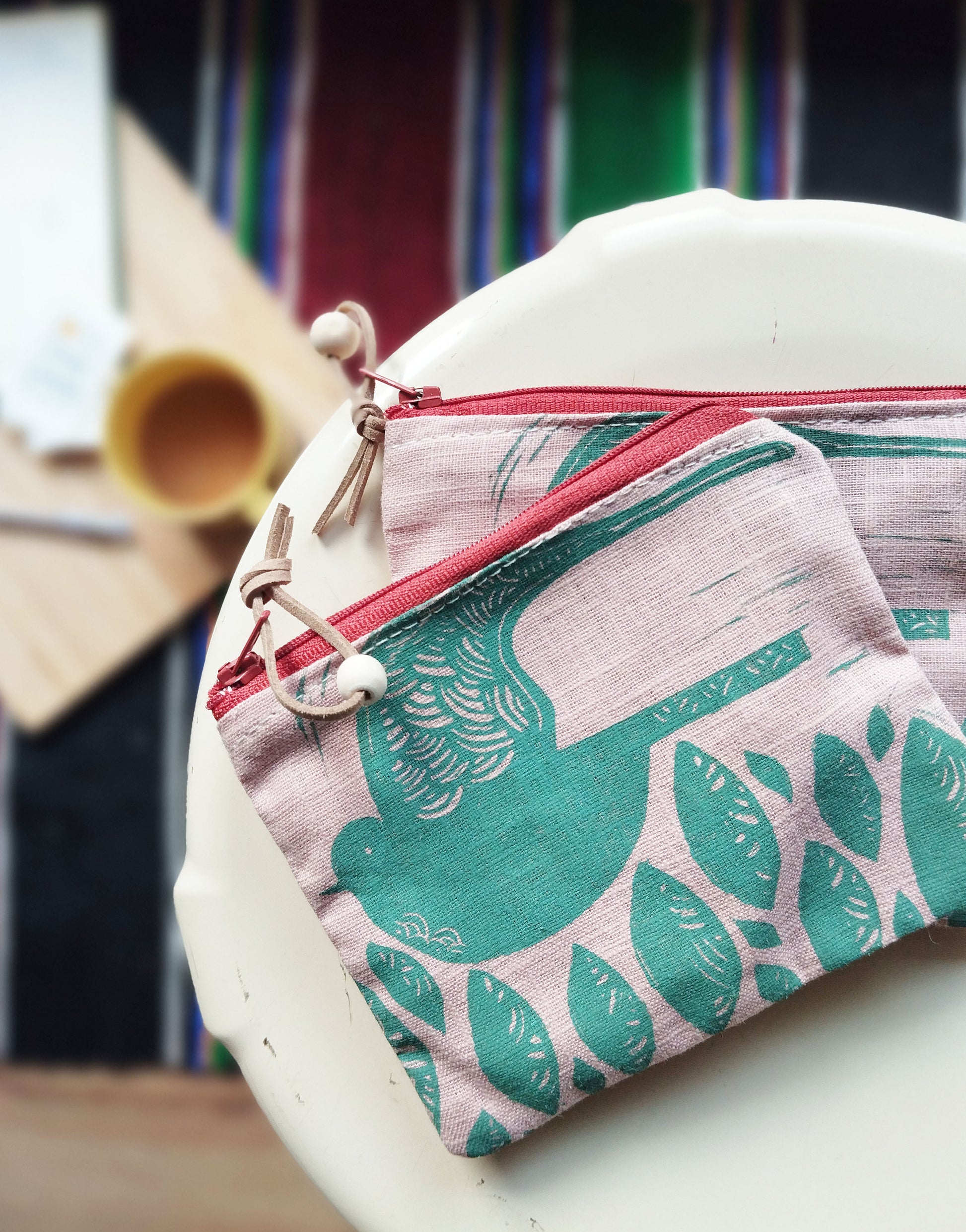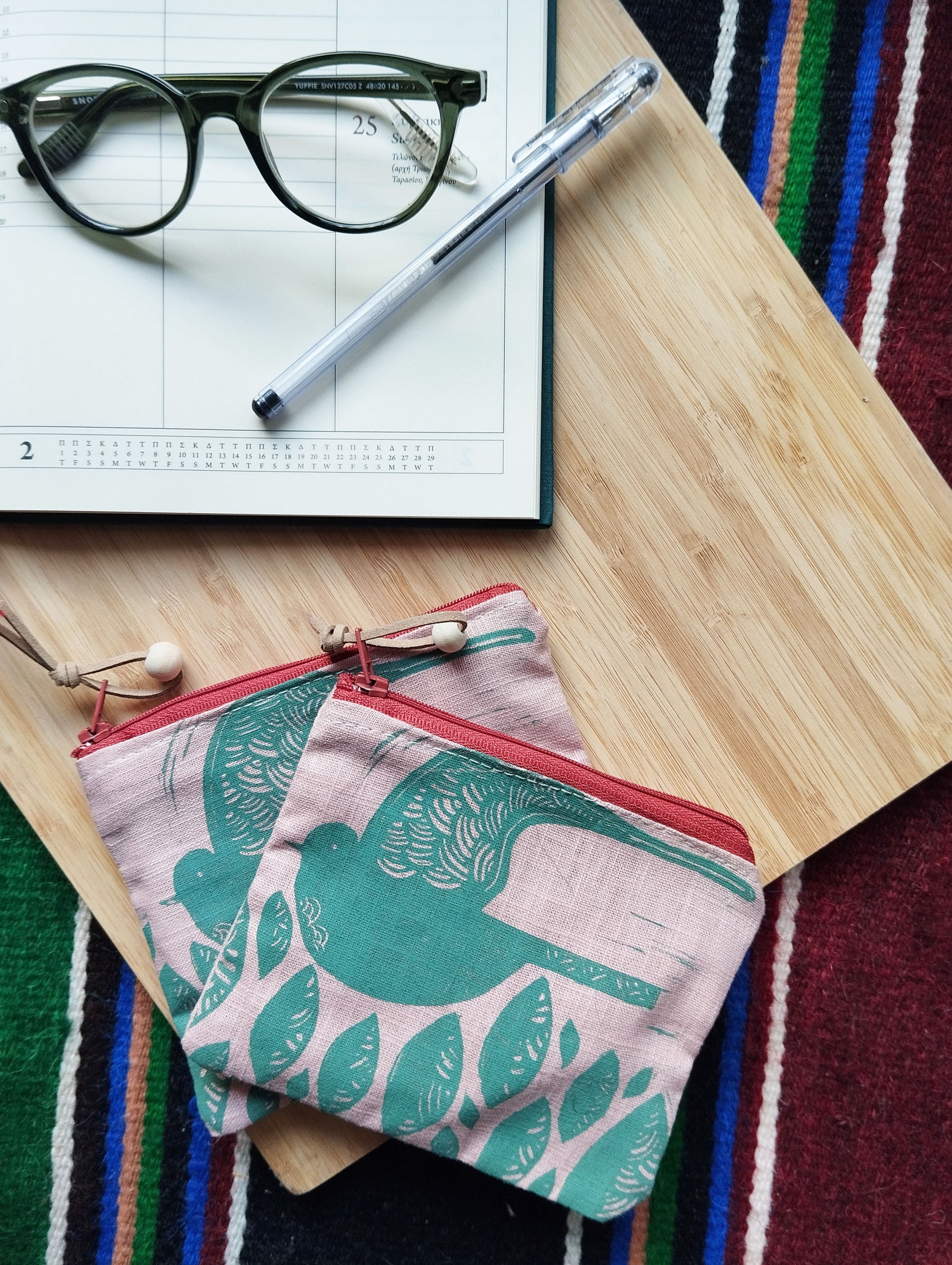 This beautiful folk bird linen purse is made from a beautiful powder pink linen and it is the perfect size to carry the bare necessities like your change, keys, lipstick and anything that needs a zipper.