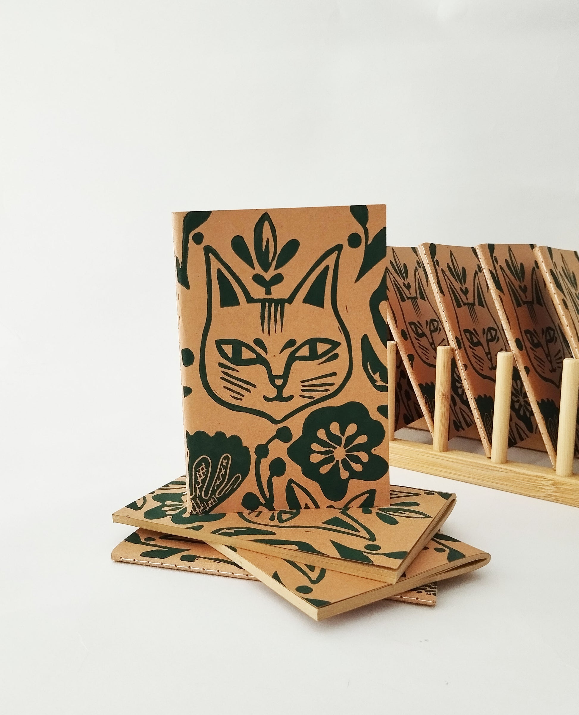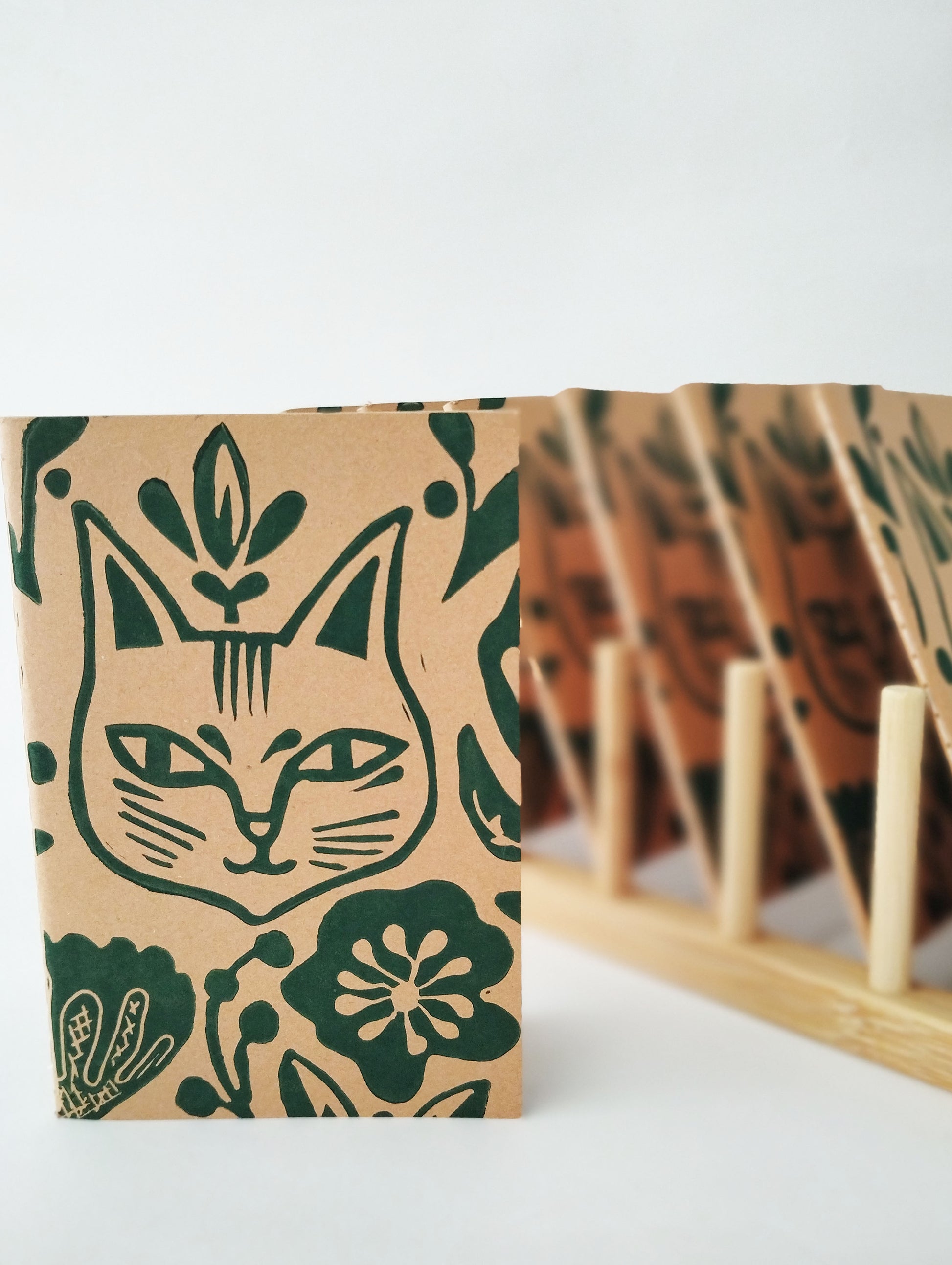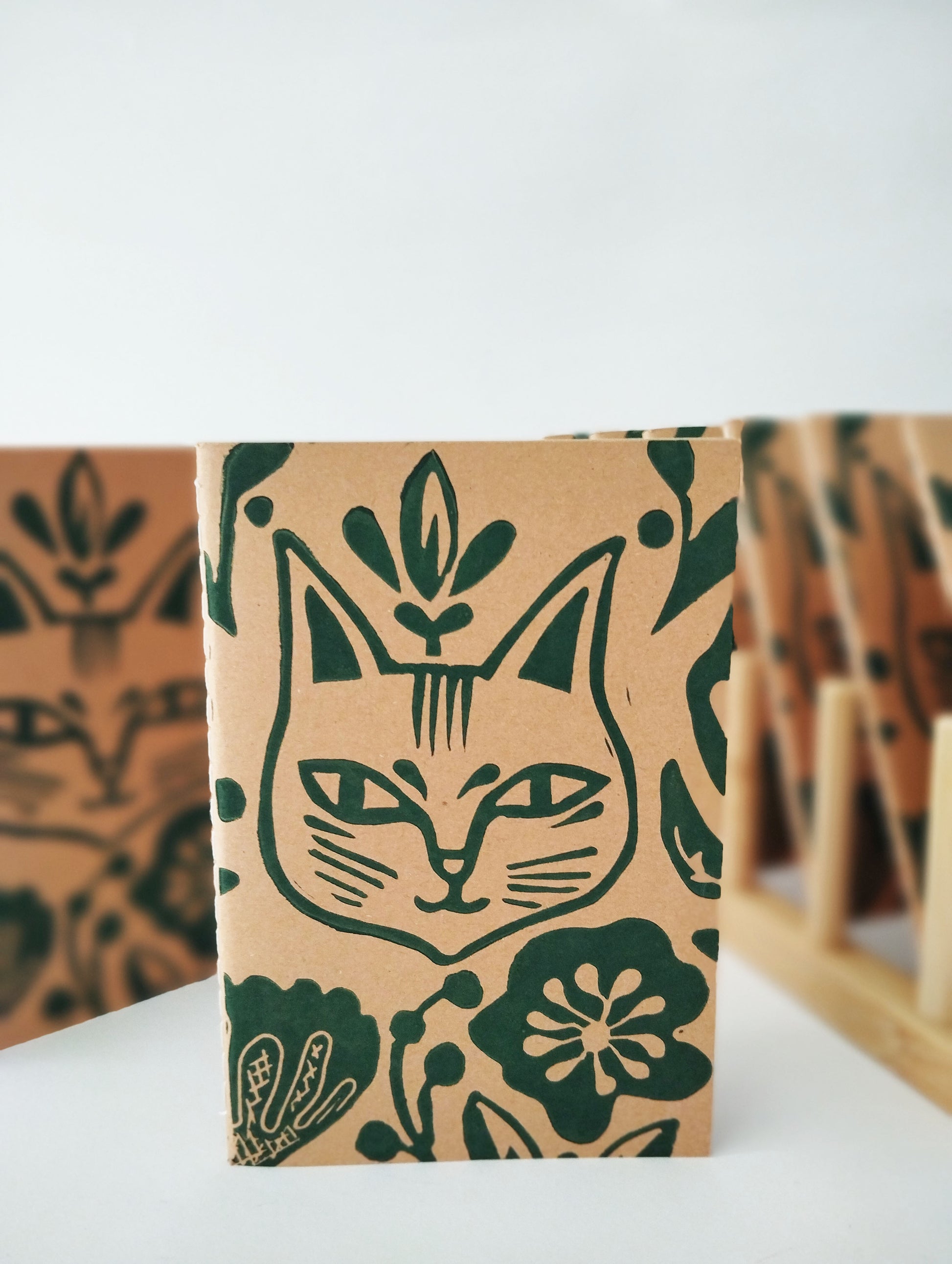 A6 kraft notebook with the most beautiful folk cat print. The cat and flowers are carved and printed entirely by hand, with original linocuts. This pocket size journal will make the perfect gift for your favorite cat lover person.