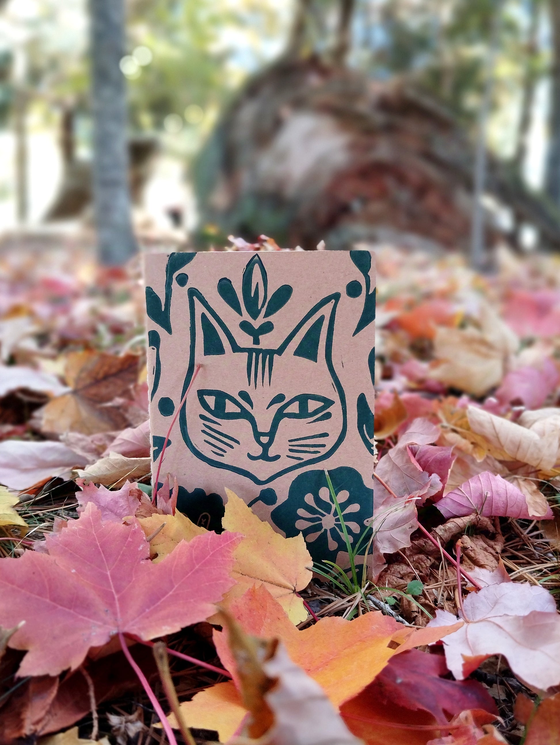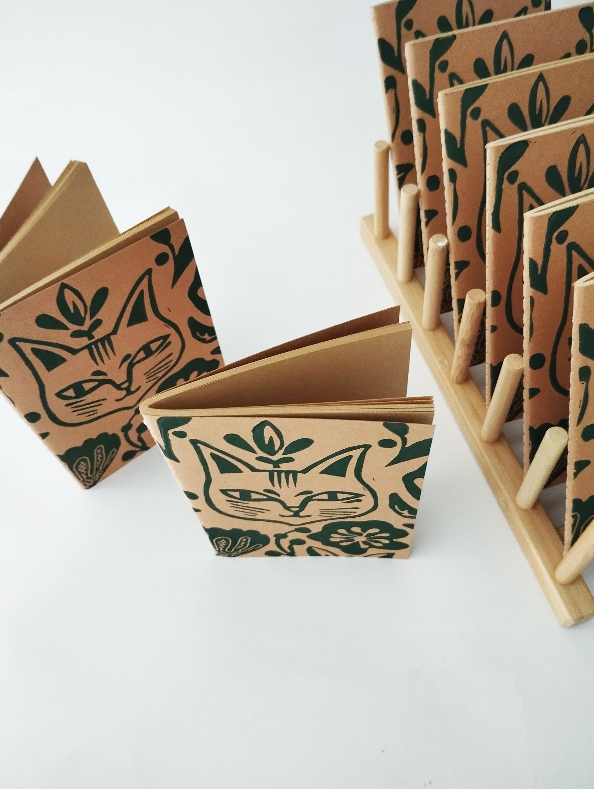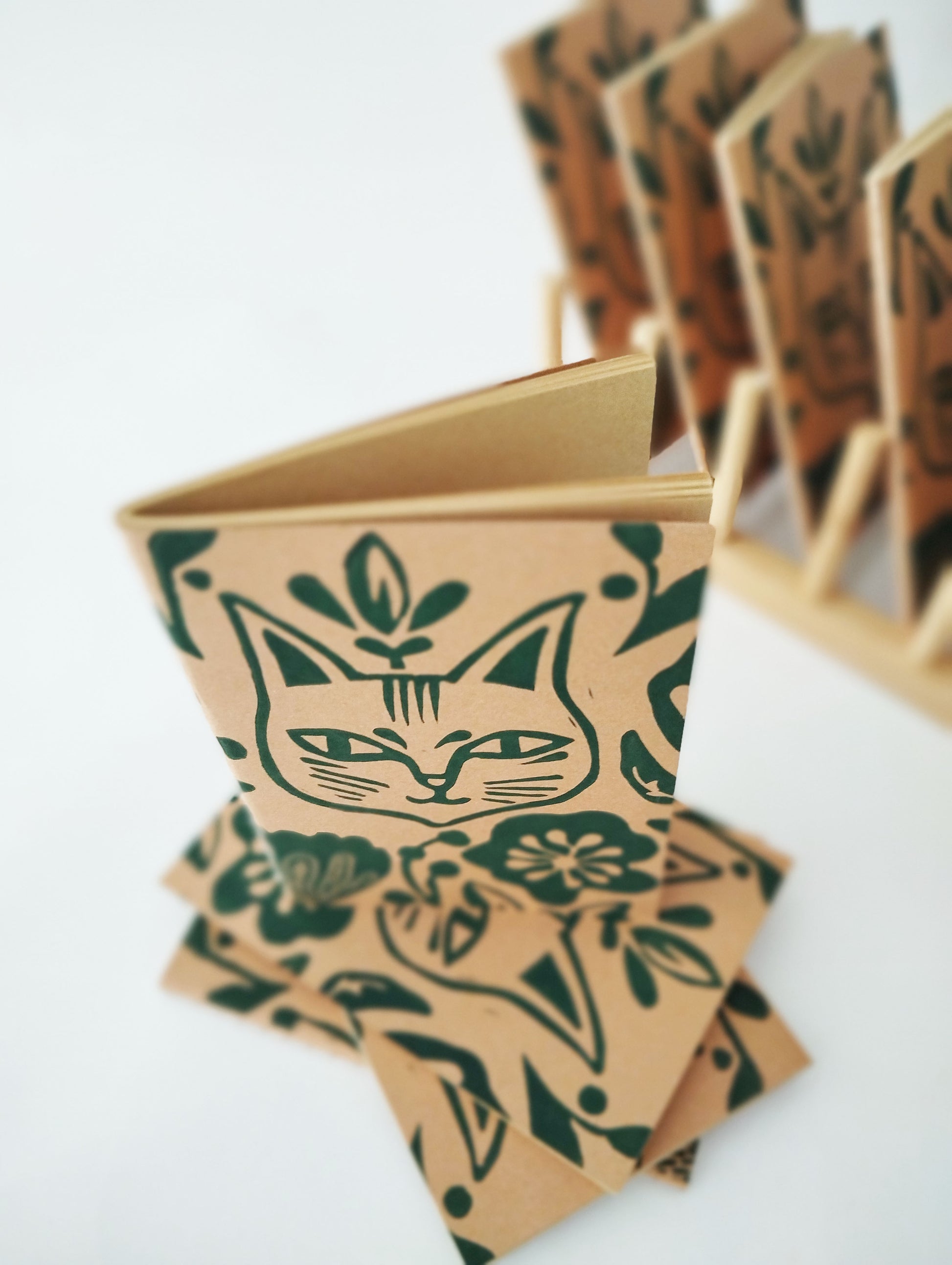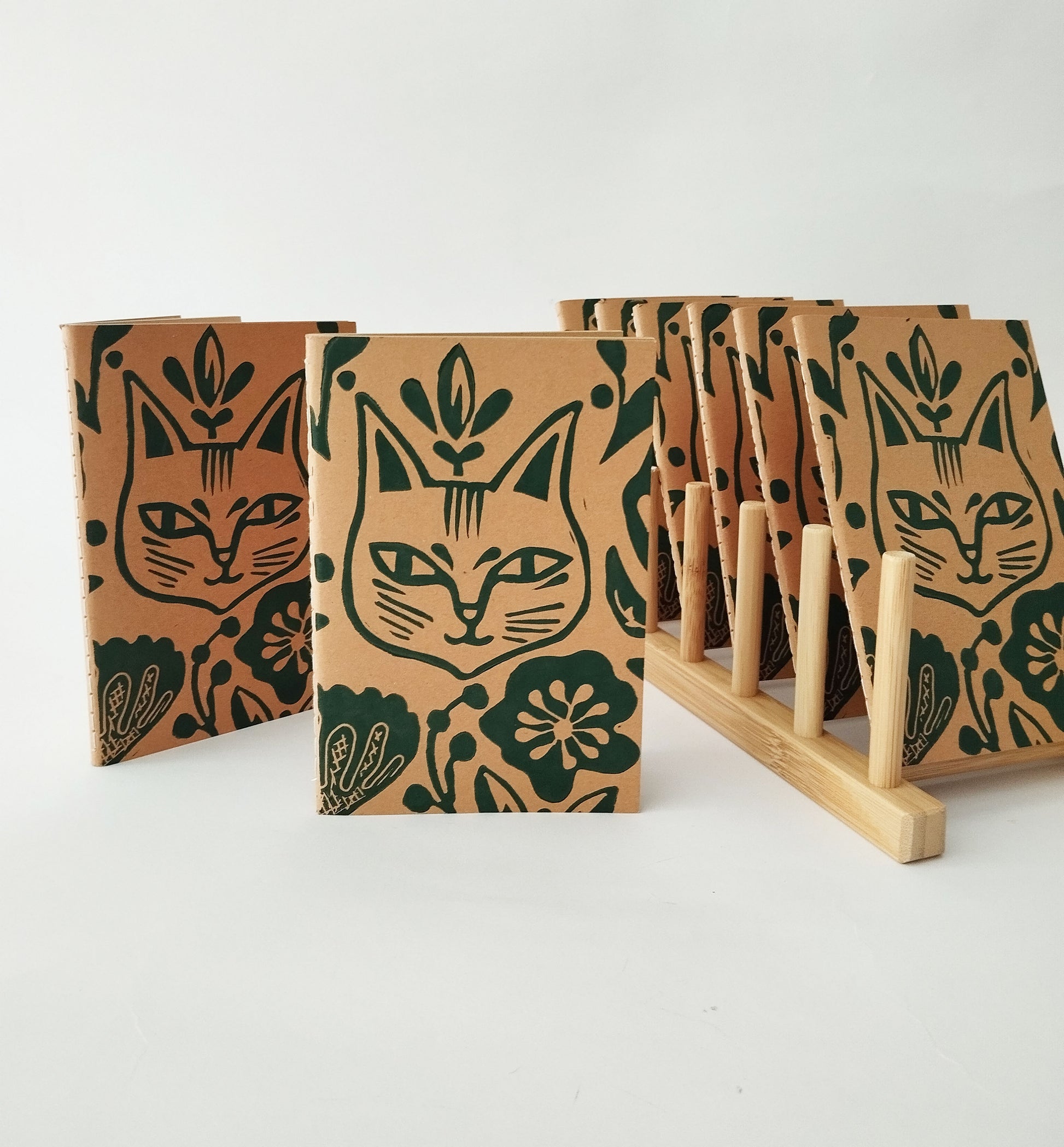 A6 kraft notebook with the most beautiful folk cat print. The cat and flowers are carved and printed entirely by hand, with original linocuts. This pocket size journal will make the perfect gift for your favorite cat lover person.