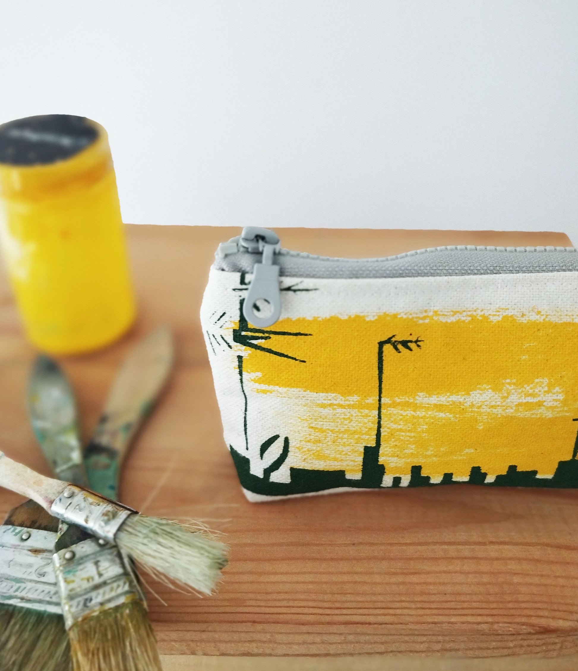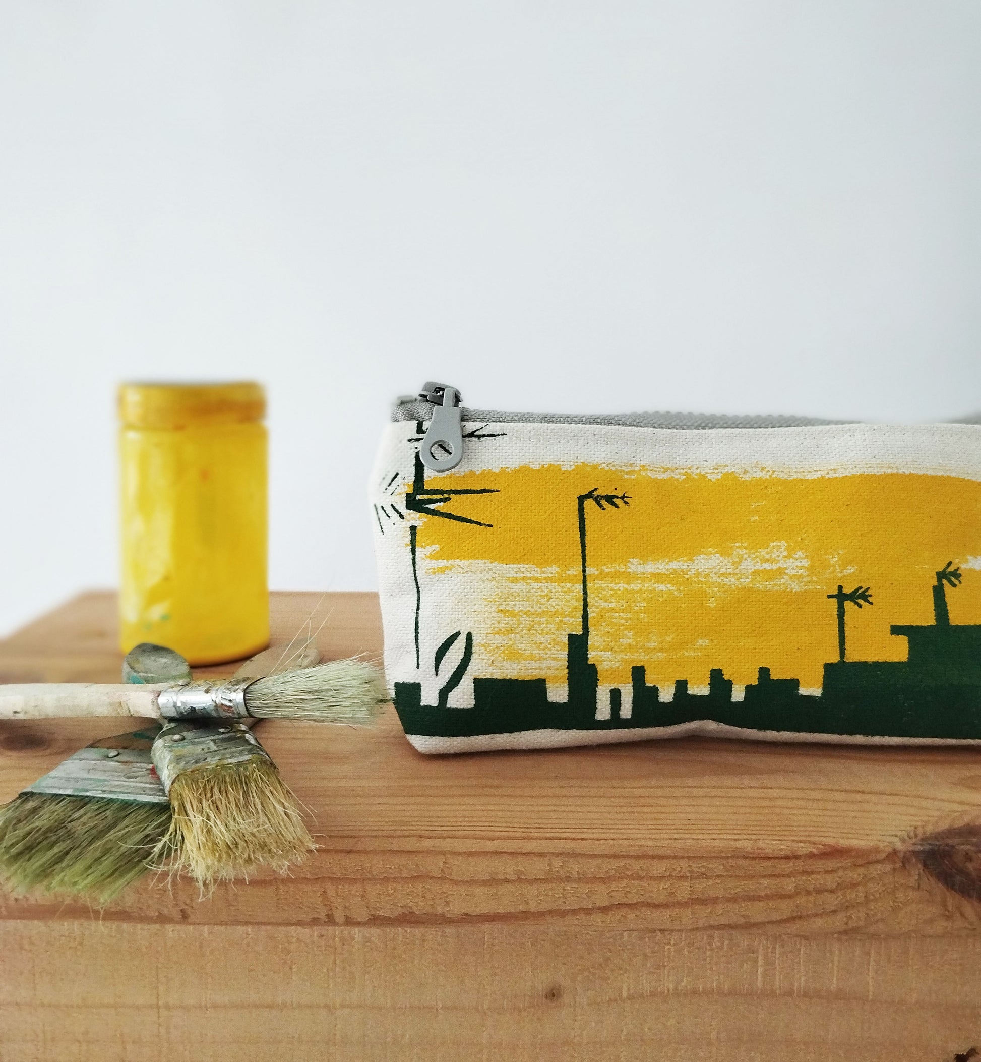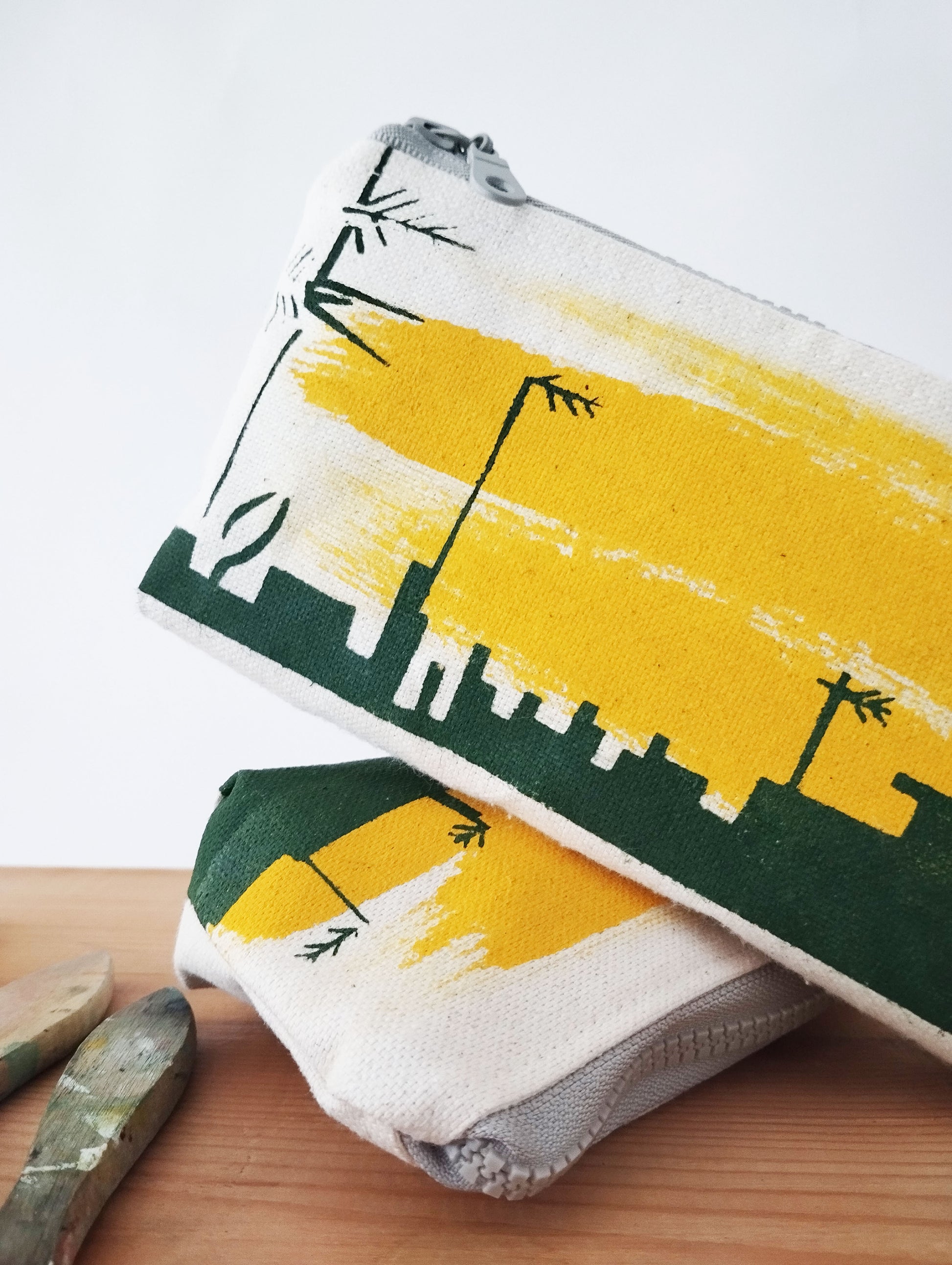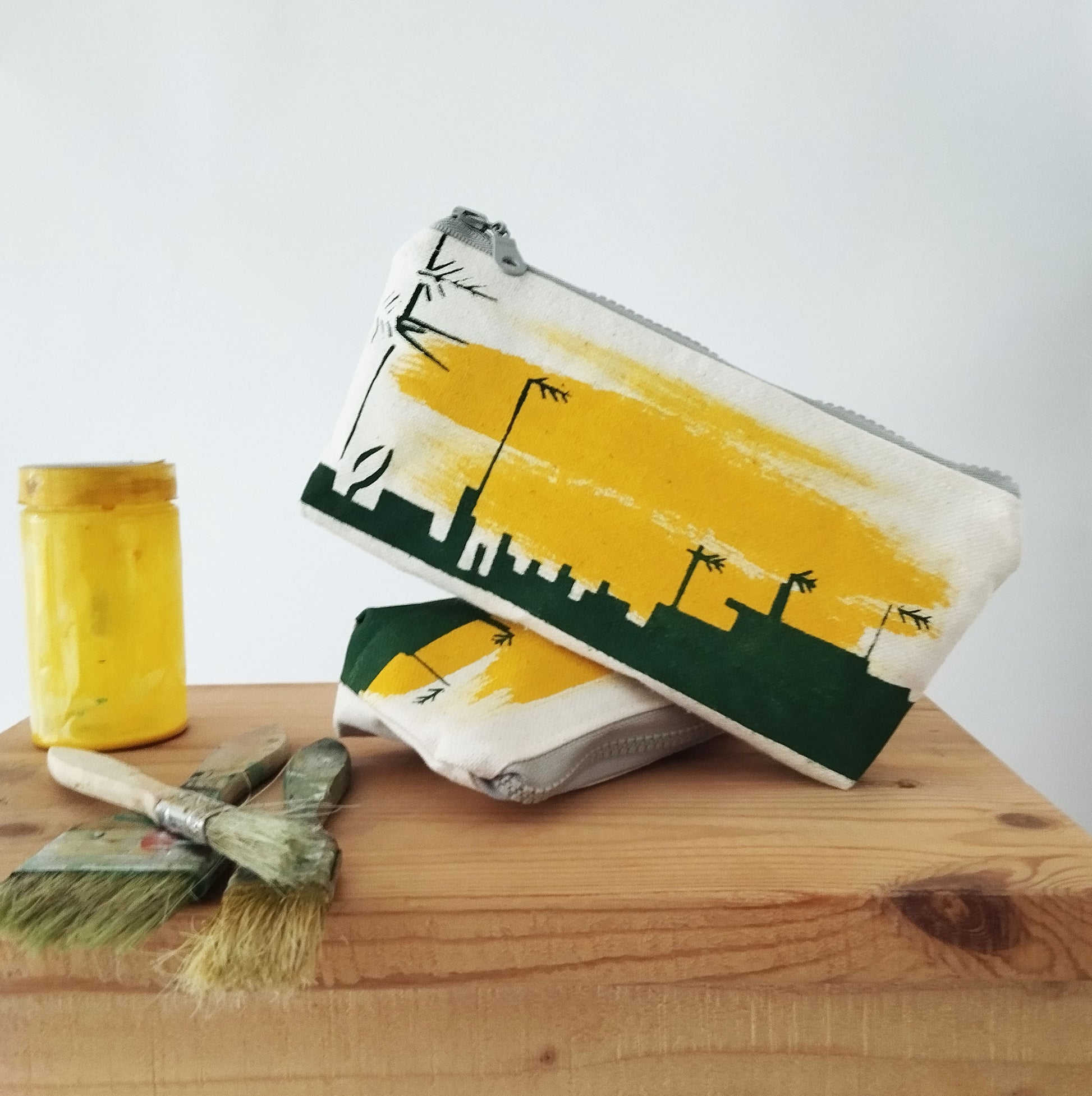 Dive into the vibrant essence of the city with this Hand Painted Cityscape Zipper Purse, a unique art cosmetic bag that beautifully captures the urban landscape of Athens rooftops. The colors are vibrant and the yellow brushstroke reflects the feeling of twilight in Athens.