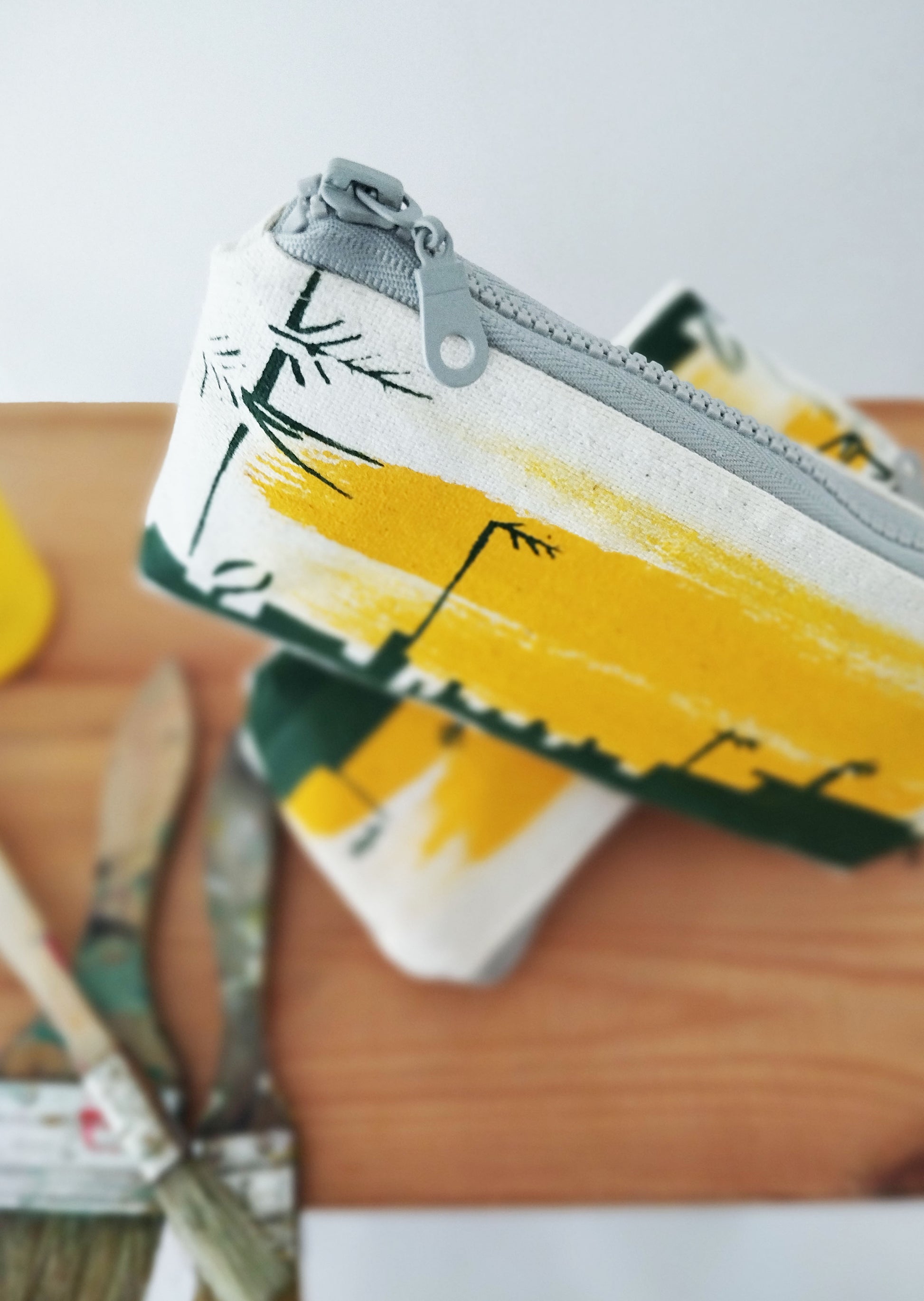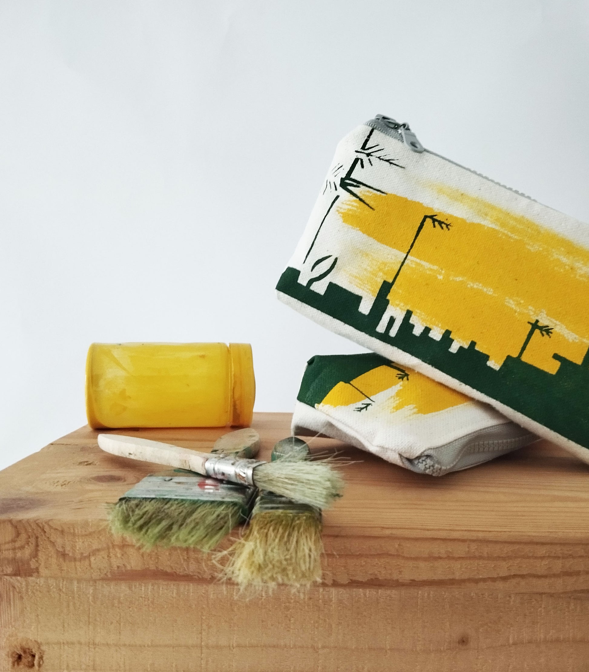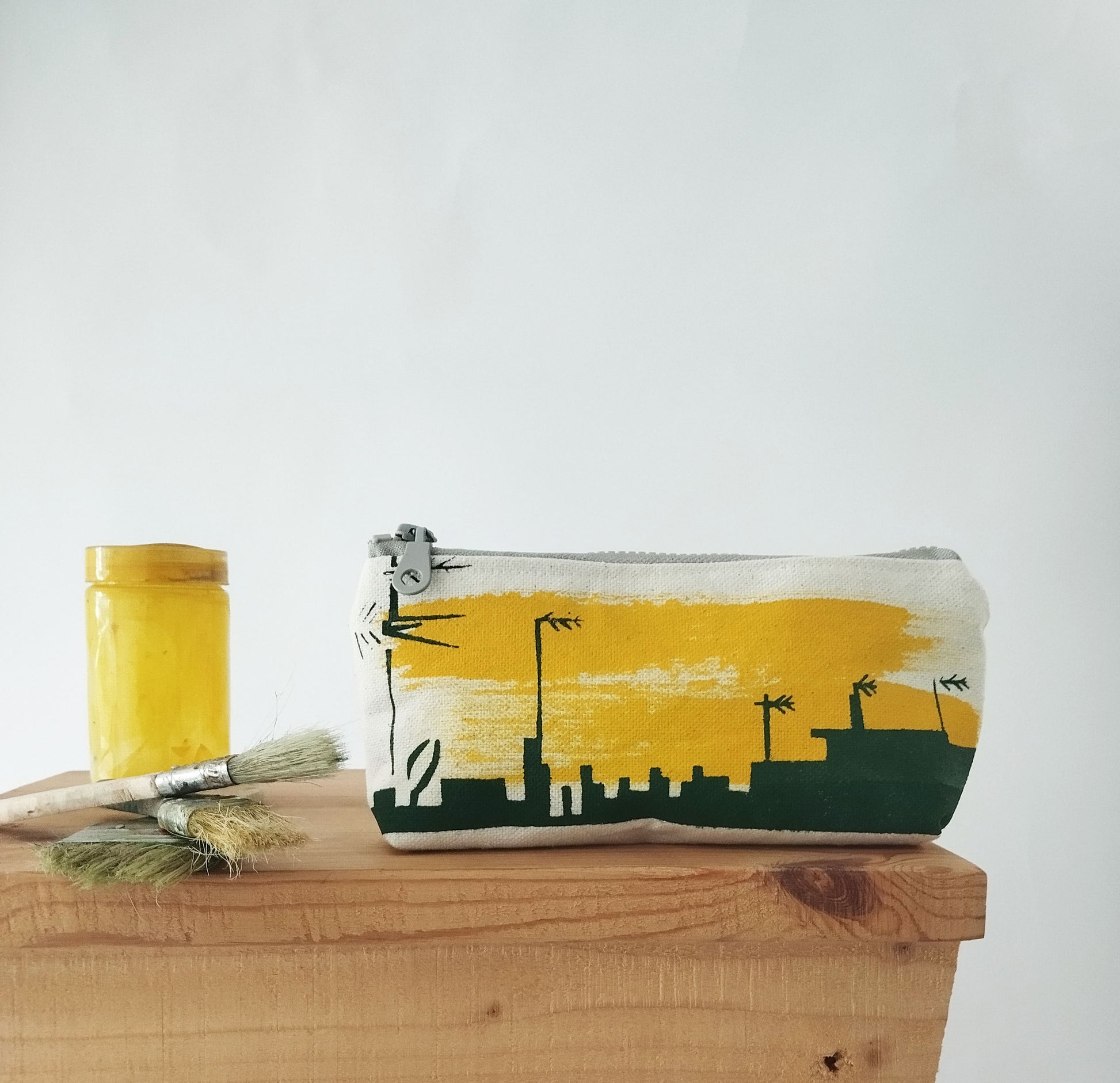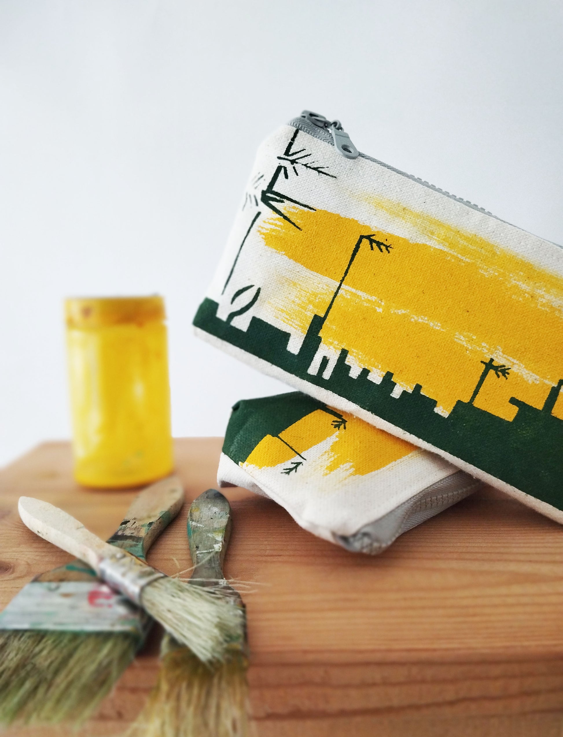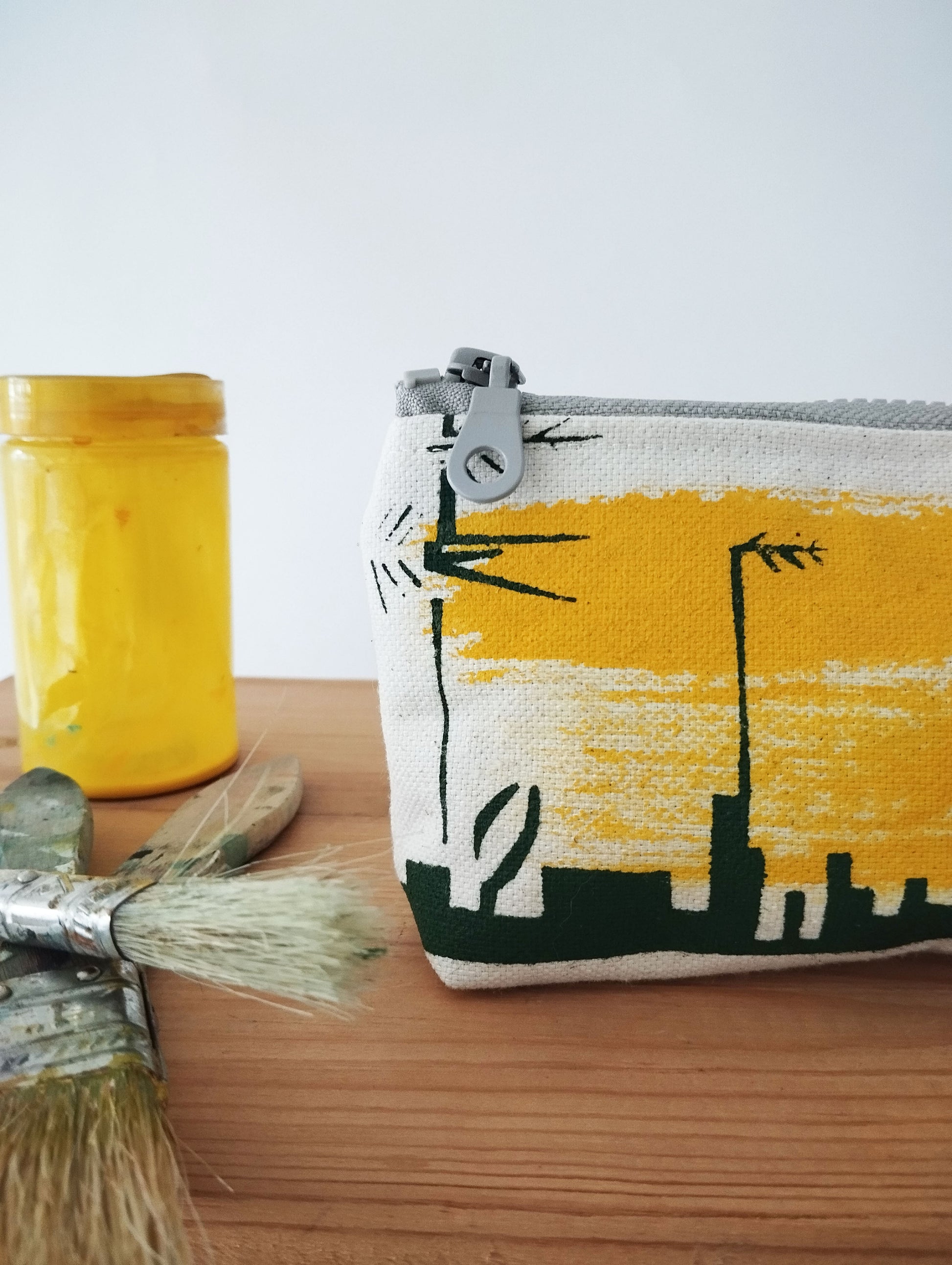 Dive into the vibrant essence of the city with this Hand Painted Cityscape Zipper Purse, a unique art cosmetic bag that beautifully captures the urban landscape of Athens rooftops. The colors are vibrant and the yellow brushstroke reflects the feeling of twilight in Athens.