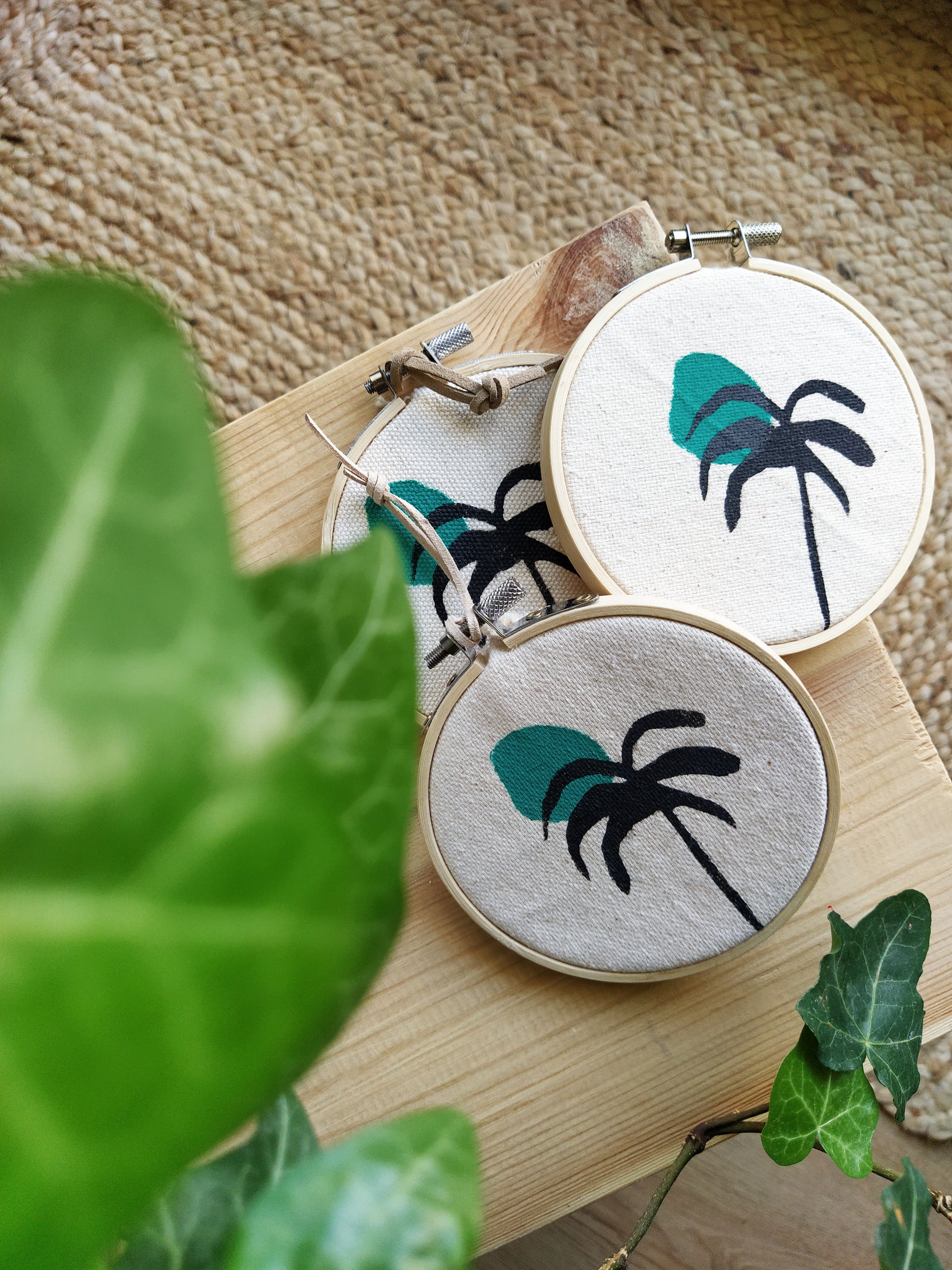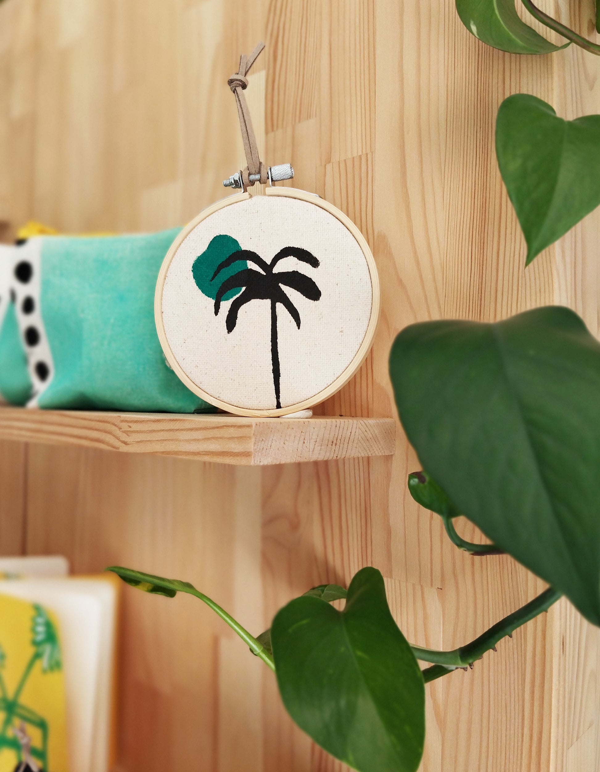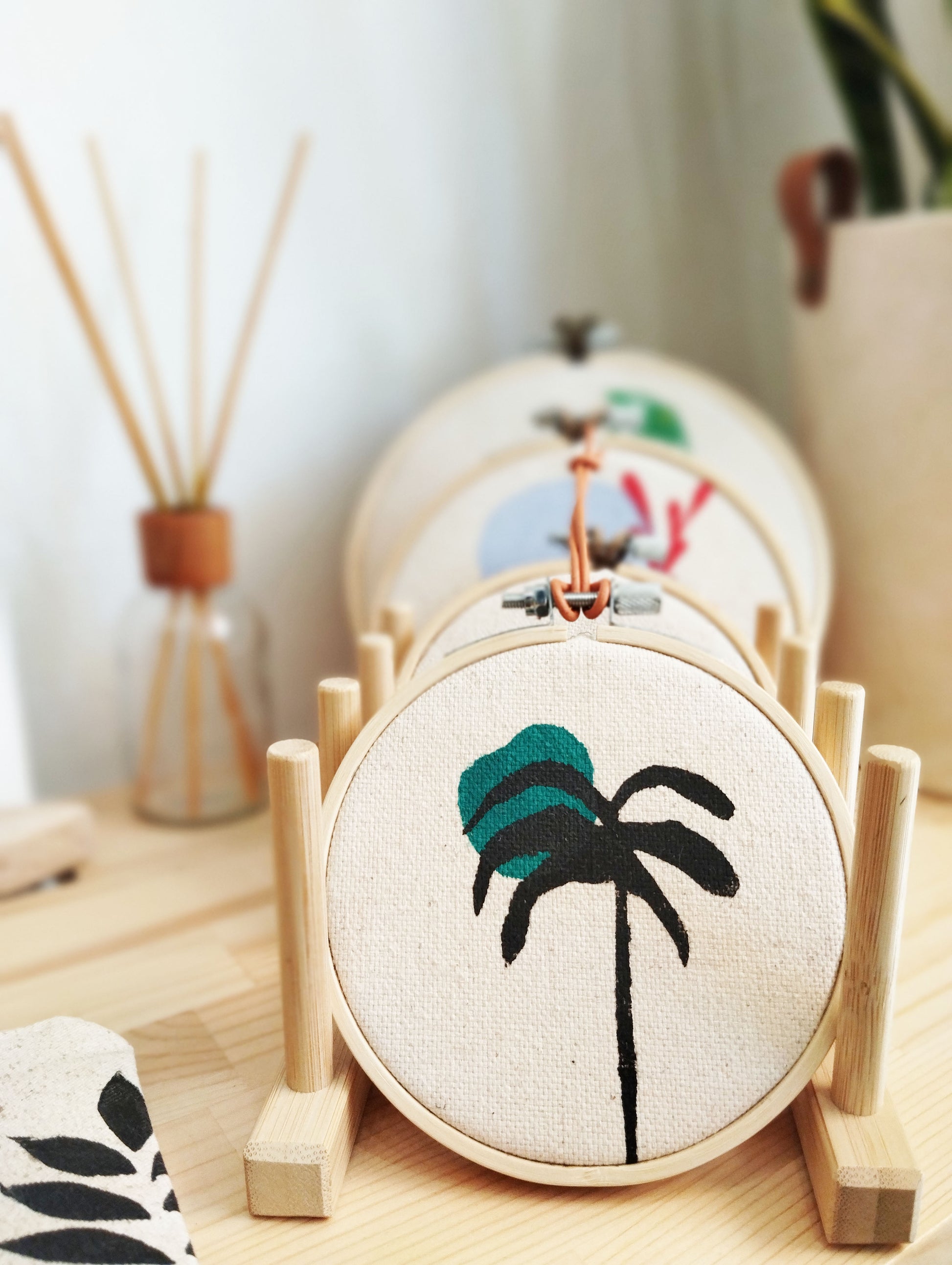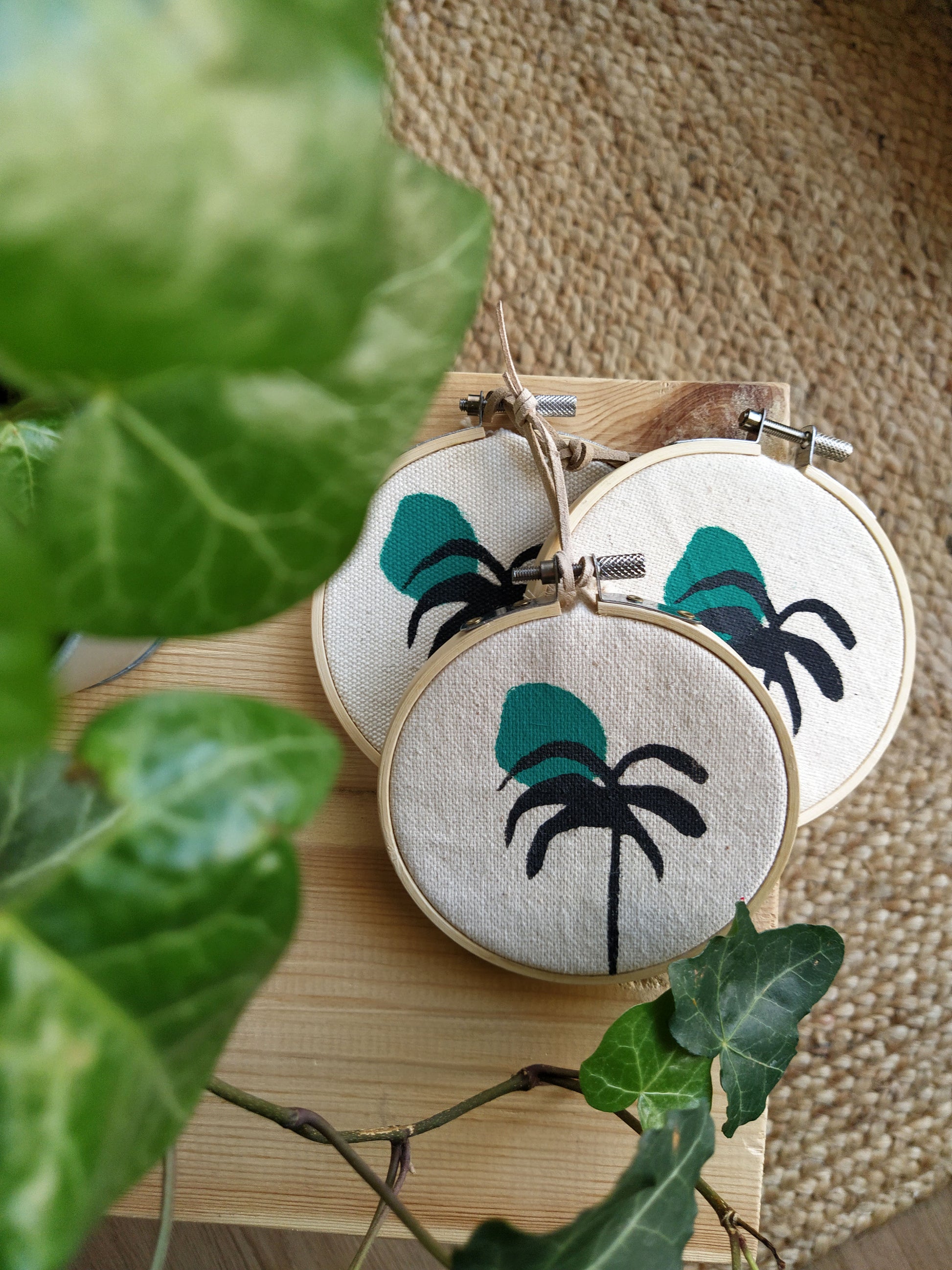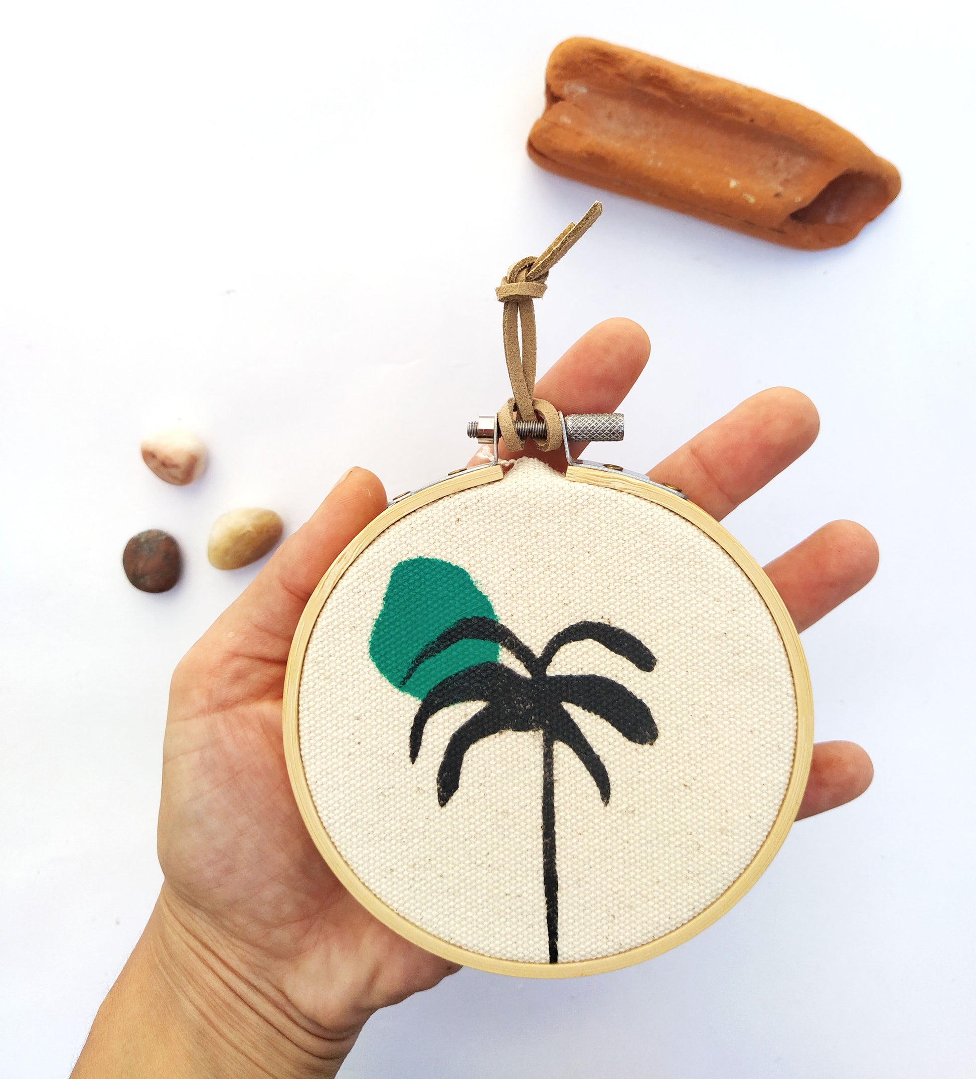 The print is made with original hand-cut stencils. The colors are vibrant and the minimla design of the palm tree adds to the uniqueness of this wall accent. It is beatifully framed in a bamboo embroidery hoop.