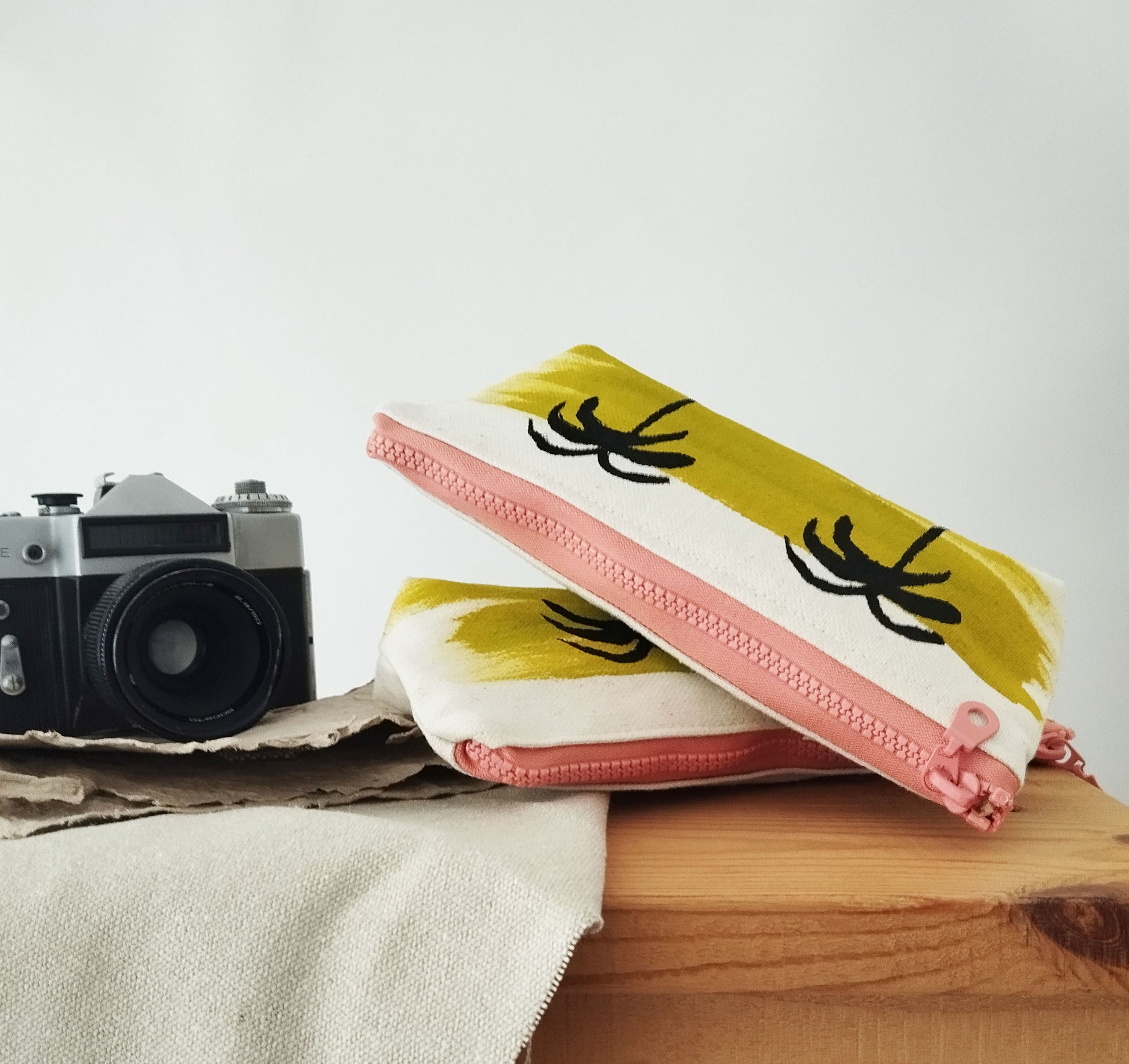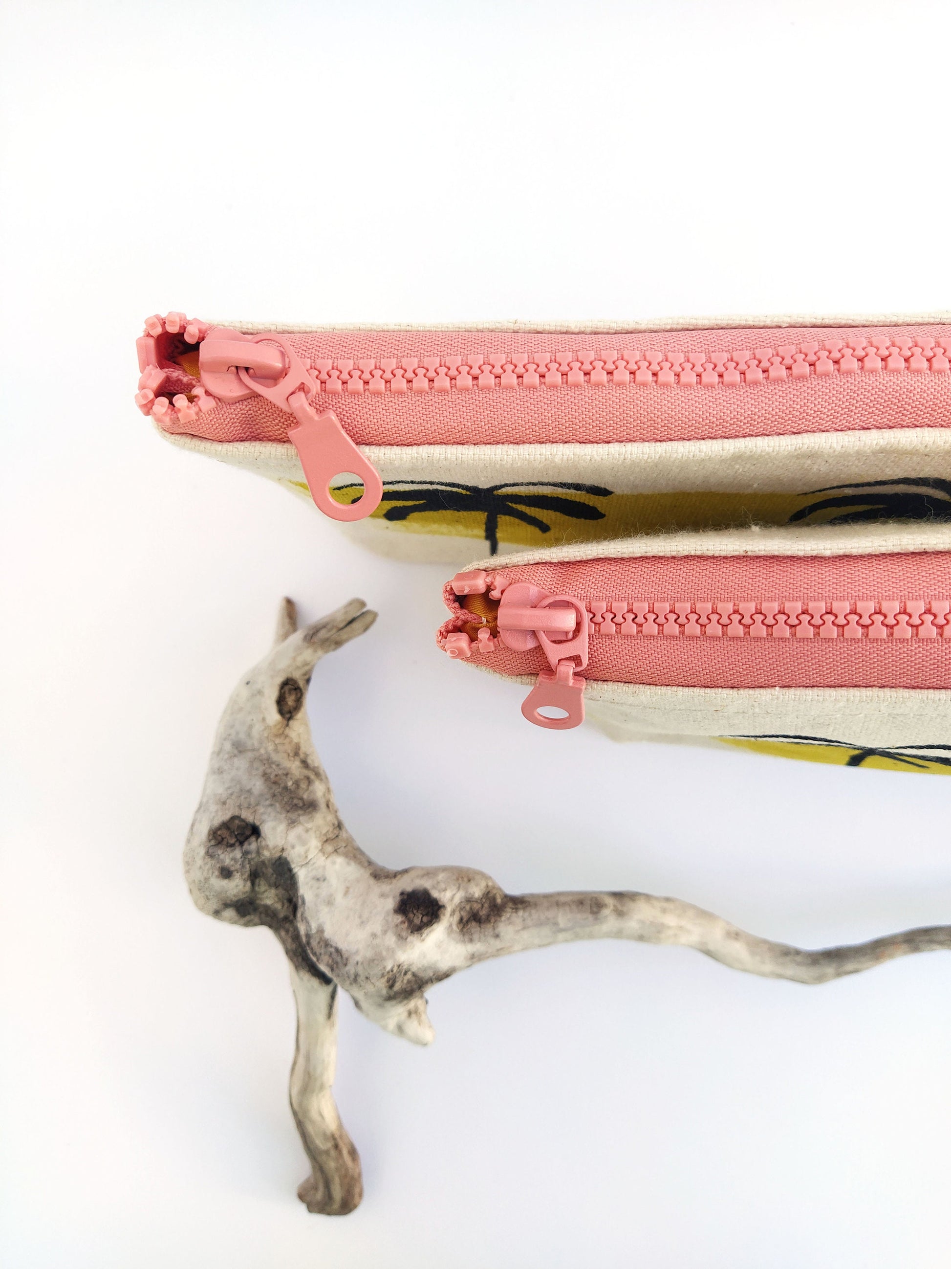 The print is entirely made by hand with water-based inks. The colors are vibrant and the pink/coral wide zipper makes it even more stunning. It feels like you carry a real piece of art.This tropical print bag organizer is handmade of 100% cotton canvas that will hold its shape in a perfect way. The box corners make it even more spacious.