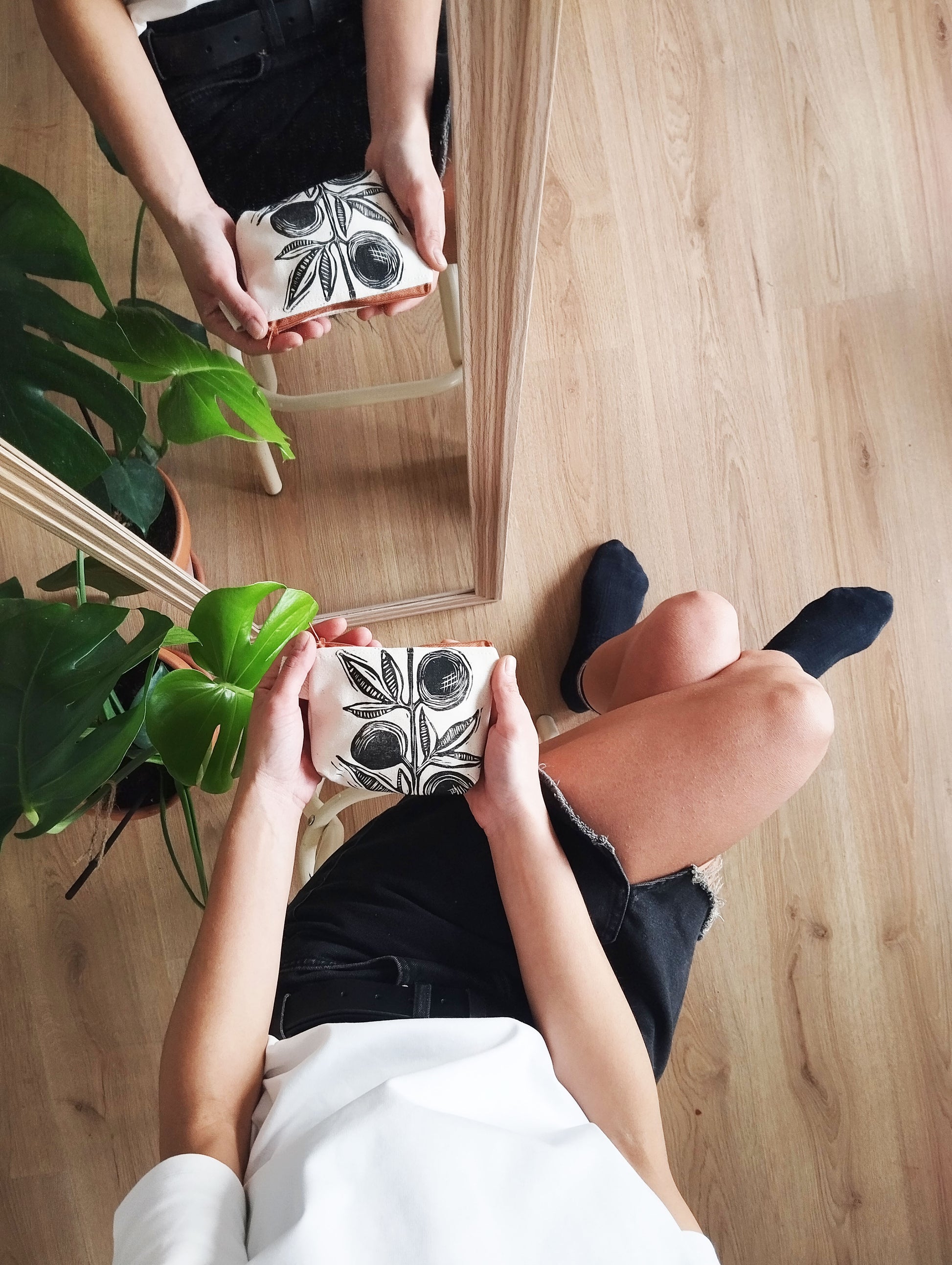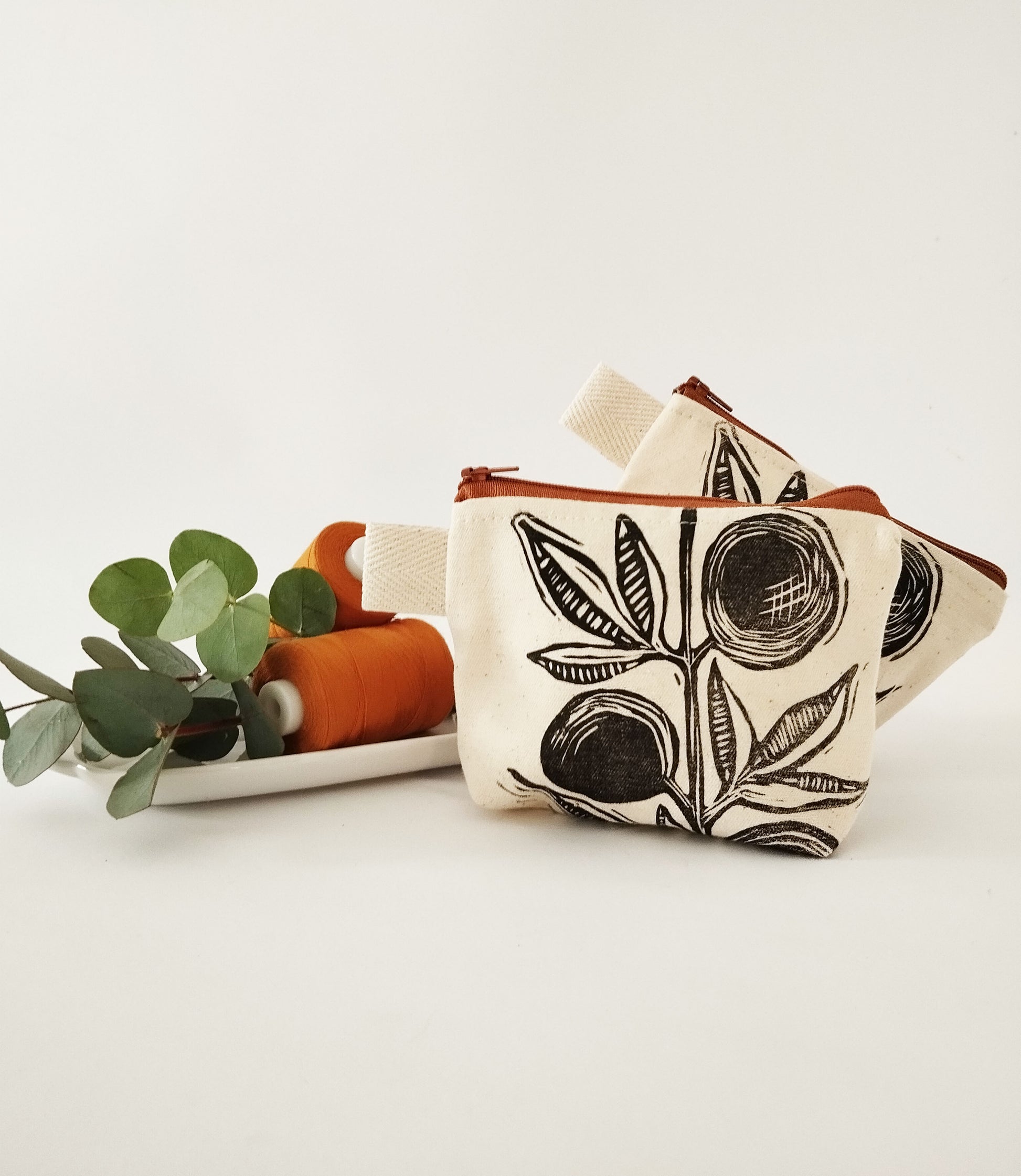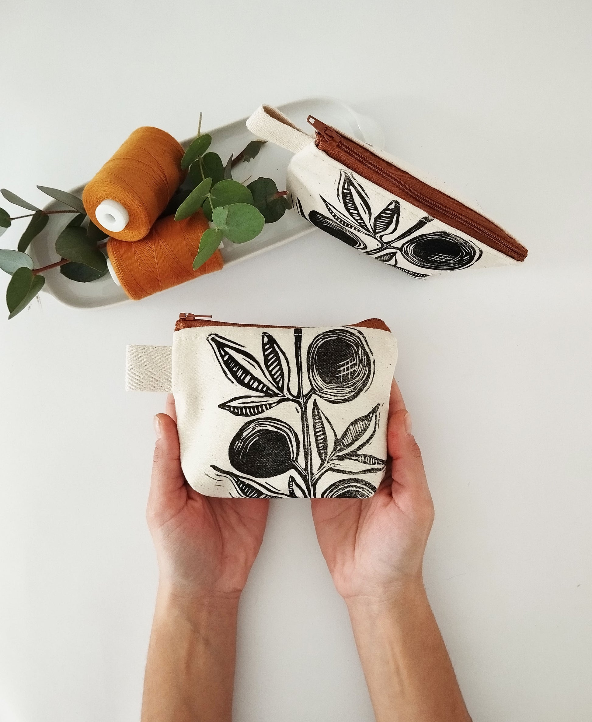 This small bag organizer is the perfect addition to your busy every day bag. It is handmade of 100% cotton canvas, that will hold its shape in a perfect way. The box corners make it even more spacious. The print is entirely made by hand with water-based inks and original linoprints.