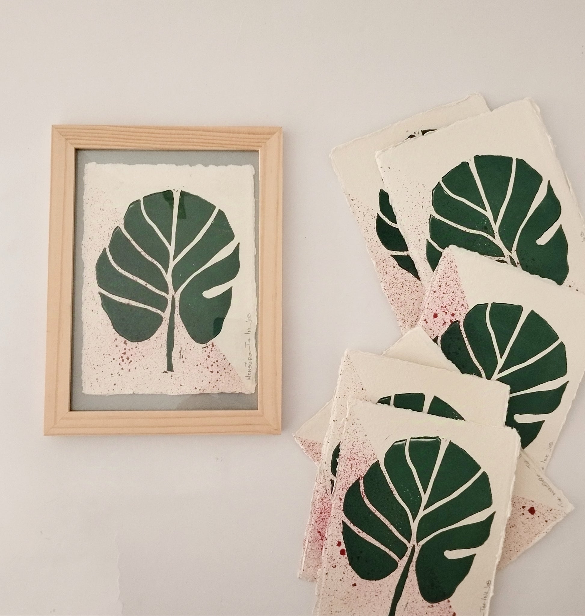 ‘Monstera’ is an original art print that beautifully captures a tropical essence and brings a minimal yet bold edge and creativity into your modern bohemian home. This is a linoprint entirely made and printed by hand on a beautiful, heavy handmade cotton paper. Each art print will vary slightly in texture and darkness making each piece of art unique.