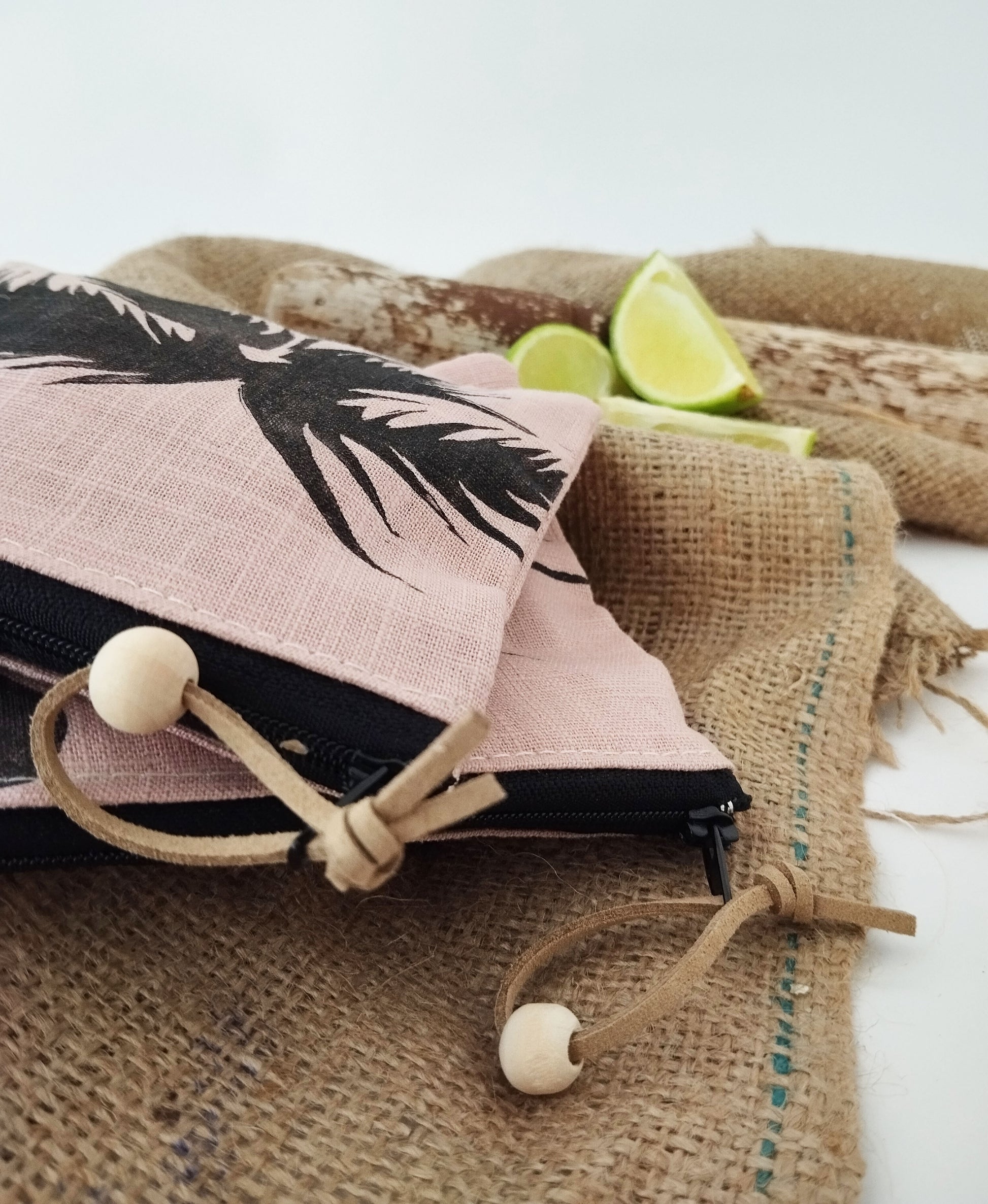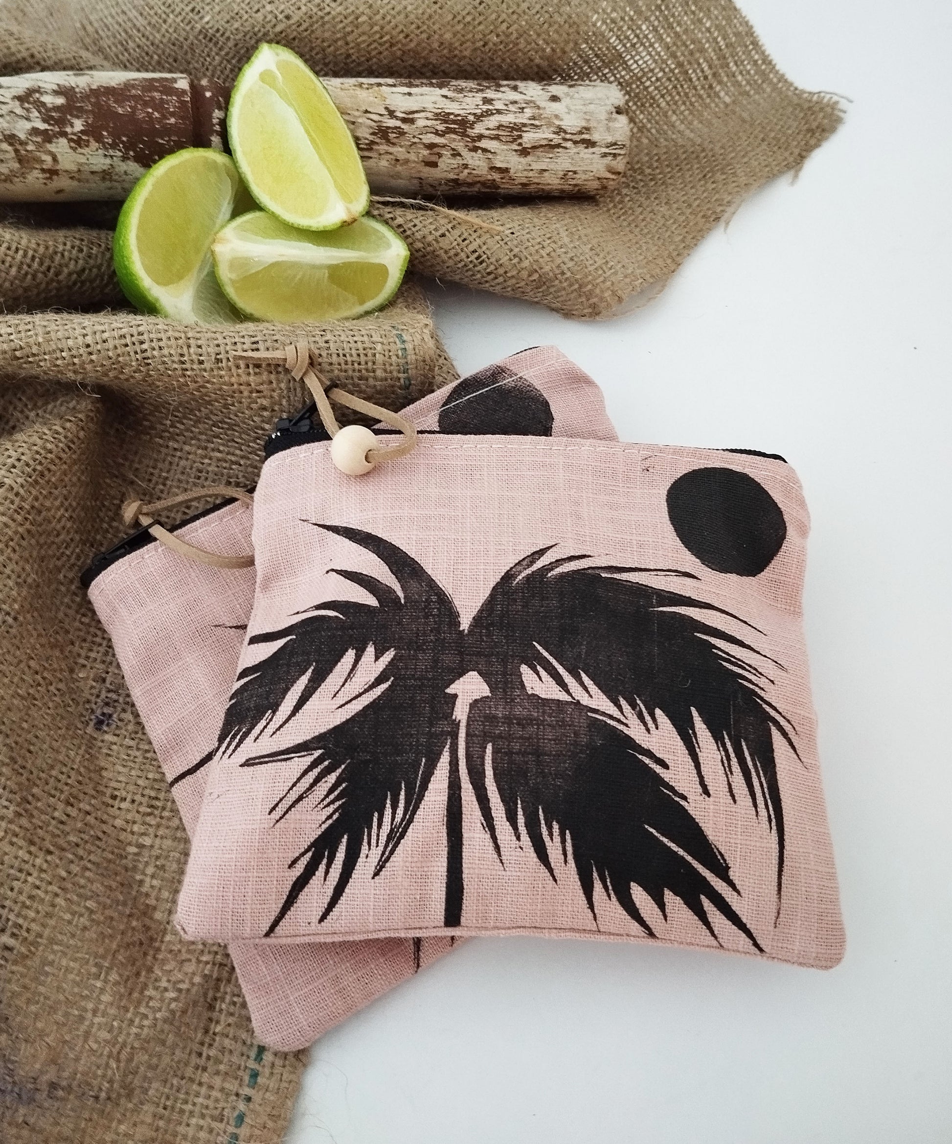 This beautiful palm tree linen purse is made from a beautiful powder pink linen and it is the perfect size to carry the bare necessities like your change, keys, lipstick and anything that needs a zipper.