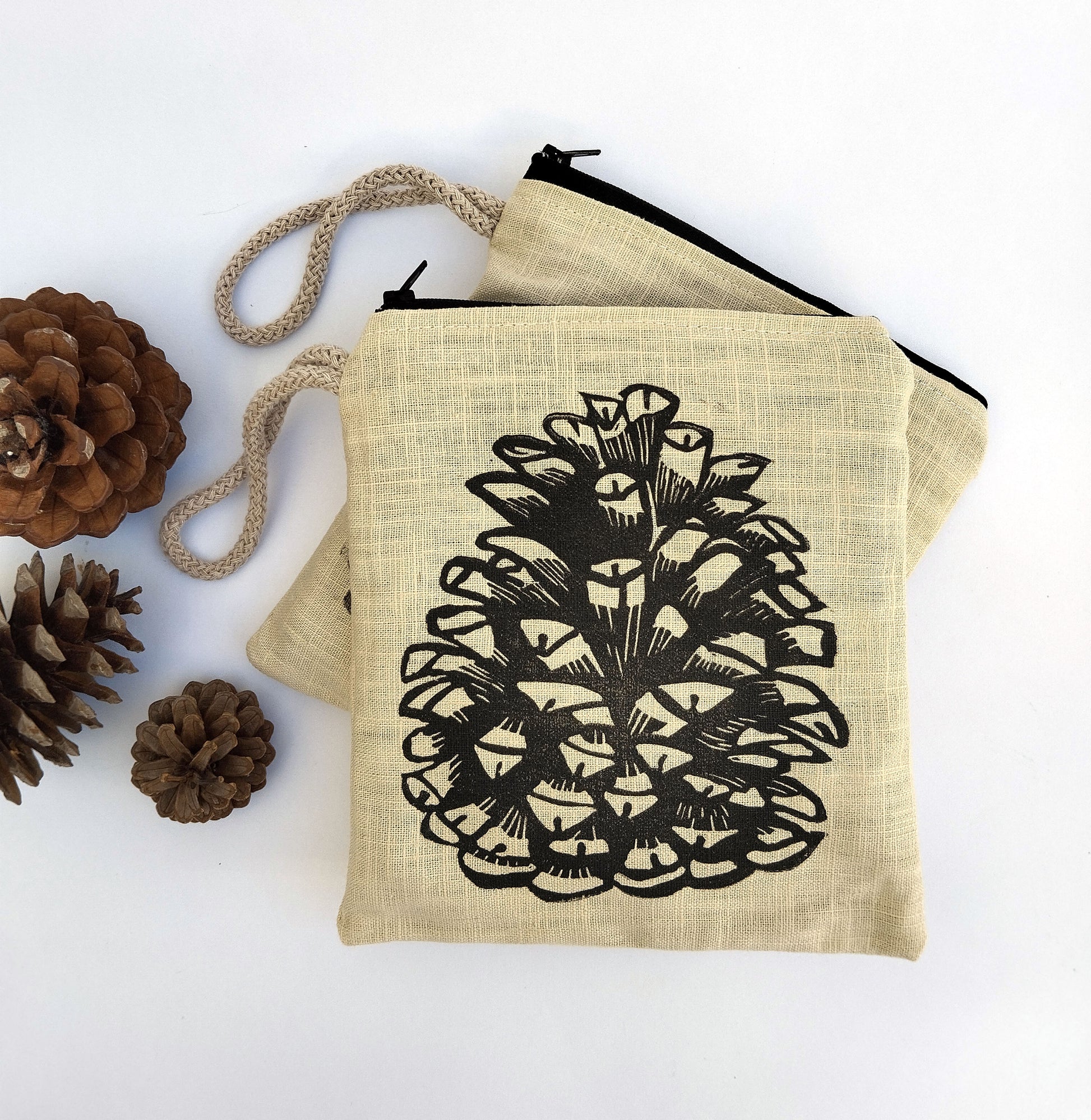 The pine cone design is carefully printed onto the linen, giving the bag a wonderfully rustic yet chic appeal. Whether you're buying it for yourself or as a gift for a nature-loving friend, this linen zipper purse is a beautiful testament to creativity and craftsmanship.