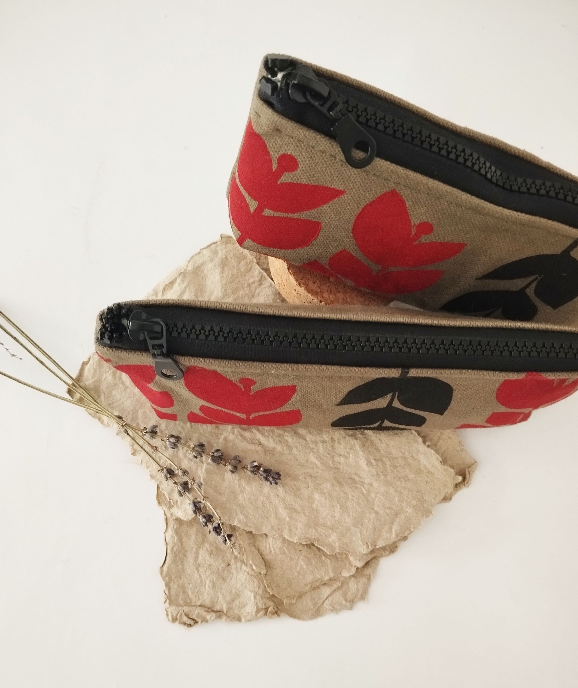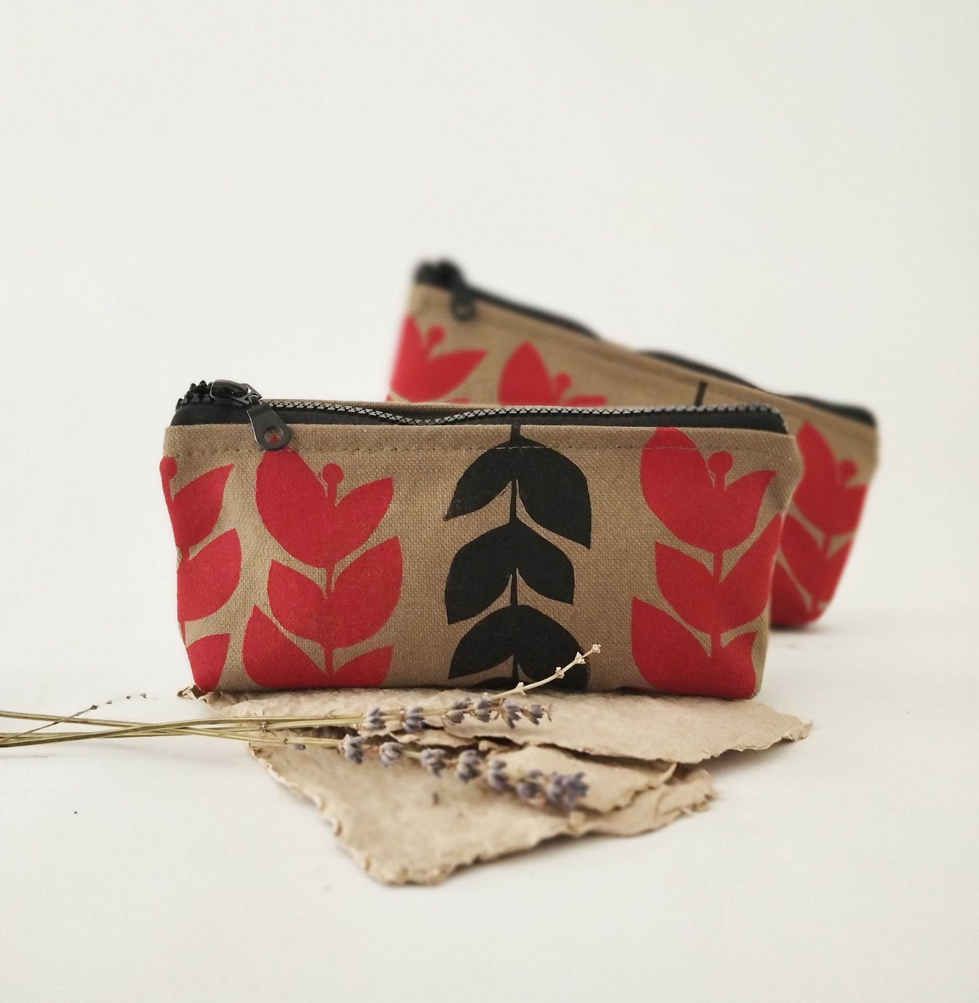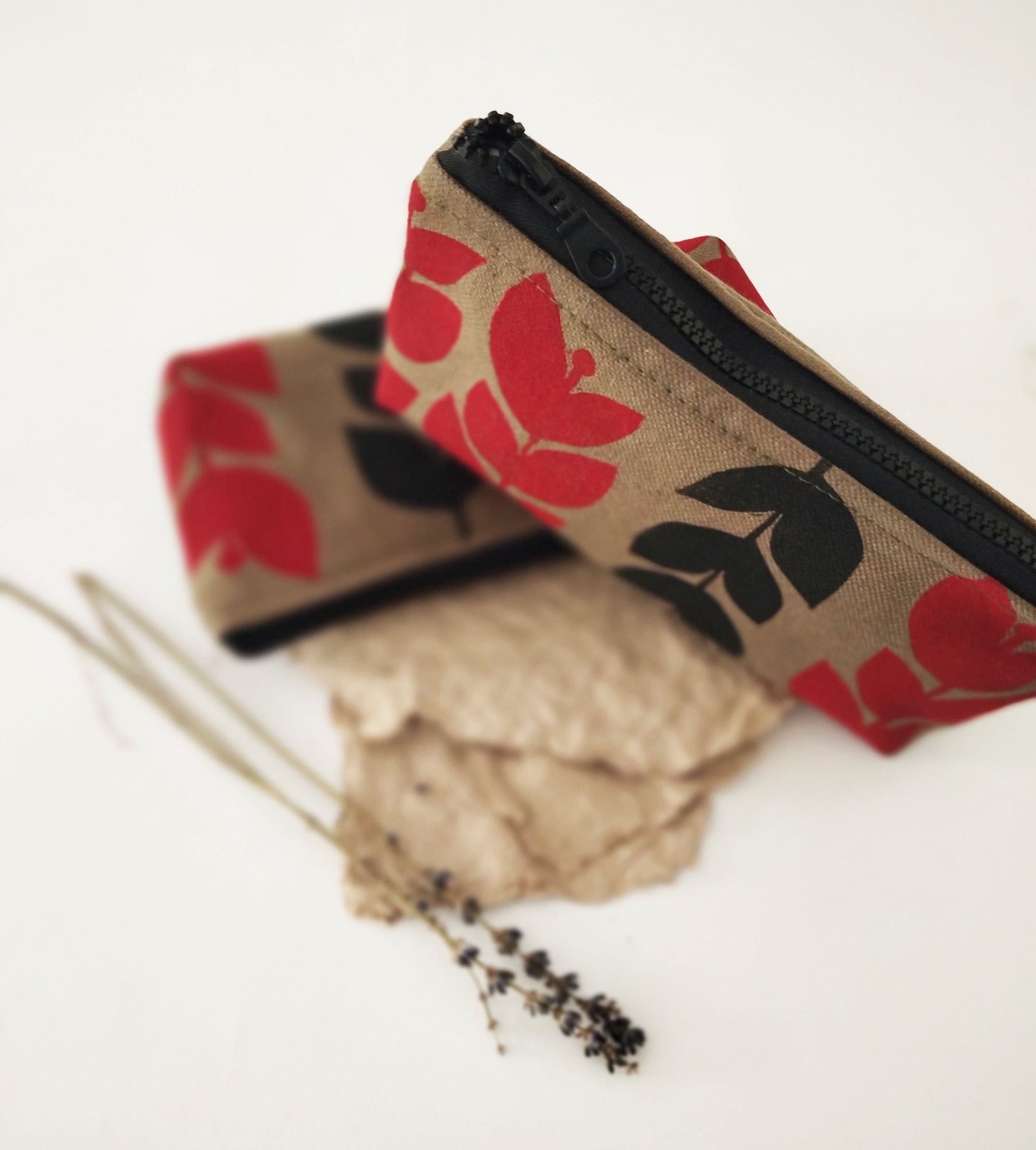 This elegant purse is entirely block printed by hand. The red and black flowers, inspired by retro Scandinavian design, have a classy and elegant effect. This bag organizer feels like you carry a real piece of art.
