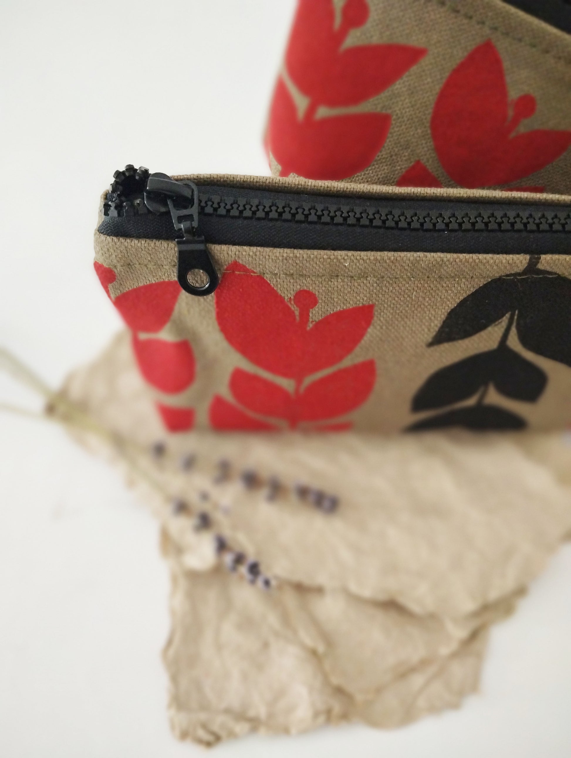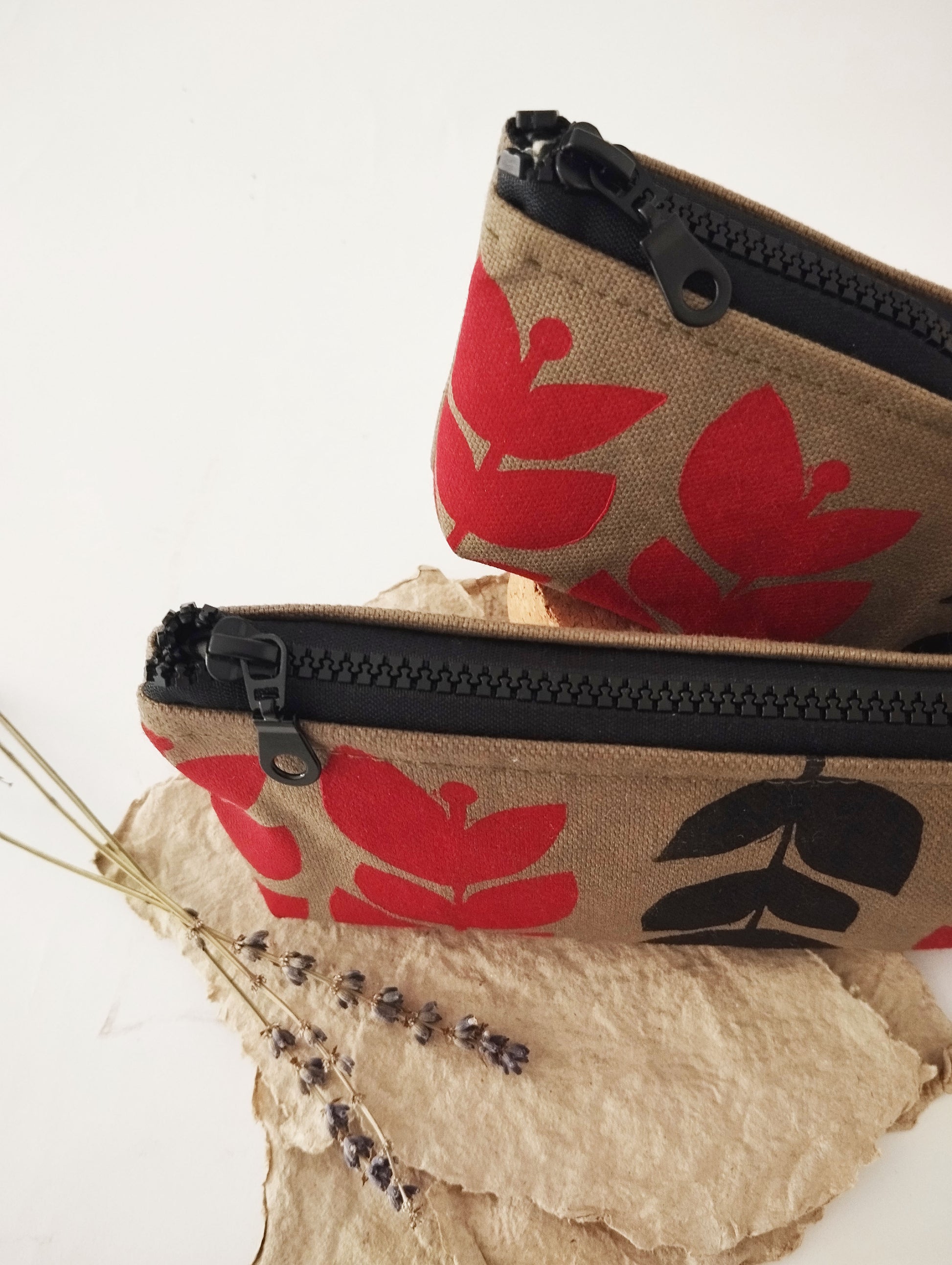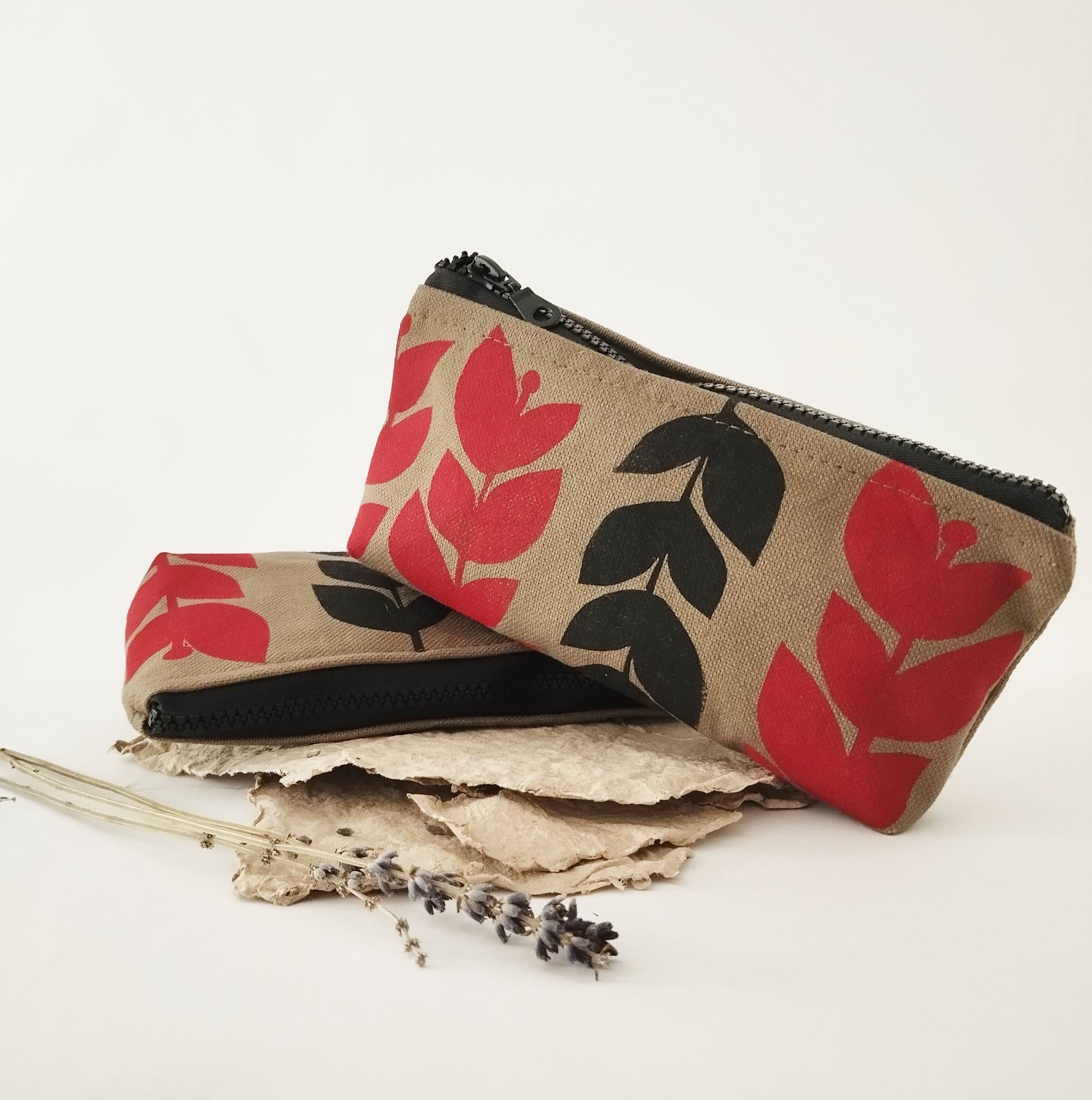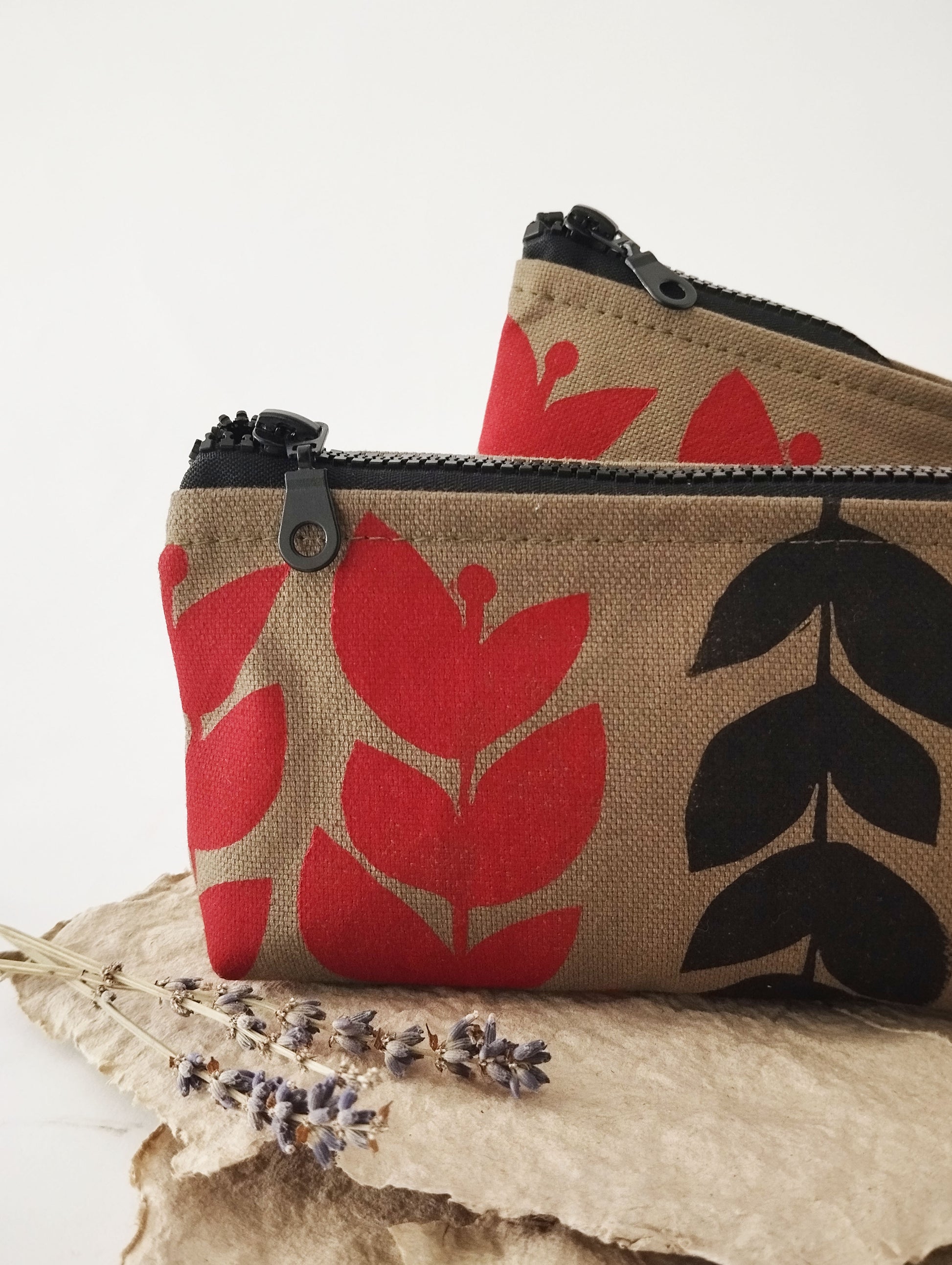 This elegant purse is entirely block printed by hand. The red and black flowers, inspired by retro Scandinavian design, have a classy and elegant effect. This bag organizer feels like you carry a real piece of art.