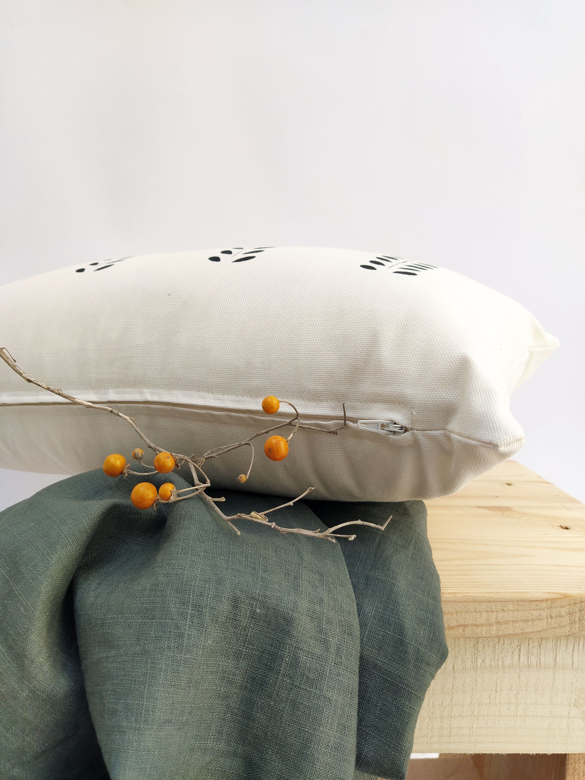 This decorative cushion cover is made of an exquisite quality off-white cotton canvas. It is hand printed with original hand-cut stencils. The colors are bright and the thoughtful design is what makes it distinguish. The beautiful fabric and print will look gorgeous in any room. The zipper of the cover is hidden at the bottom of the pillow.