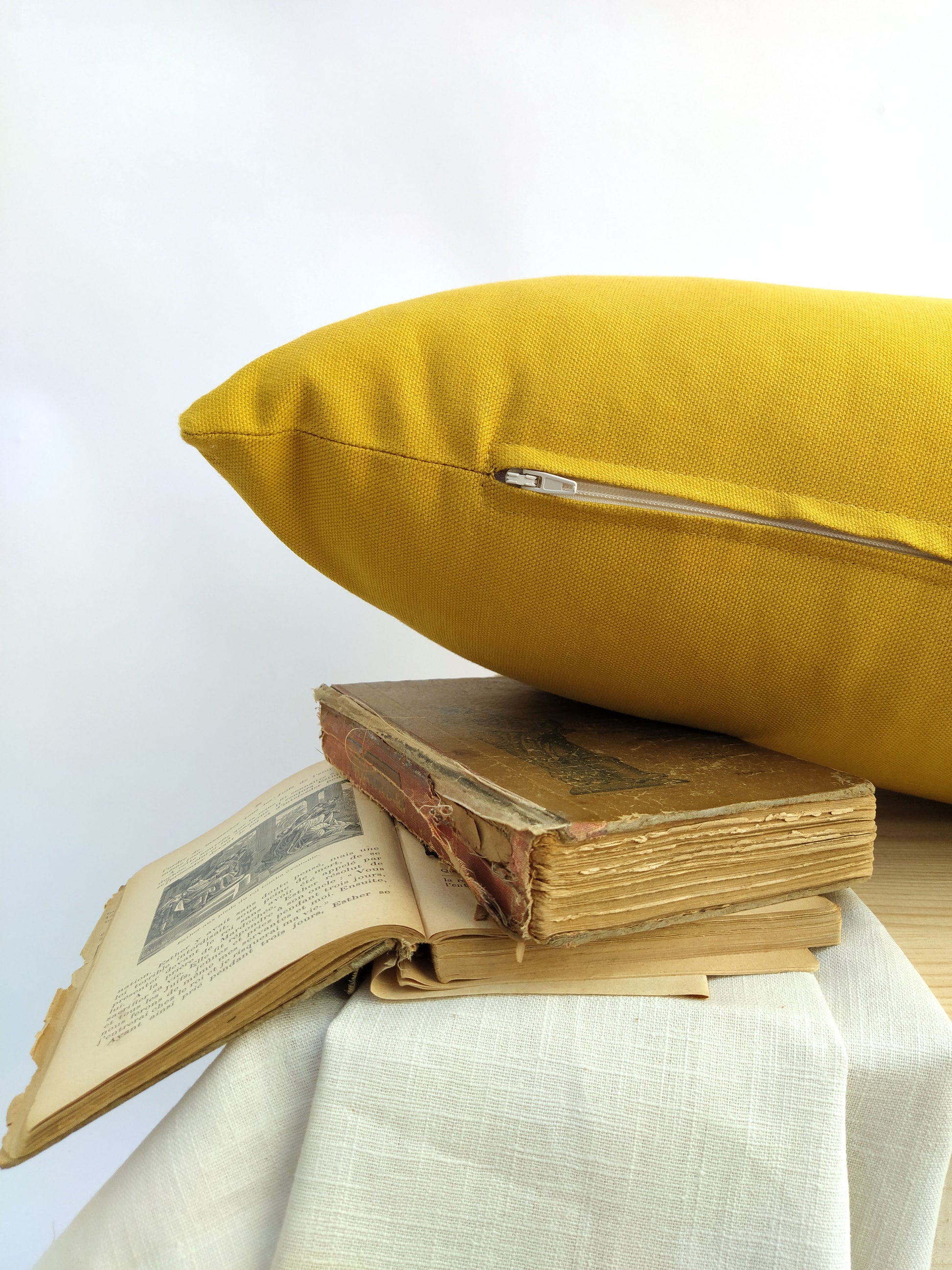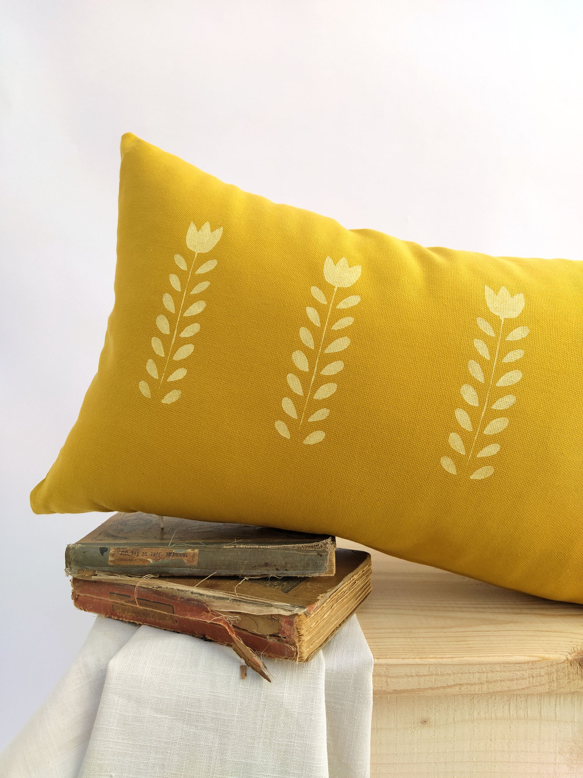This decorative cushion cover is made of an exquisite quality mustard yellow cotton canvas. It is extremely soft and comfortable. The minimal floral print is made by hand with original hand-cut stencils. The colors are bright and the thoughtful design is what makes it distinguish. The awesome fabric and print will look gorgeous in any room. The zipper of the cover is hidden at the bottom of the pillow.