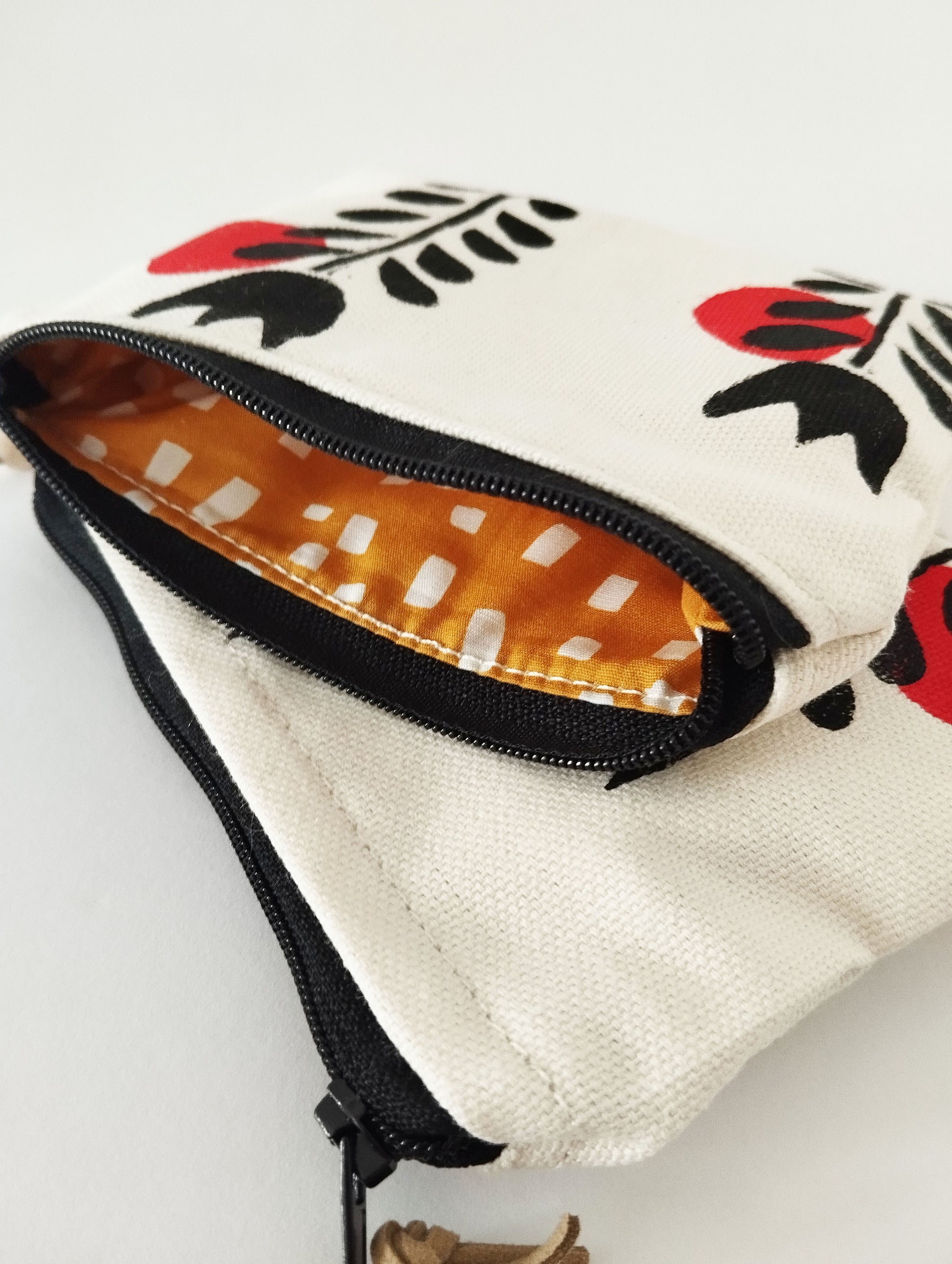 This fabric wallet is made from a beautiful off-white cotton canvas and it is the perfect size to carry the bare necessities like your change, keys, lipstick. The print is entirely made with hand carved original block prints. The colors are vibrant and the colorful zipper makes it even more stunning.